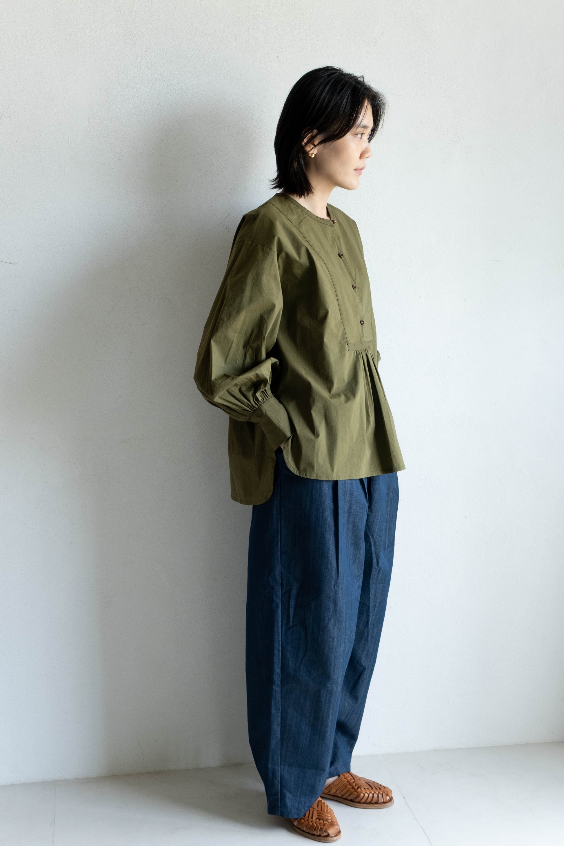 門襟以方形剪接為基礎,搭配精緻的雙層色的鈕扣,七分袖恰好落在手臂線條較細的部位,達到自然修飾效果。下擺採弧形曲線,前短後長的比例讓整體線條顯得更輕盈有層次。