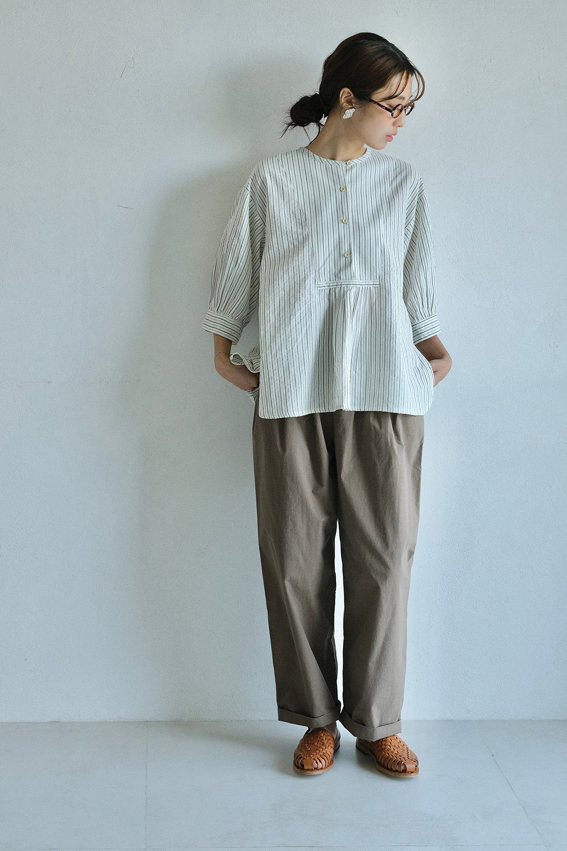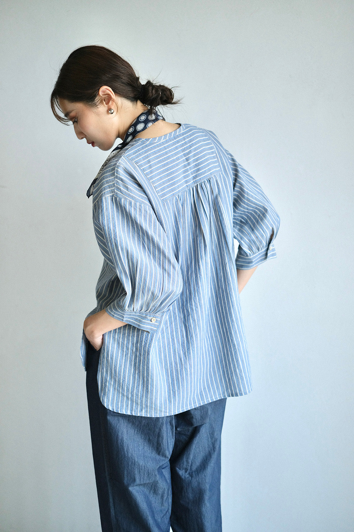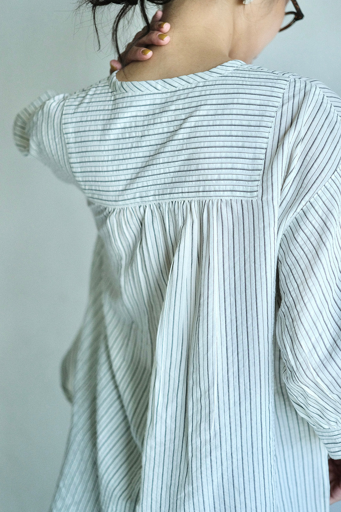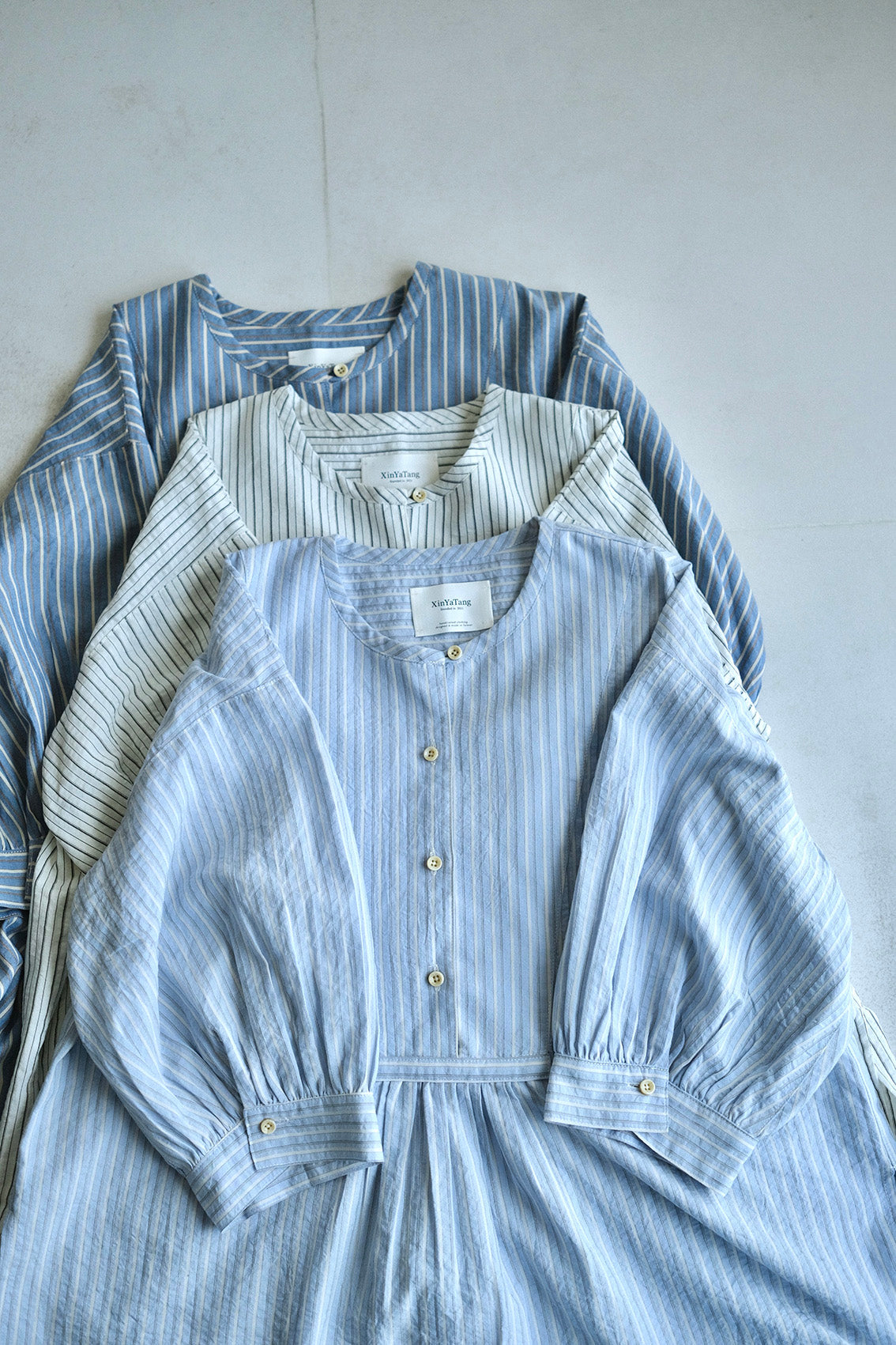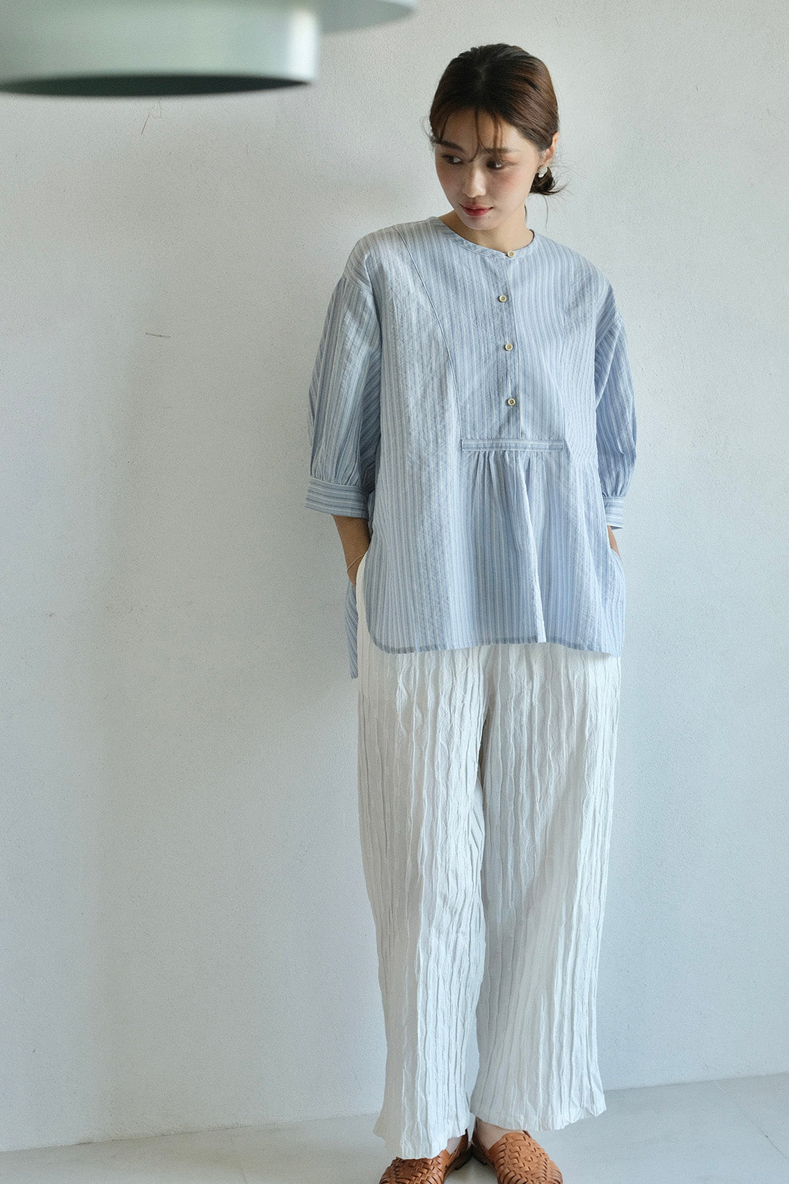 這款條紋面料為純棉混紡,具備抗皺、輕薄透氣的特性,平時洗滌或帶出門摺疊收納都相當方便,不需特別整燙,也能維持衣服的俐落感。