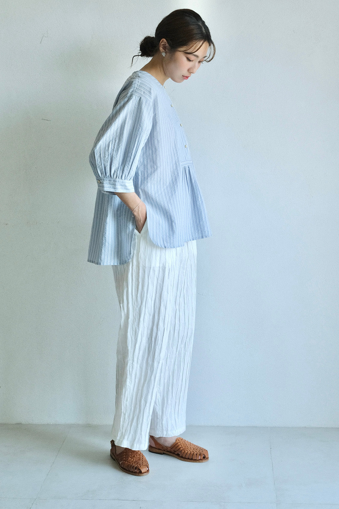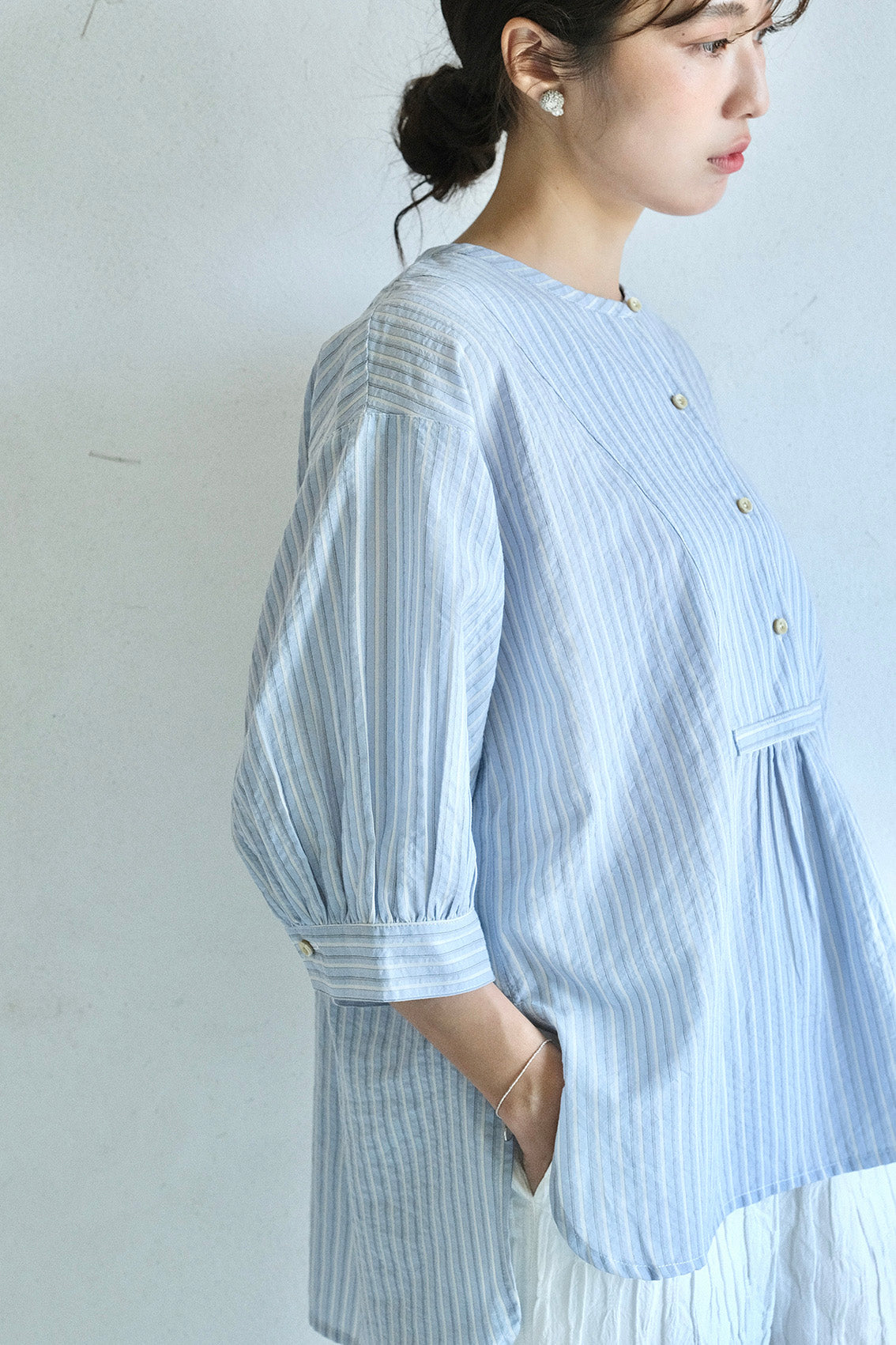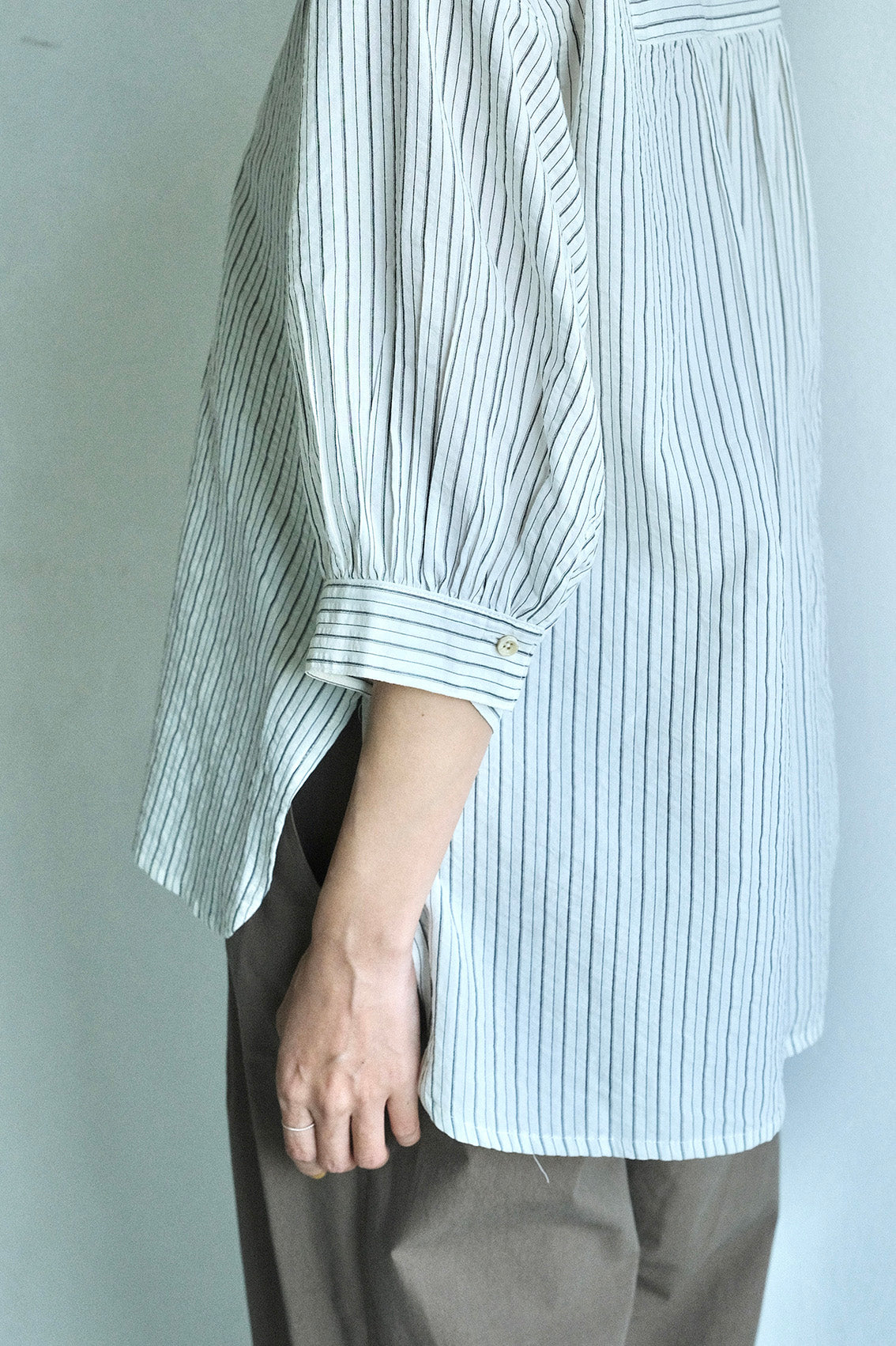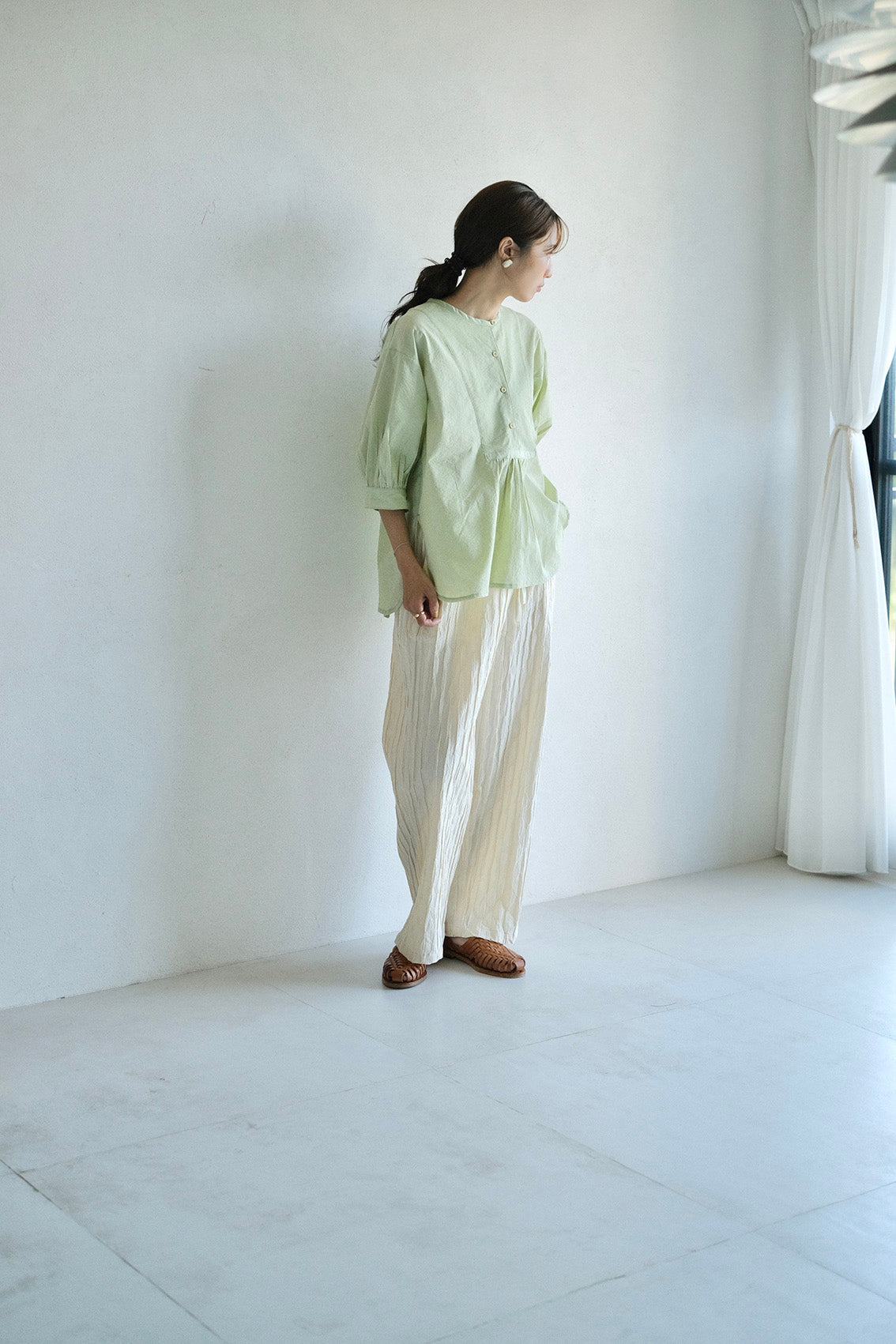 這款條紋面料為純棉混紡,具備抗皺、輕薄透氣的特性,平時洗滌或帶出門摺疊收納都相當方便,不需特別整燙,也能維持衣服的俐落感。