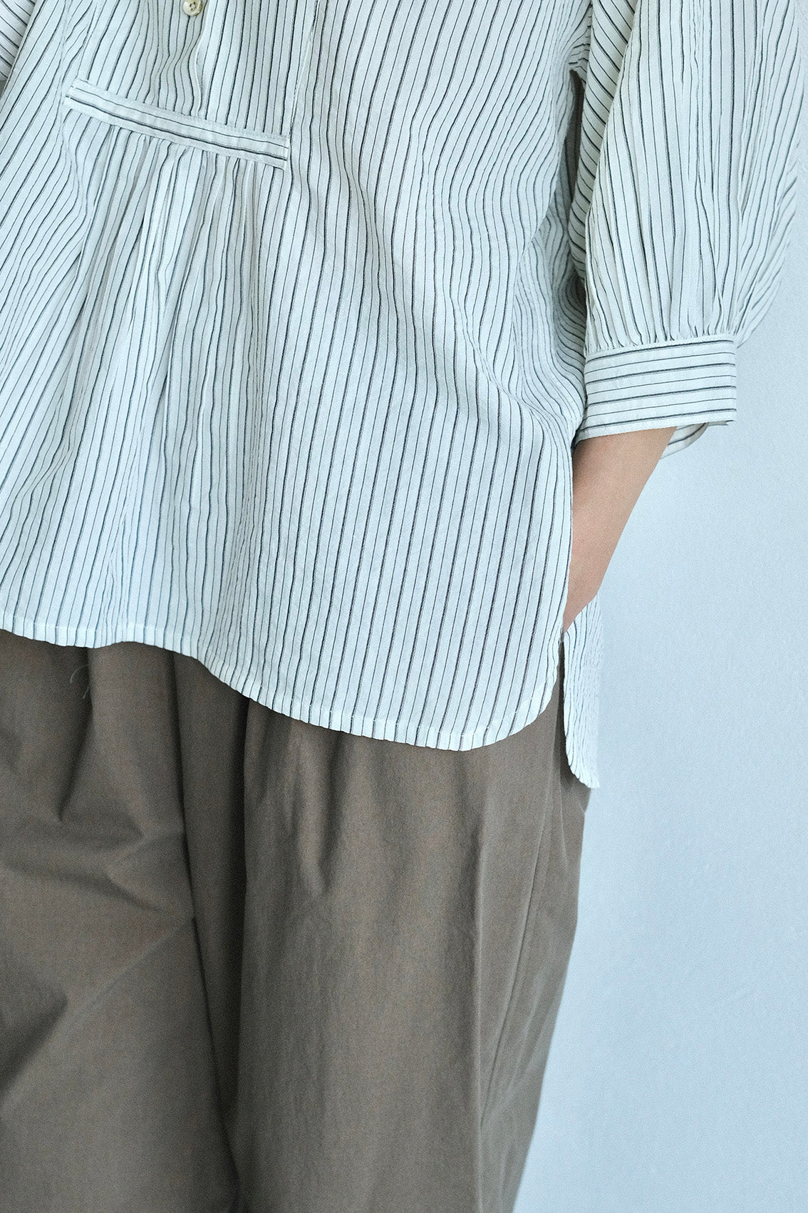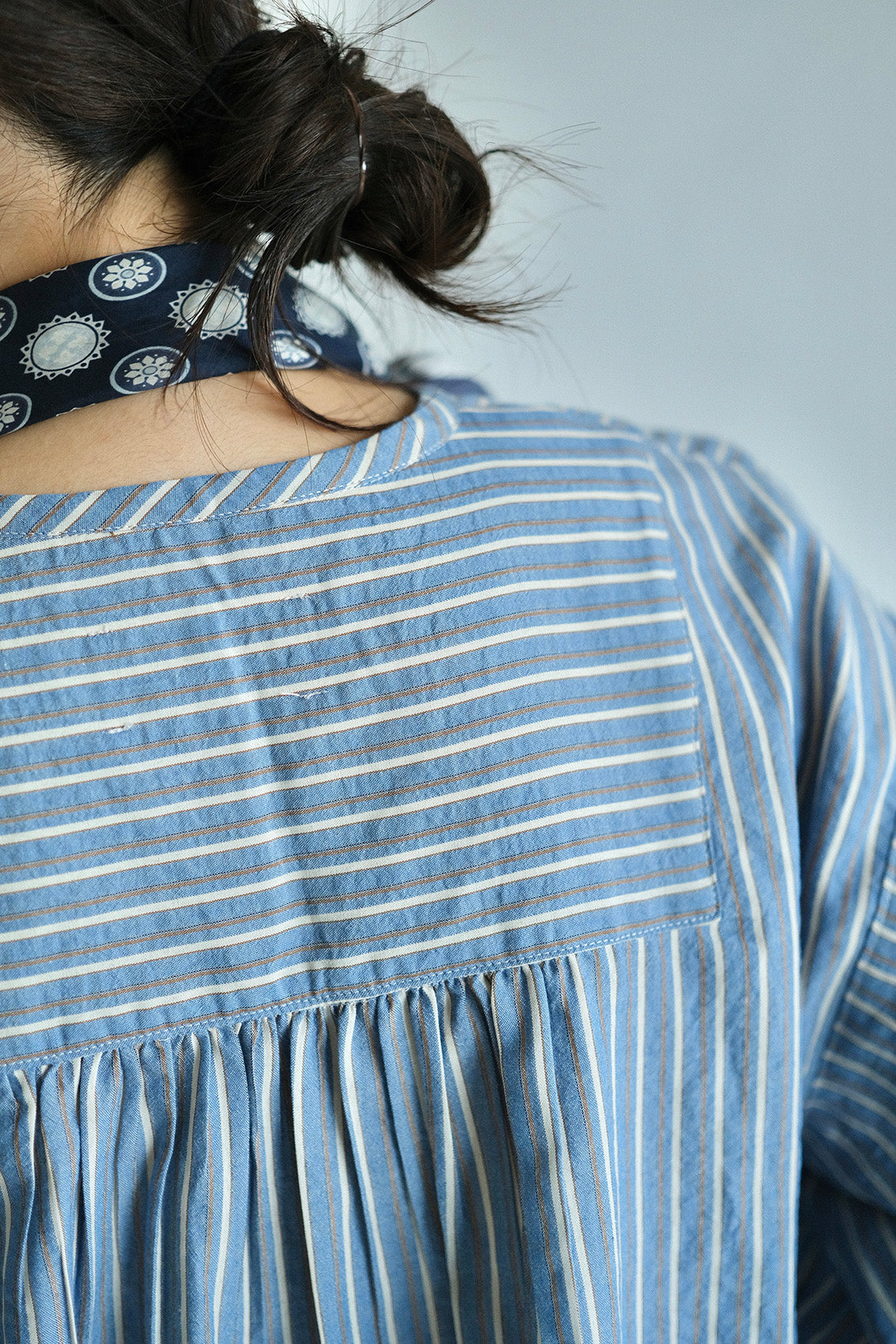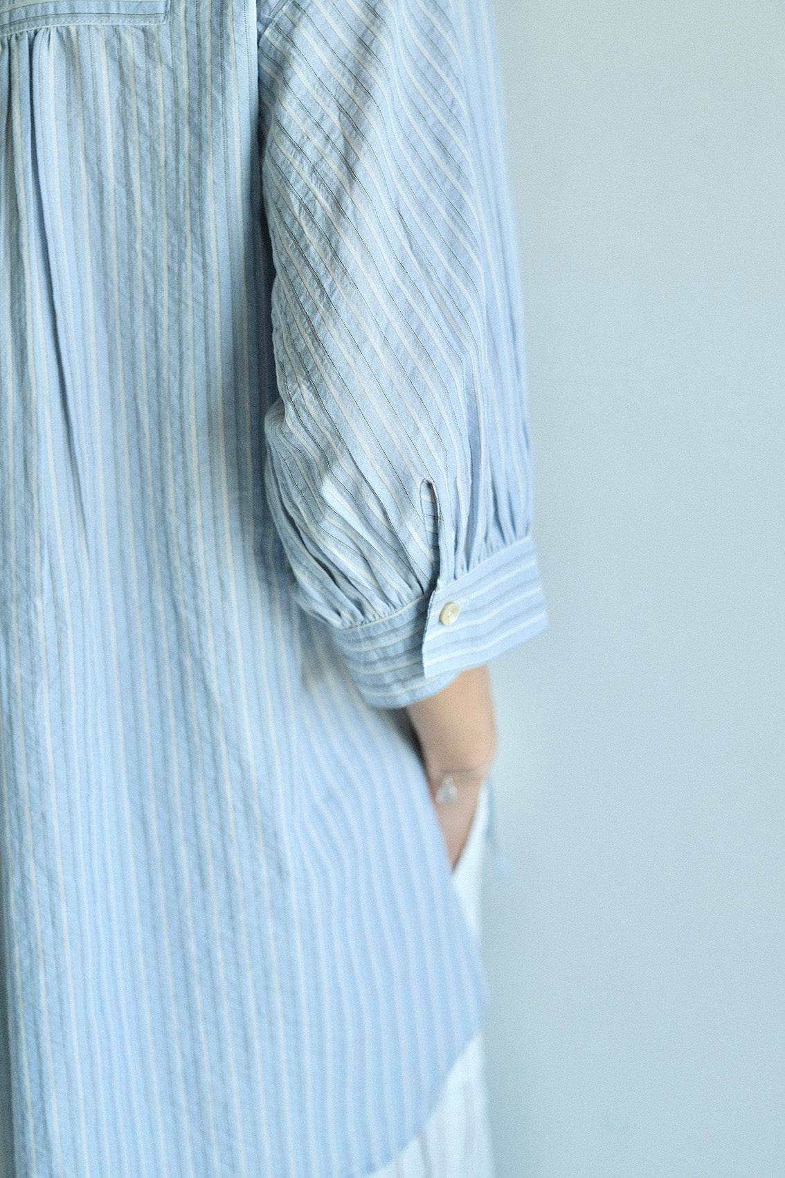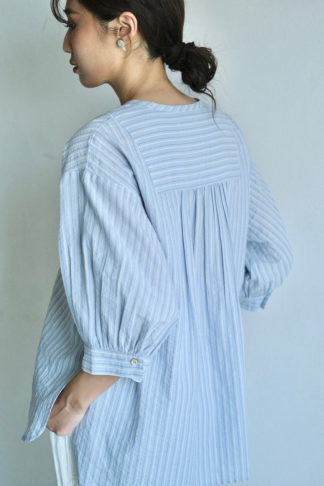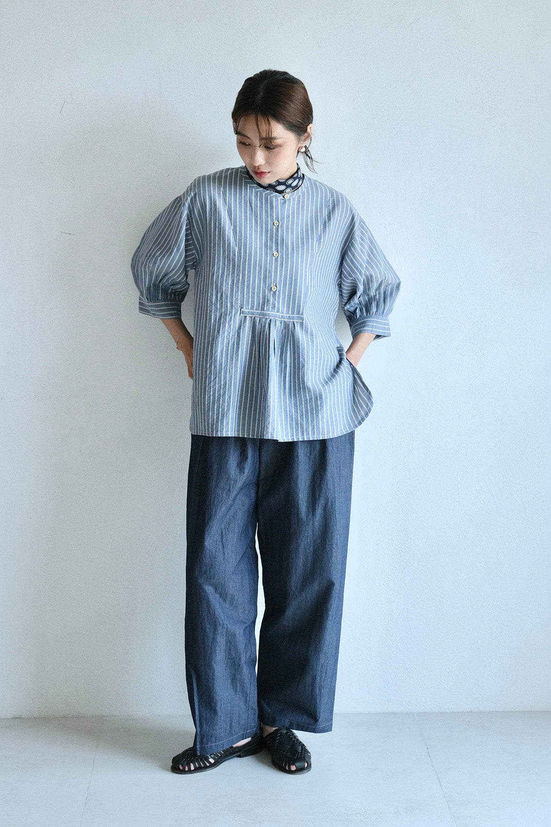 這款條紋面料為純棉混紡,具備抗皺、輕薄透氣的特性,平時洗滌或帶出門摺疊收納都相當方便,不需特別整燙,也能維持衣服的俐落感。