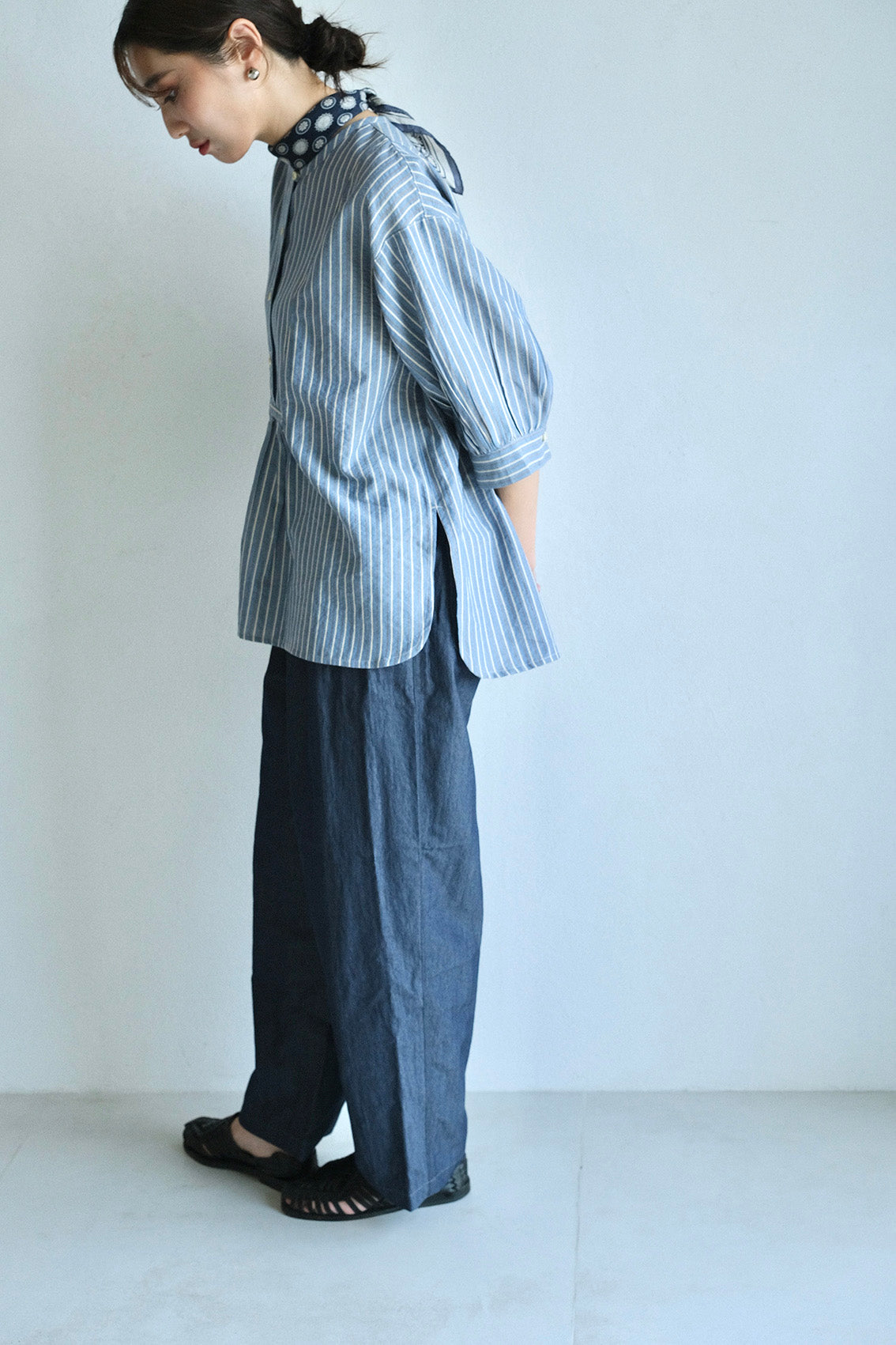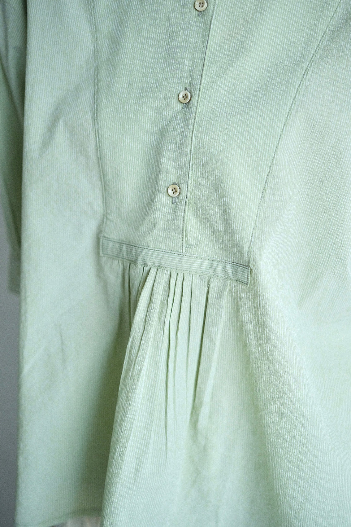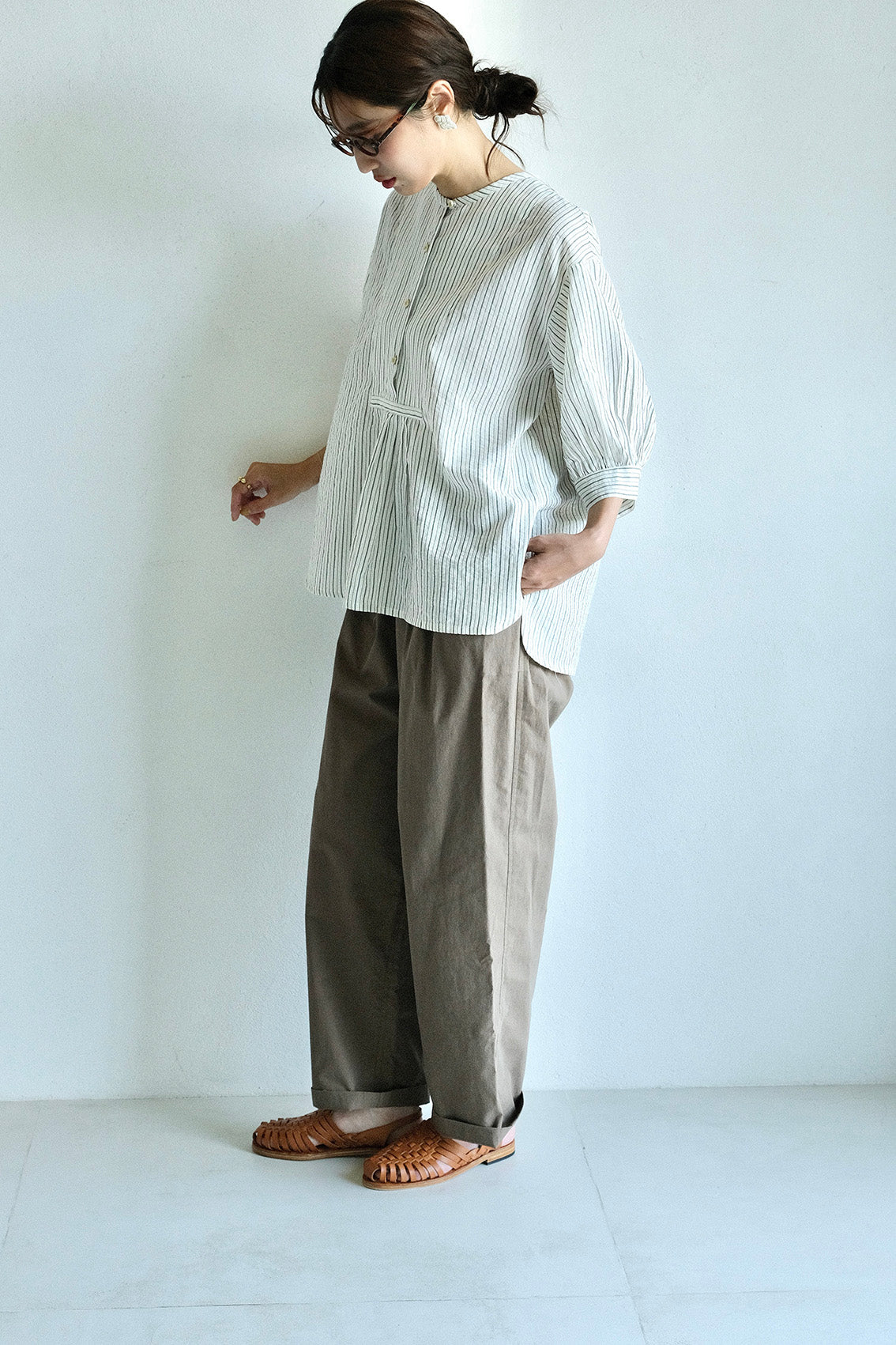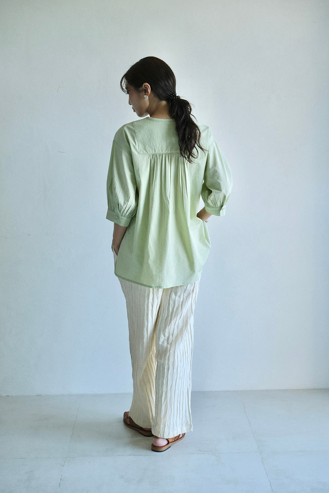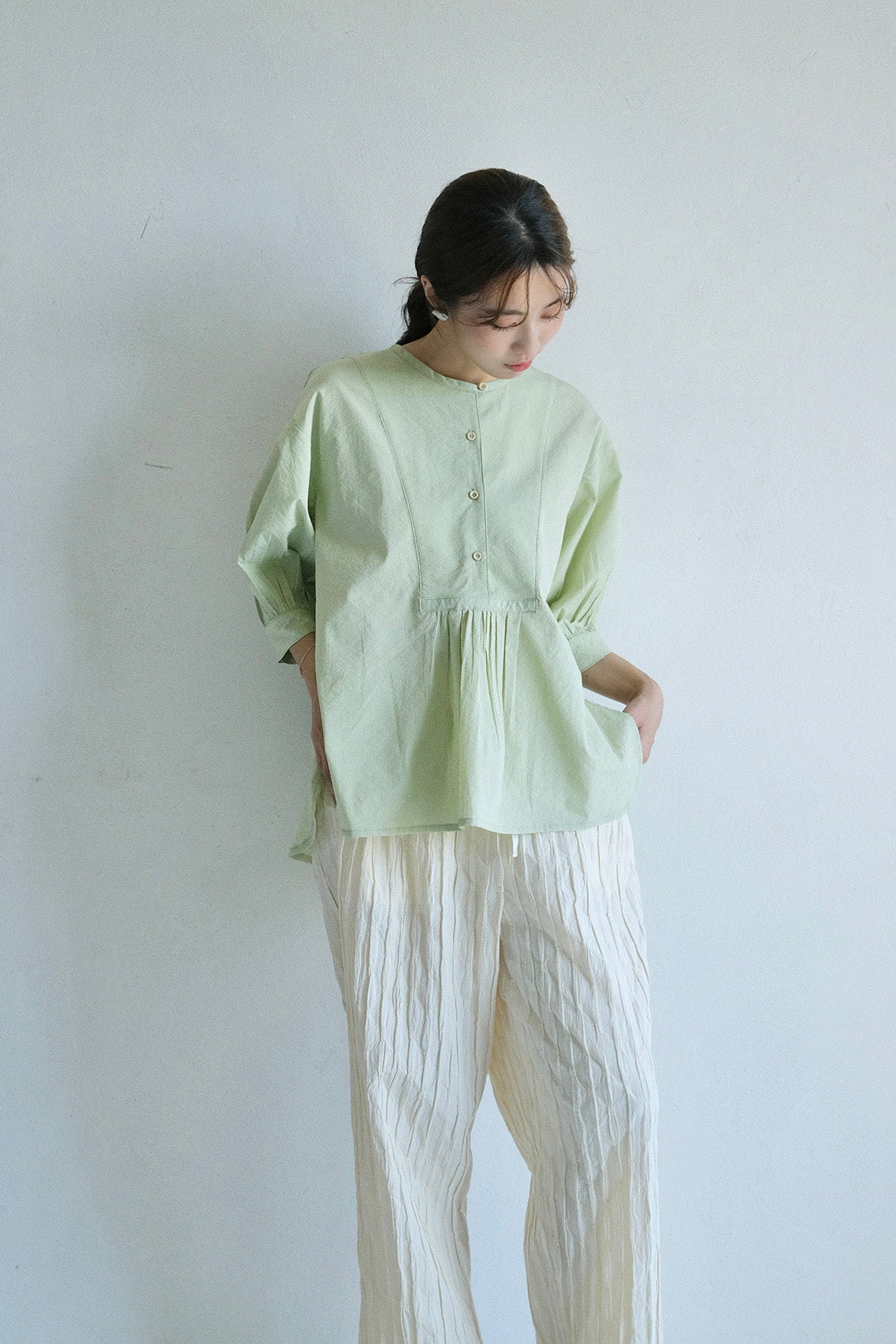 這款條紋面料為純棉混紡,具備抗皺、輕薄透氣的特性,平時洗滌或帶出門摺疊收納都相當方便,不需特別整燙,也能維持衣服的俐落感。