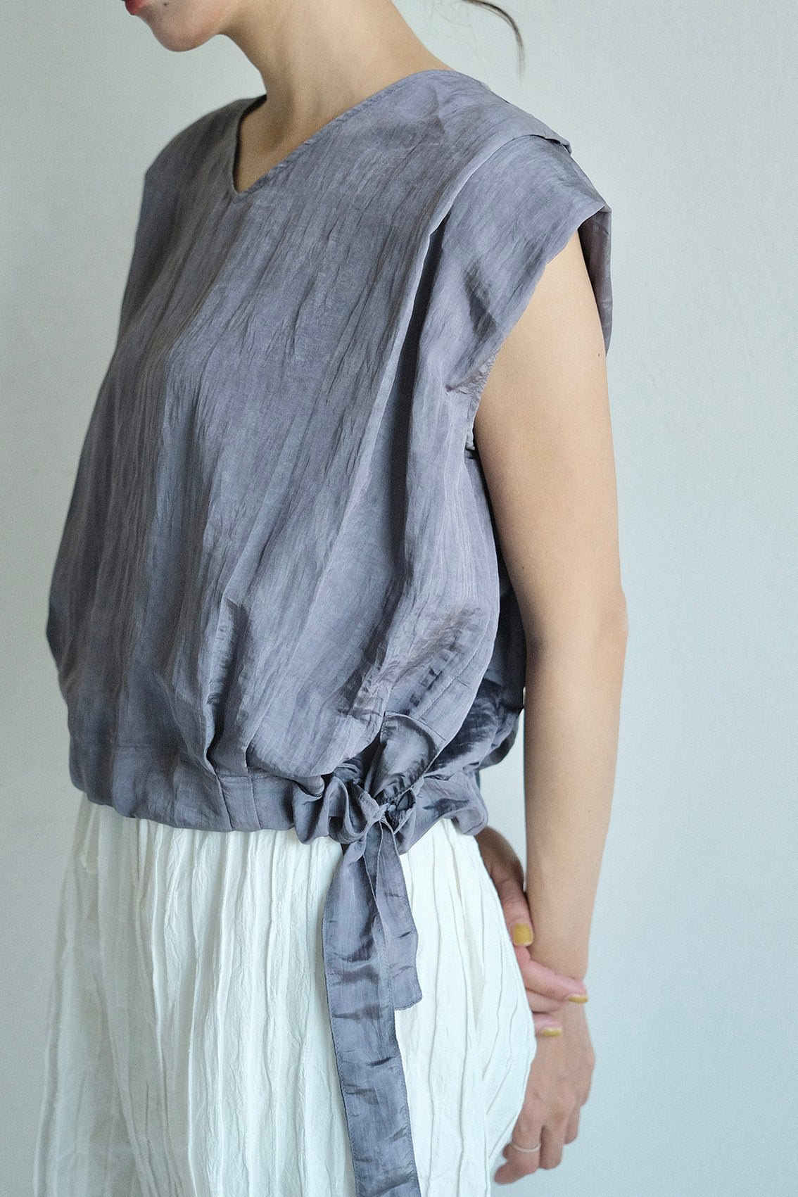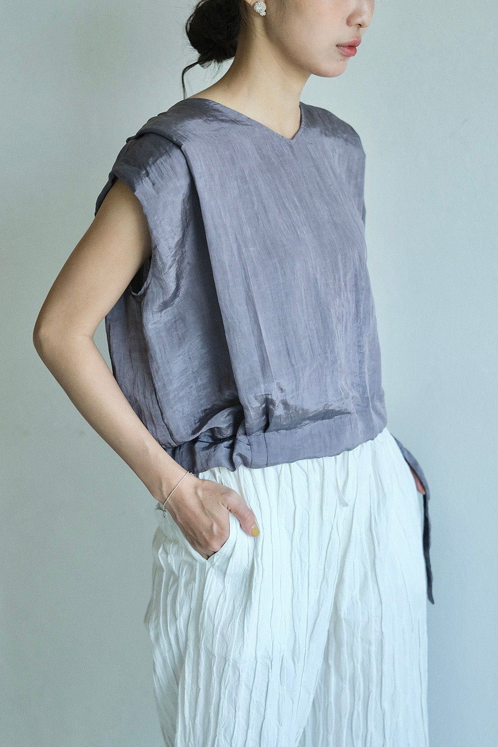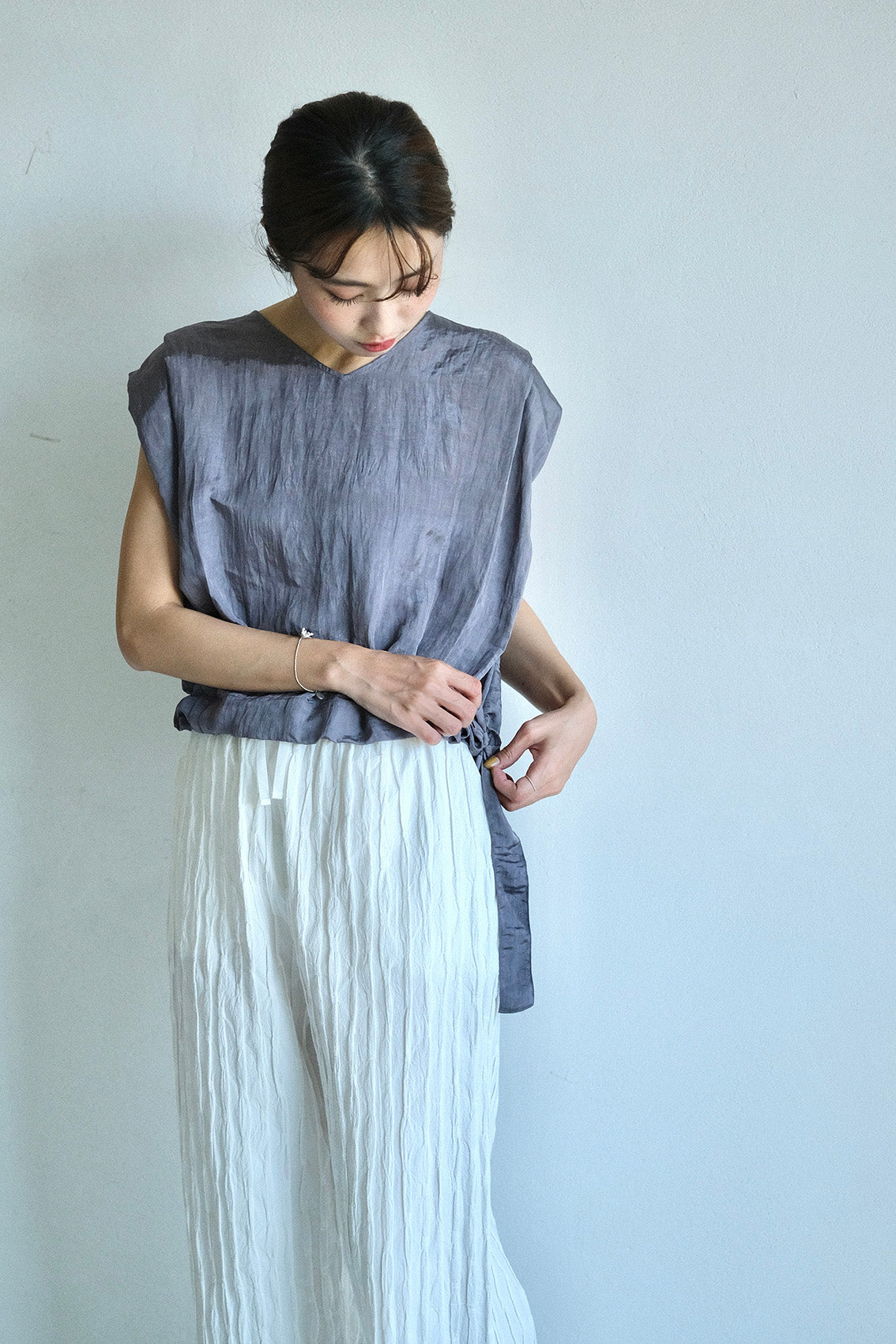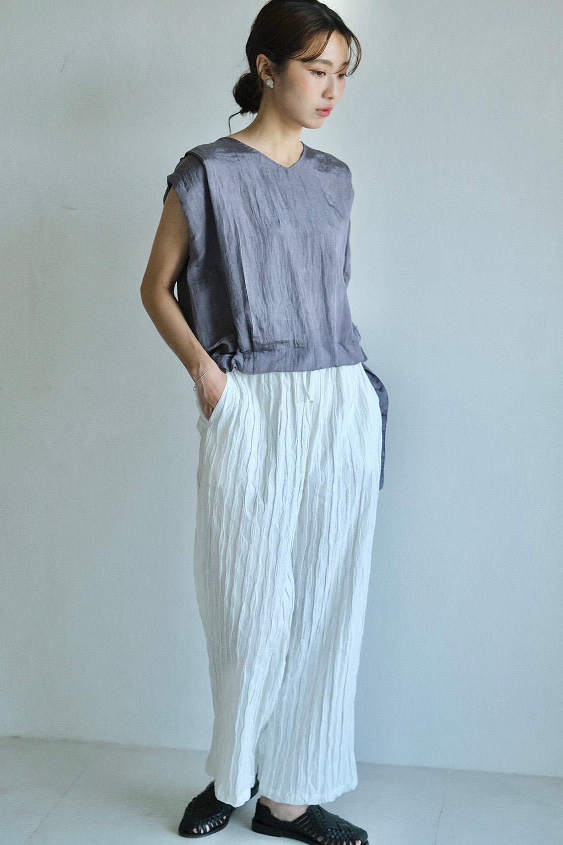 使用帶有自然皺褶與微光澤感的輕薄化纖布料,輕盈不厚重、不易皺也好整理,是兼具實穿與質感的選擇。