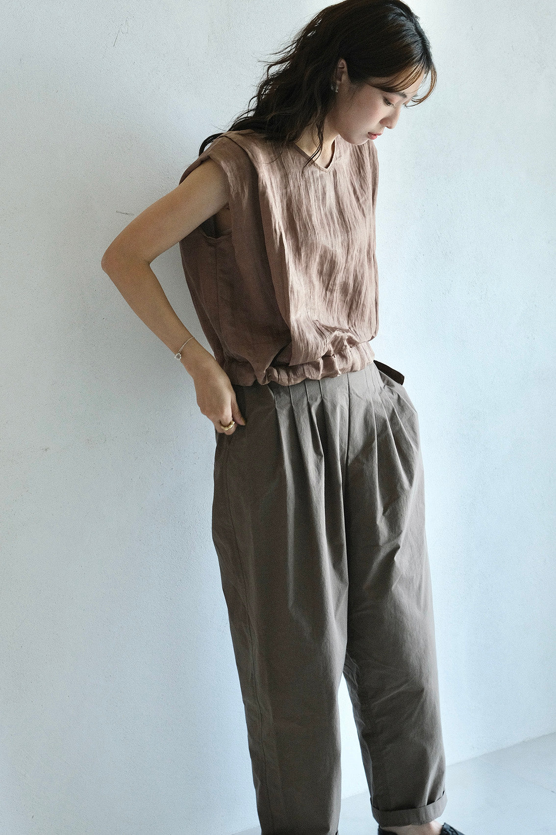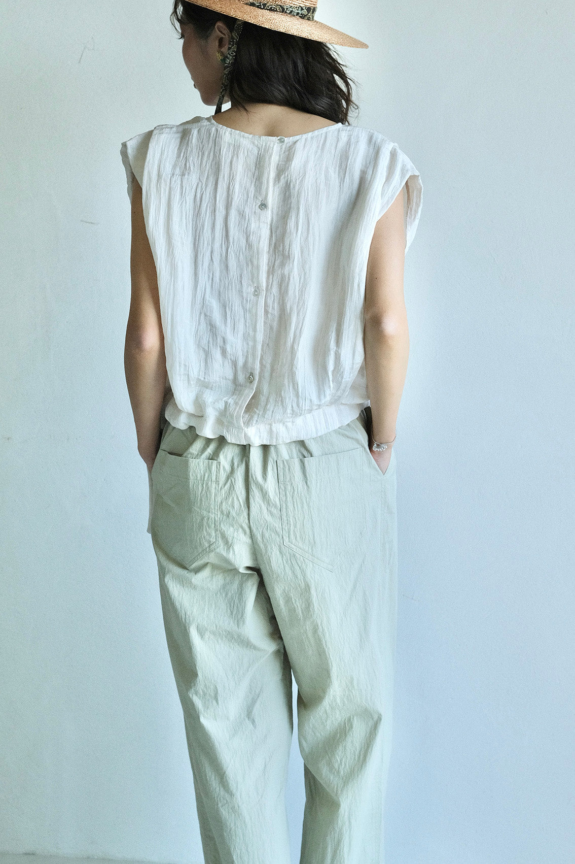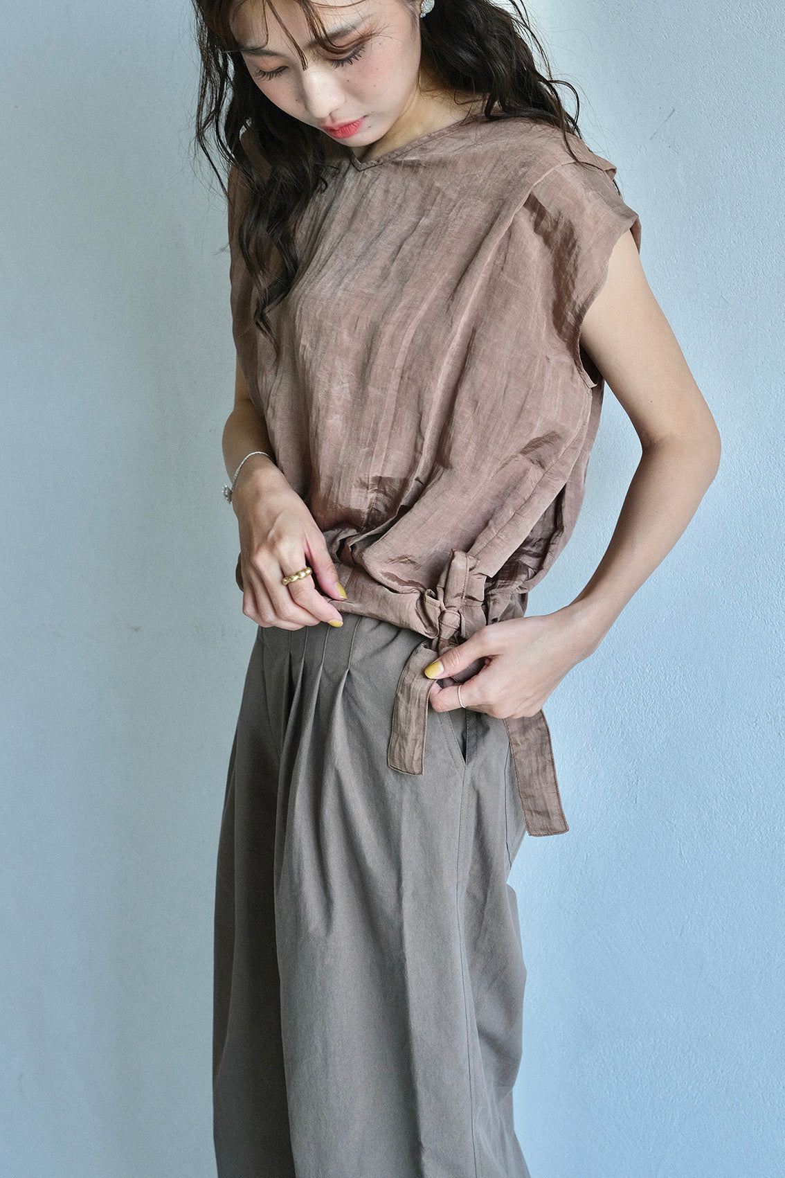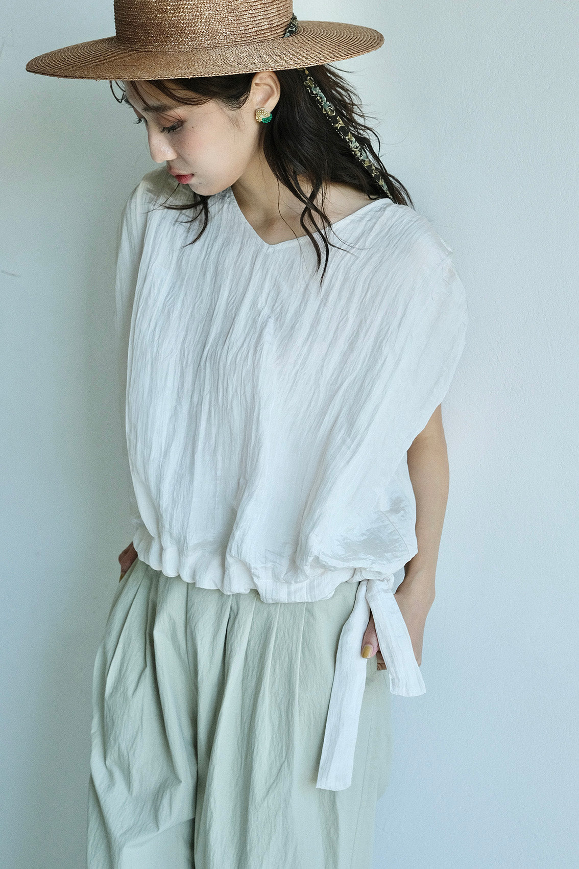 使用帶有自然皺褶與微光澤感的輕薄化纖布料,輕盈不厚重、不易皺也好整理,是兼具實穿與質感的選擇。