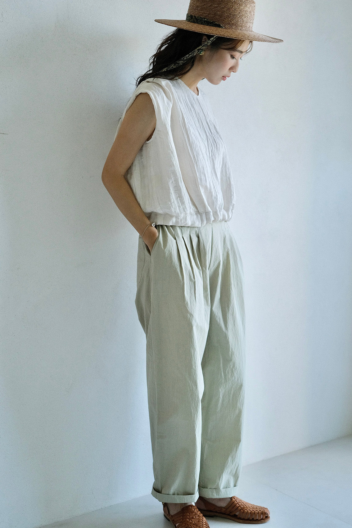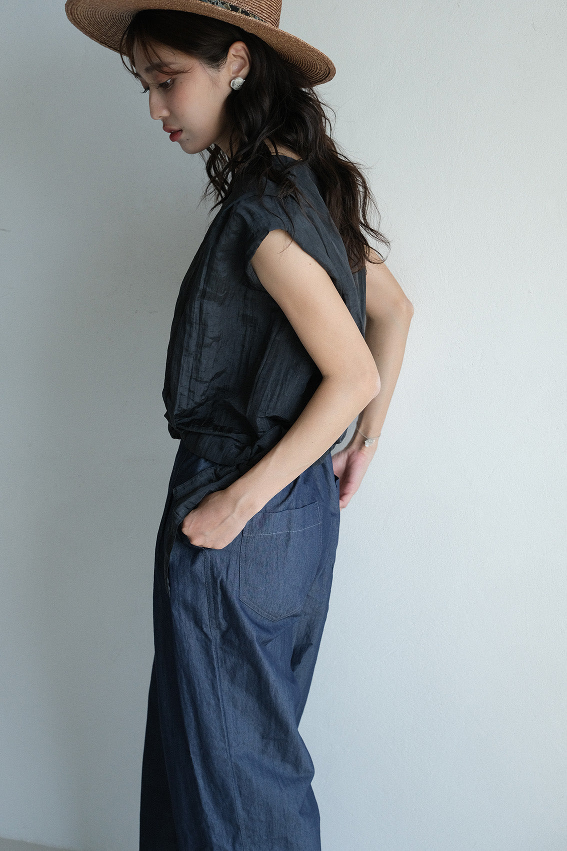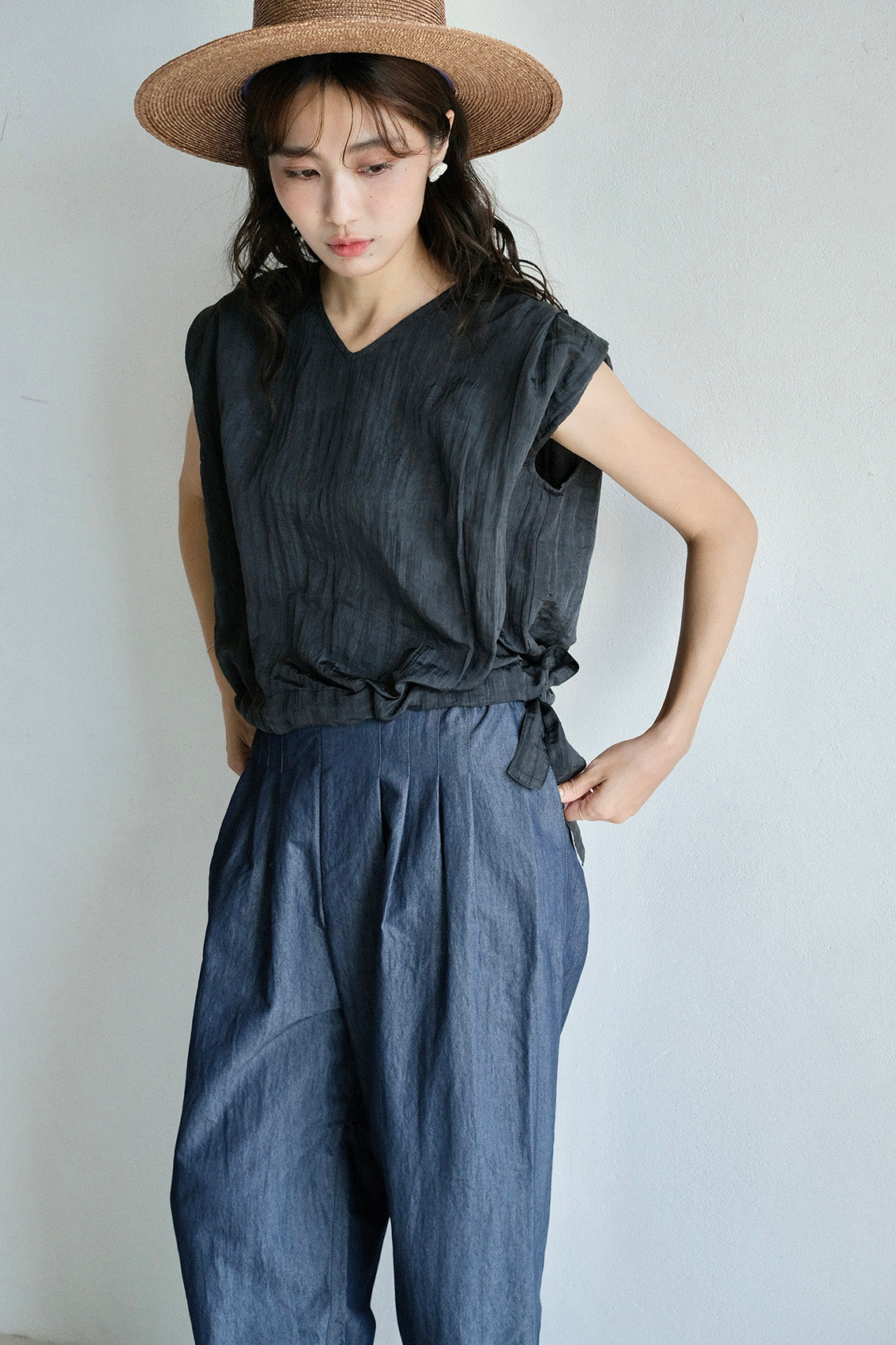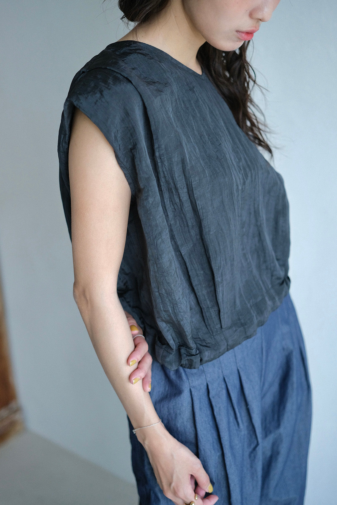 使用帶有自然皺褶與微光澤感的輕薄化纖布料,輕盈不厚重、不易皺也好整理,是兼具實穿與質感的選擇。