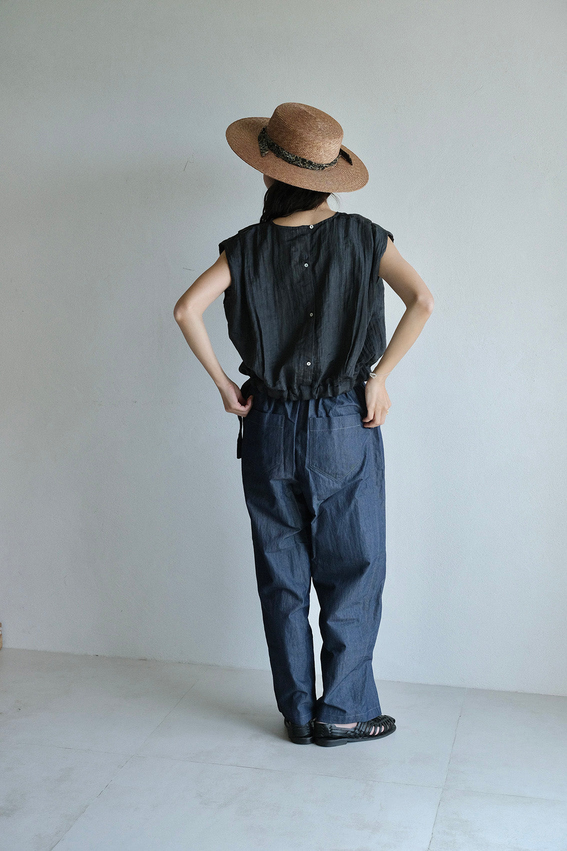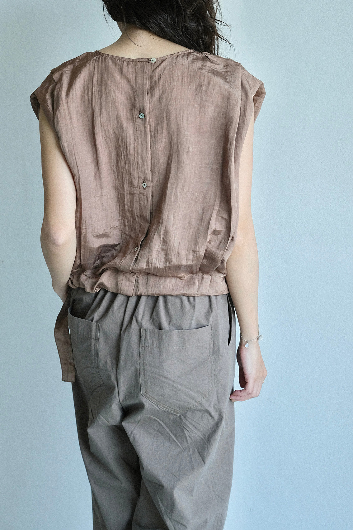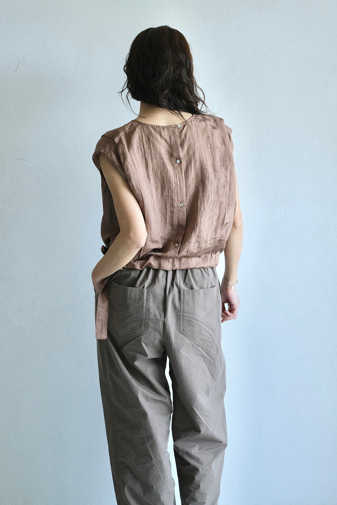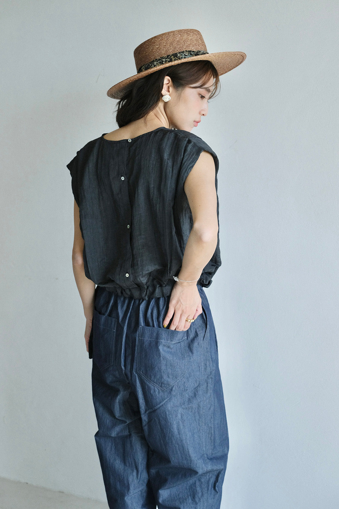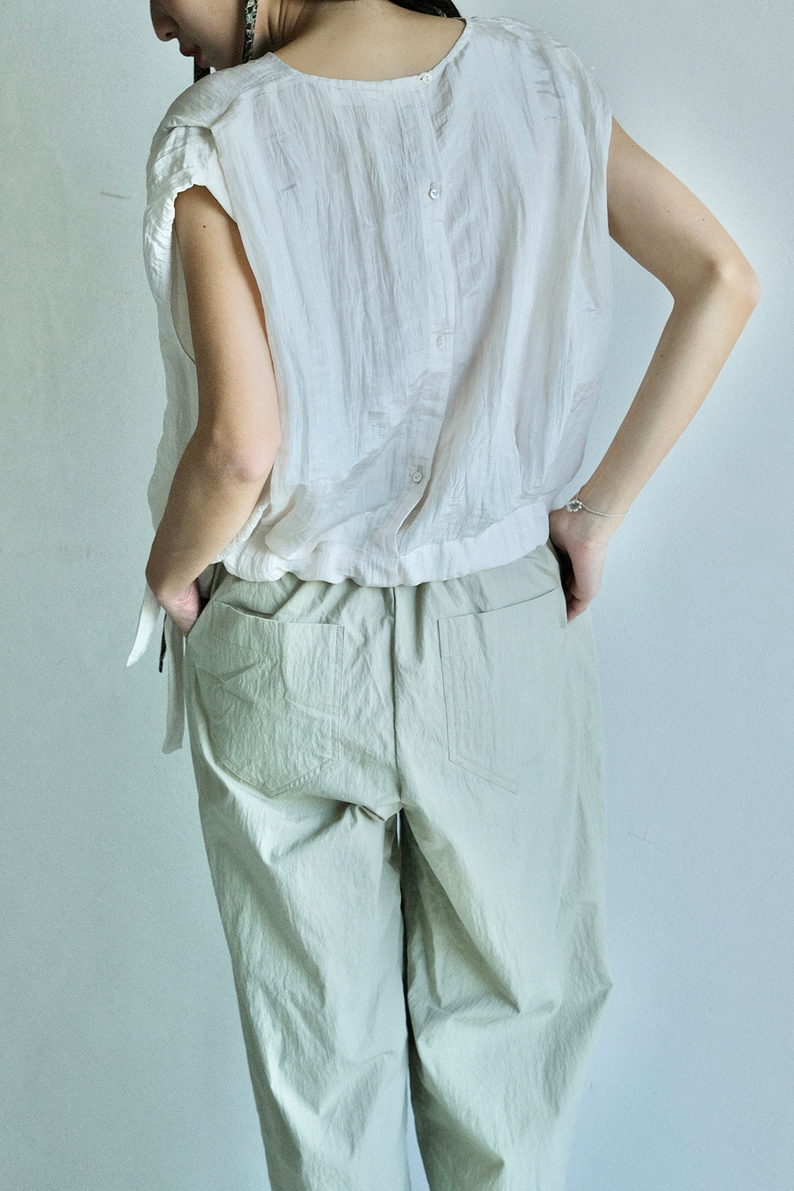 落肩包袖自然修飾手臂線條,肩膀處的活摺設計讓整體更有精神;下擺抽繩可依個人喜好自由調整輪廓。背面門襟選用天然貝殼釦,替簡約設計增添一點細膩的表情。