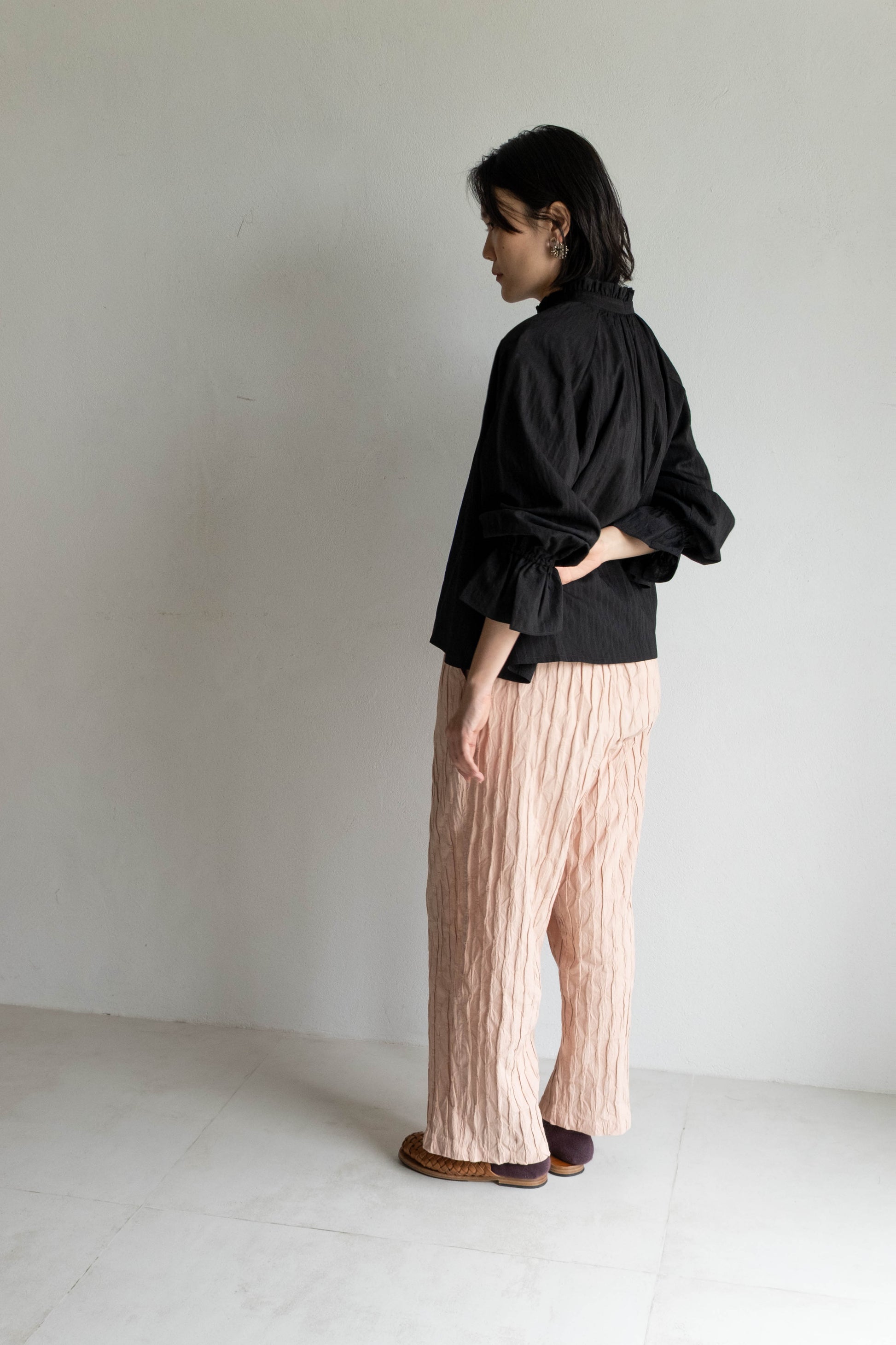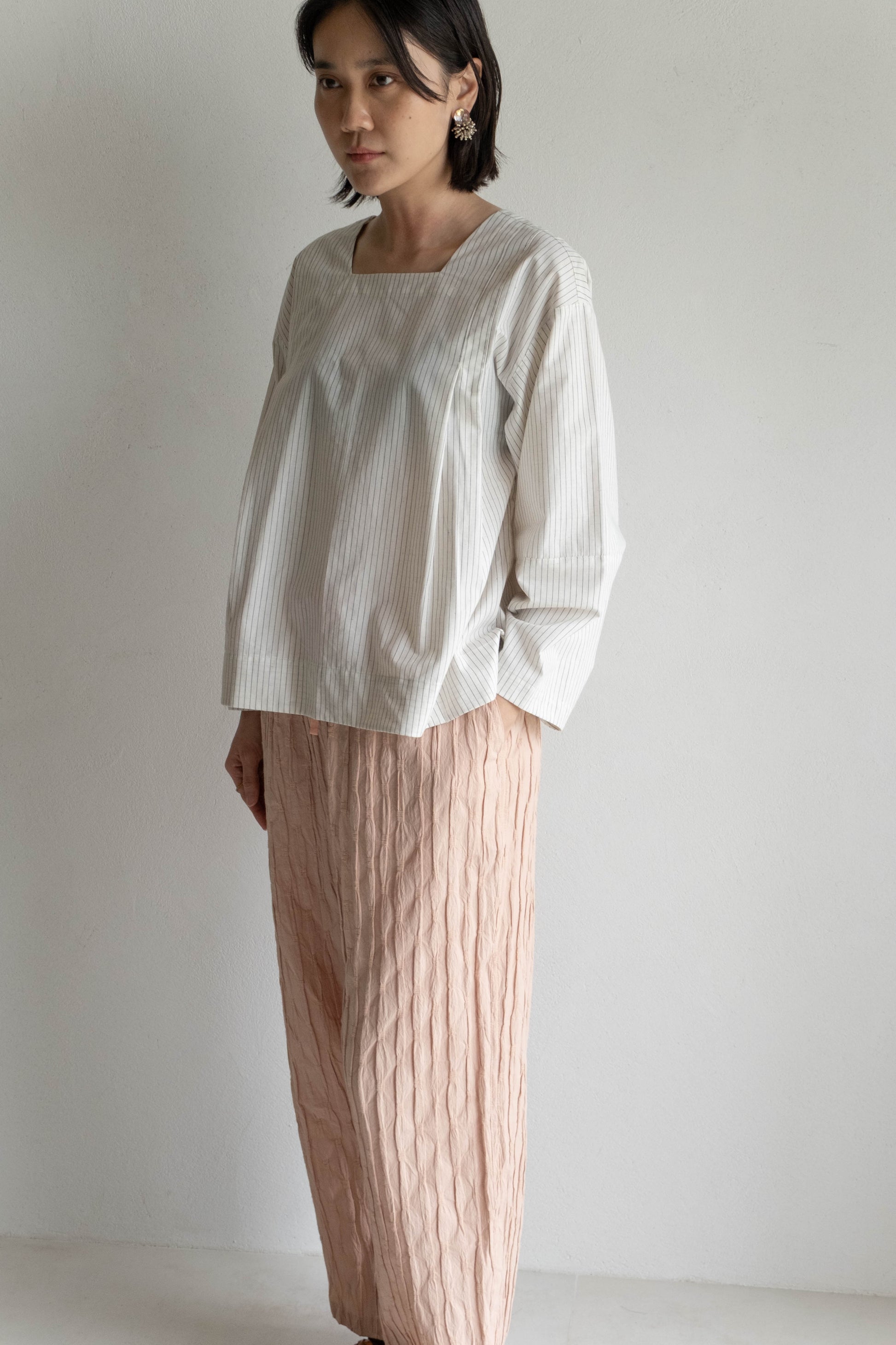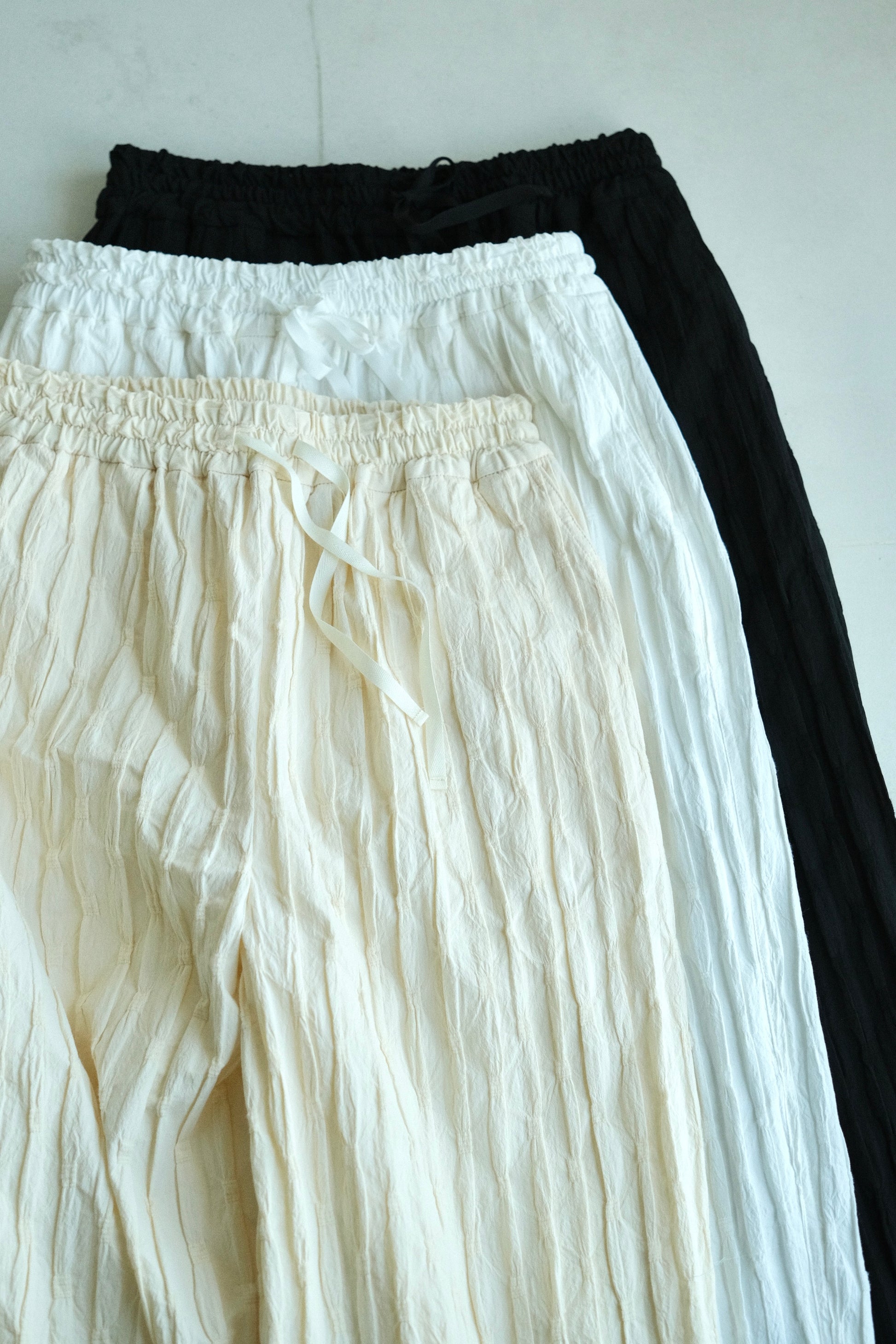 這款版型略為寬鬆的直筒褲,使用這次在韓國一眼就相中的布料,布面本身帶有抓摺紋理,細節豐富又帶點俏皮感。選擇將它製作成褲子後,就算搭配簡單的上衣,也能讓整體造型多一份個性與層次。