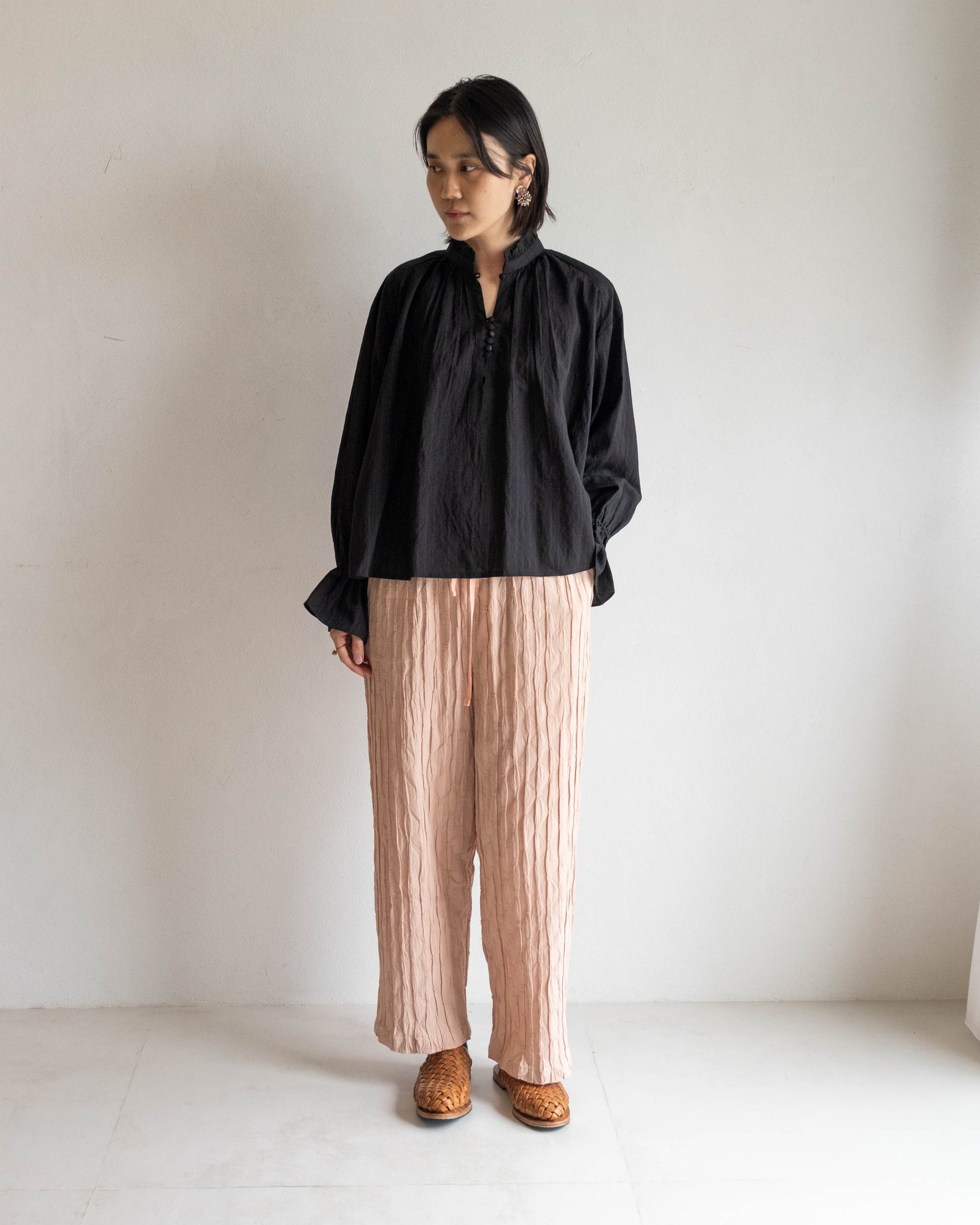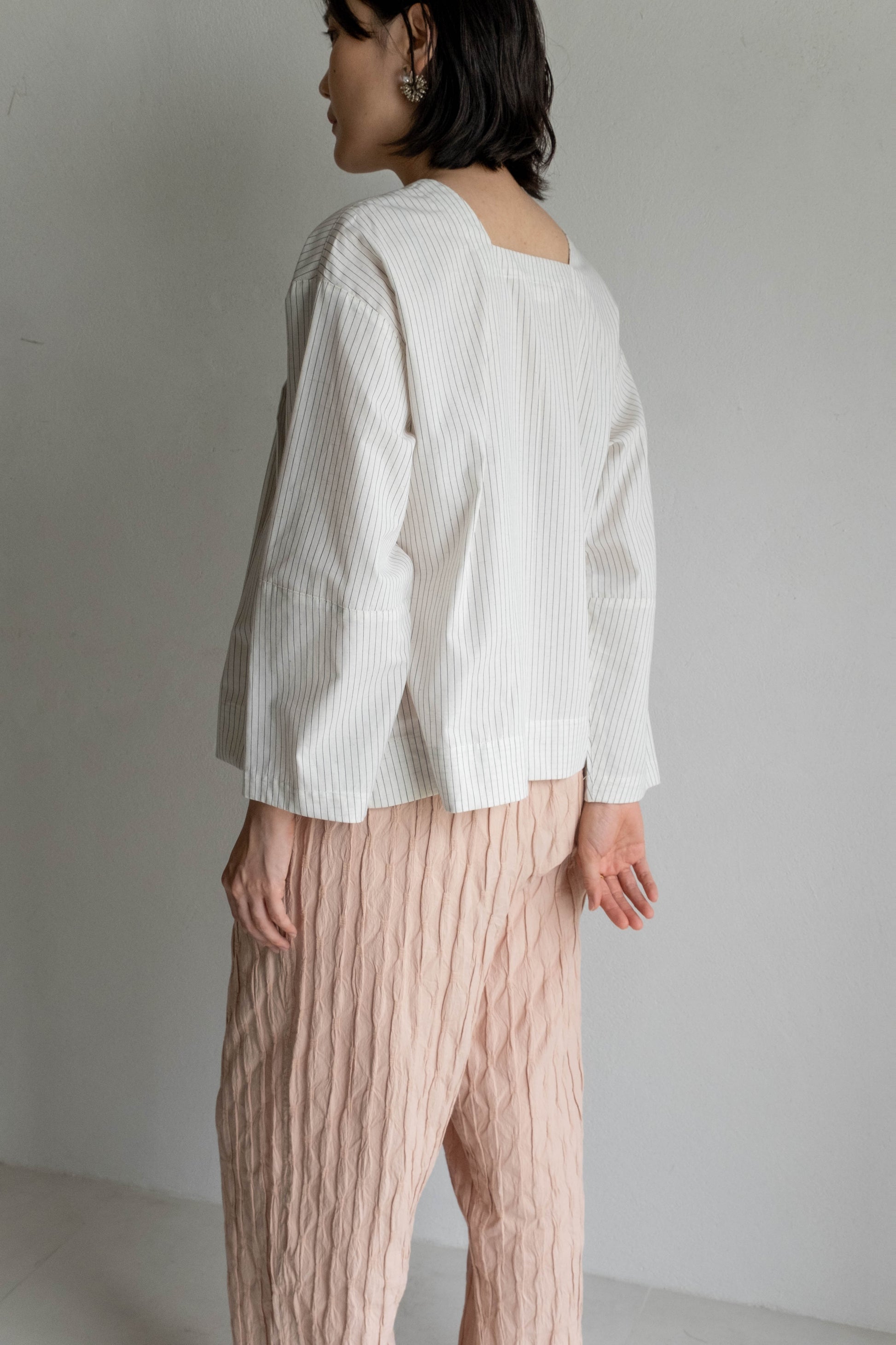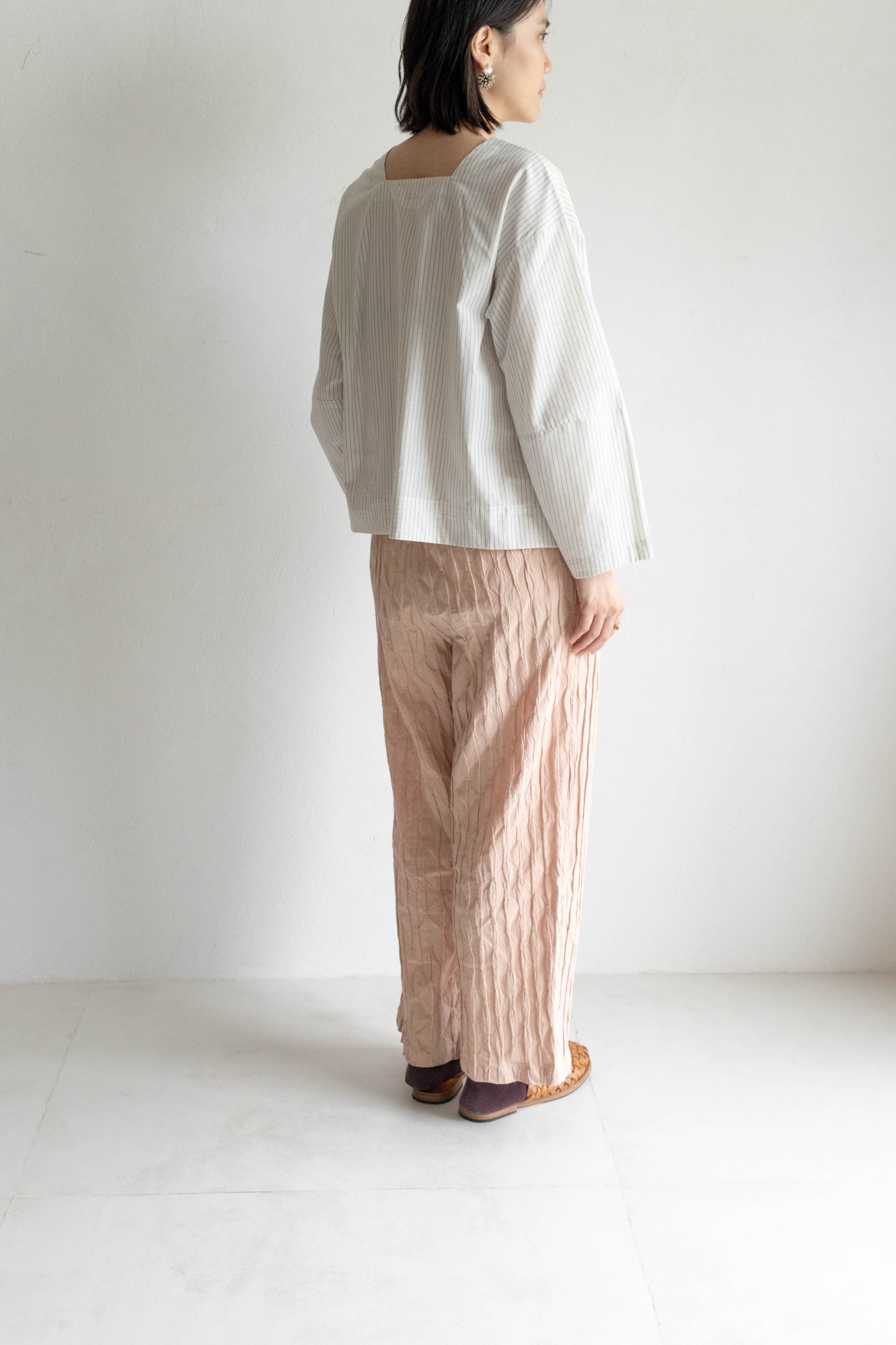 這款版型略為寬鬆的直筒褲,使用這次在韓國一眼就相中的布料,布面本身帶有抓摺紋理,細節豐富又帶點俏皮感。選擇將它製作成褲子後,就算搭配簡單的上衣,也能讓整體造型多一份個性與層次。