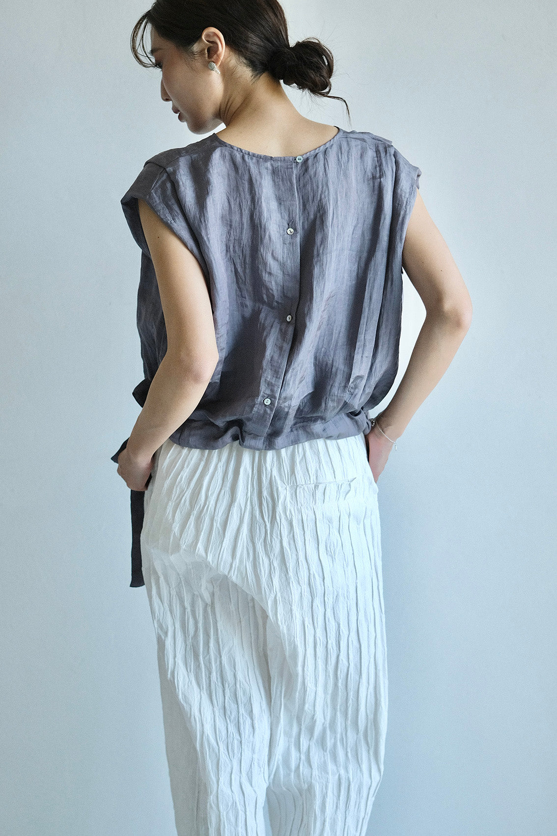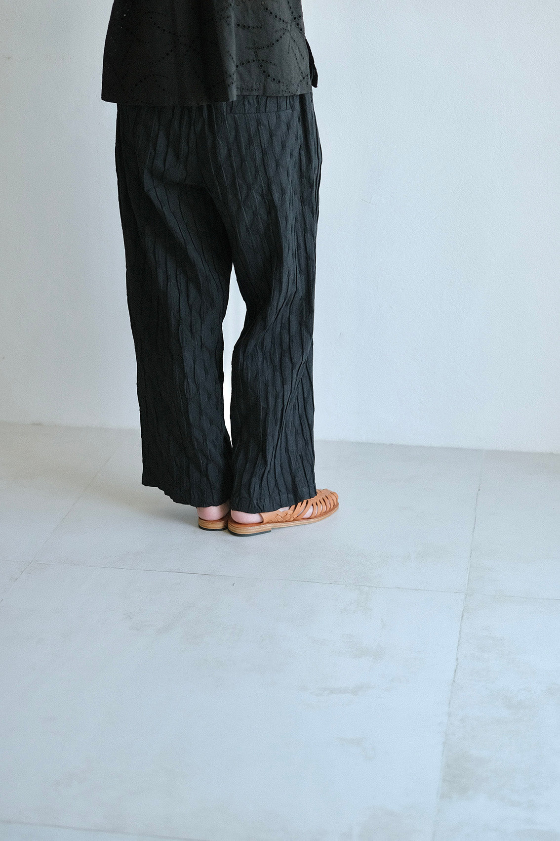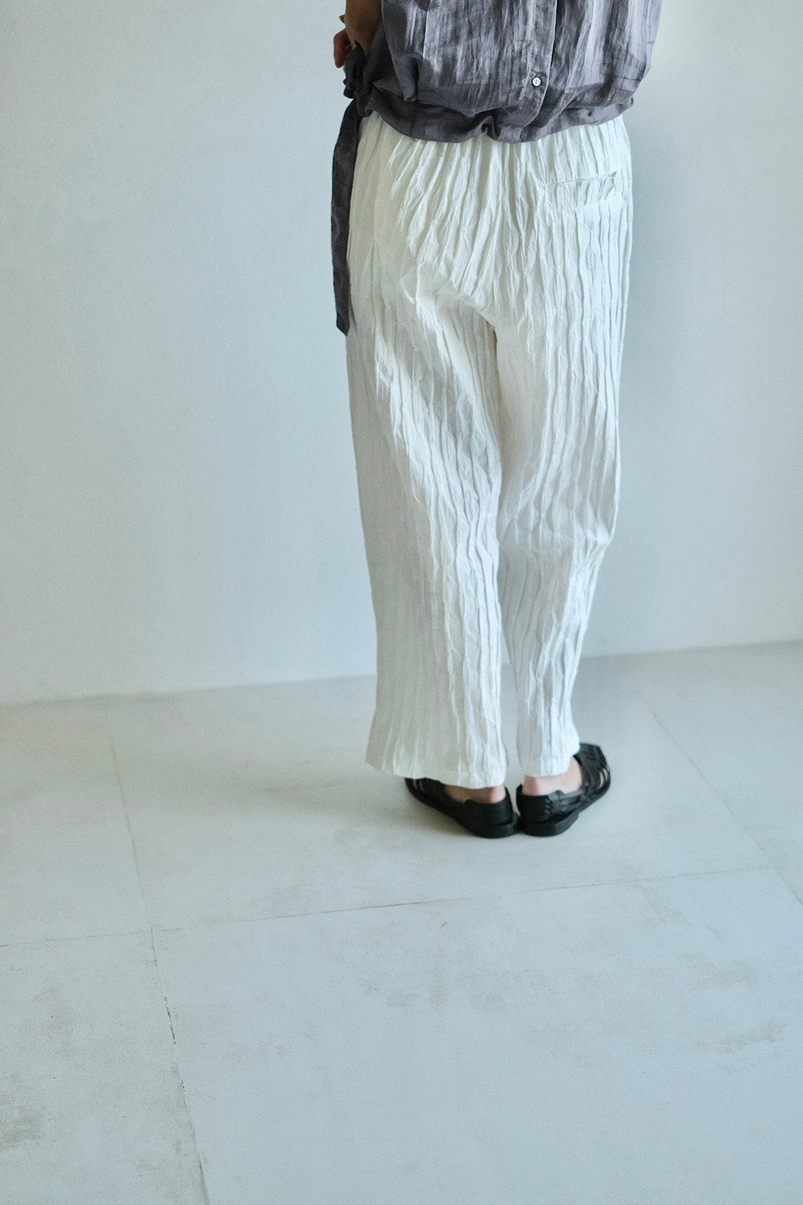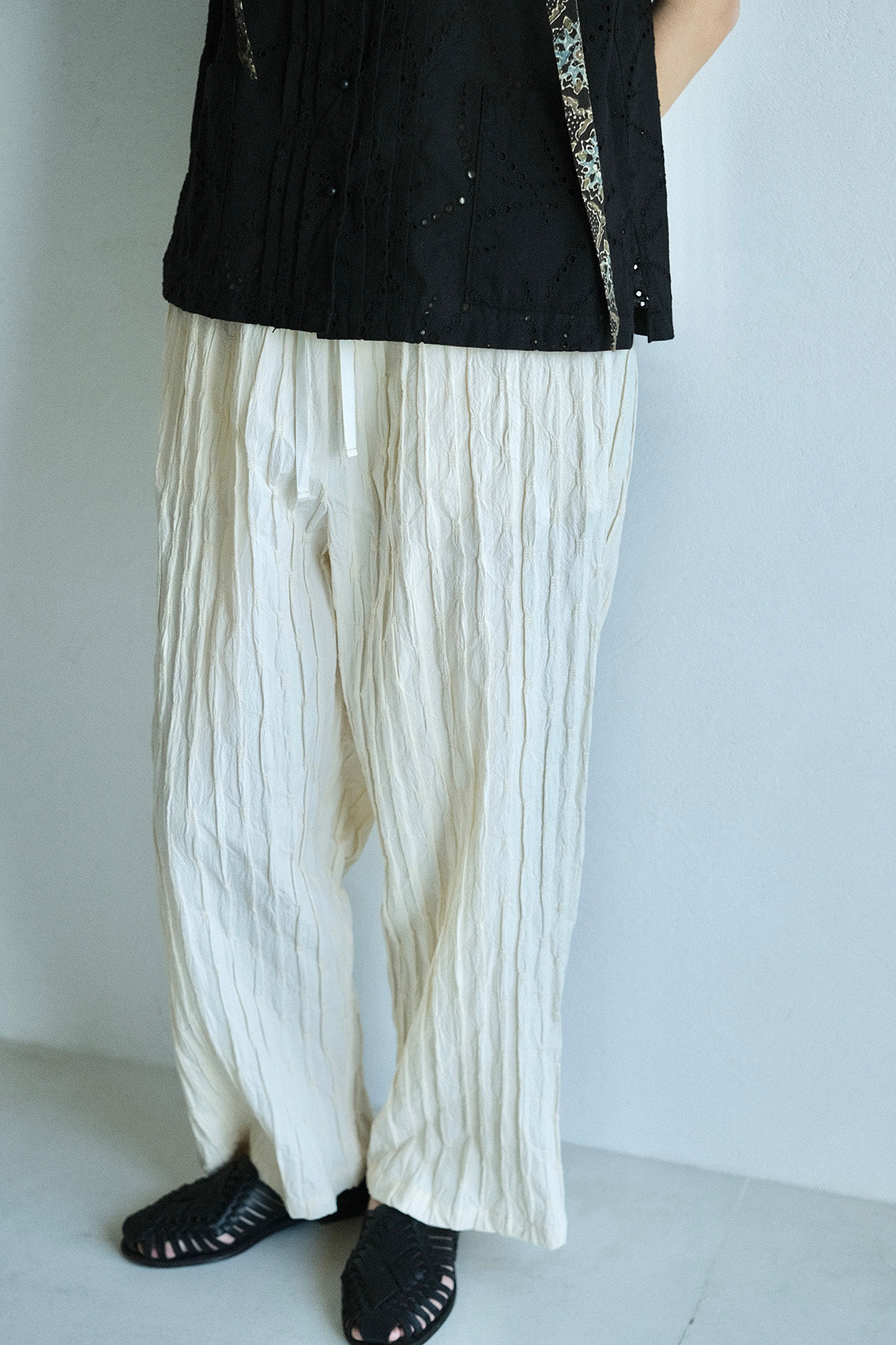 這款版型略為寬鬆的直筒褲,使用這次在韓國一眼就相中的布料,布面本身帶有抓摺紋理,細節豐富又帶點俏皮感。選擇將它製作成褲子後,就算搭配簡單的上衣,也能讓整體造型多一份個性與層次。