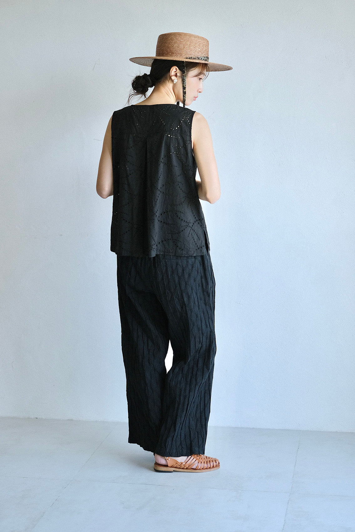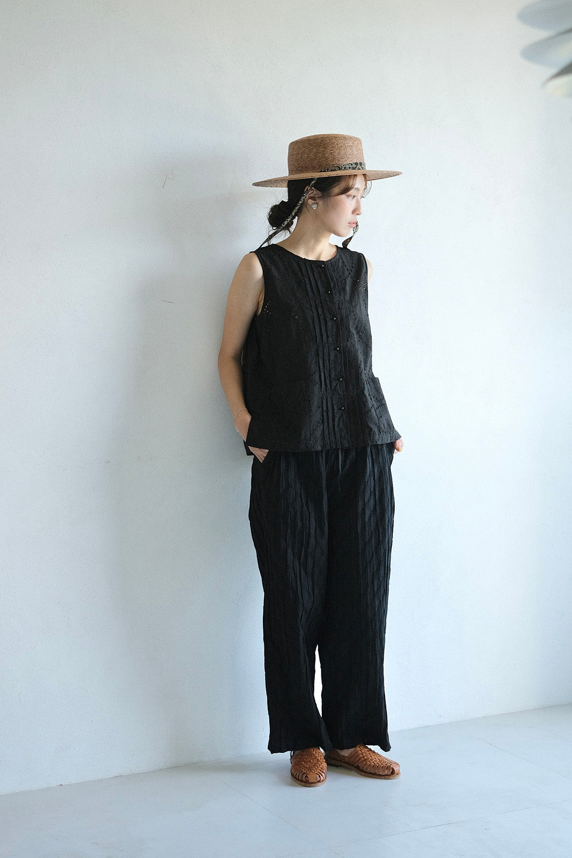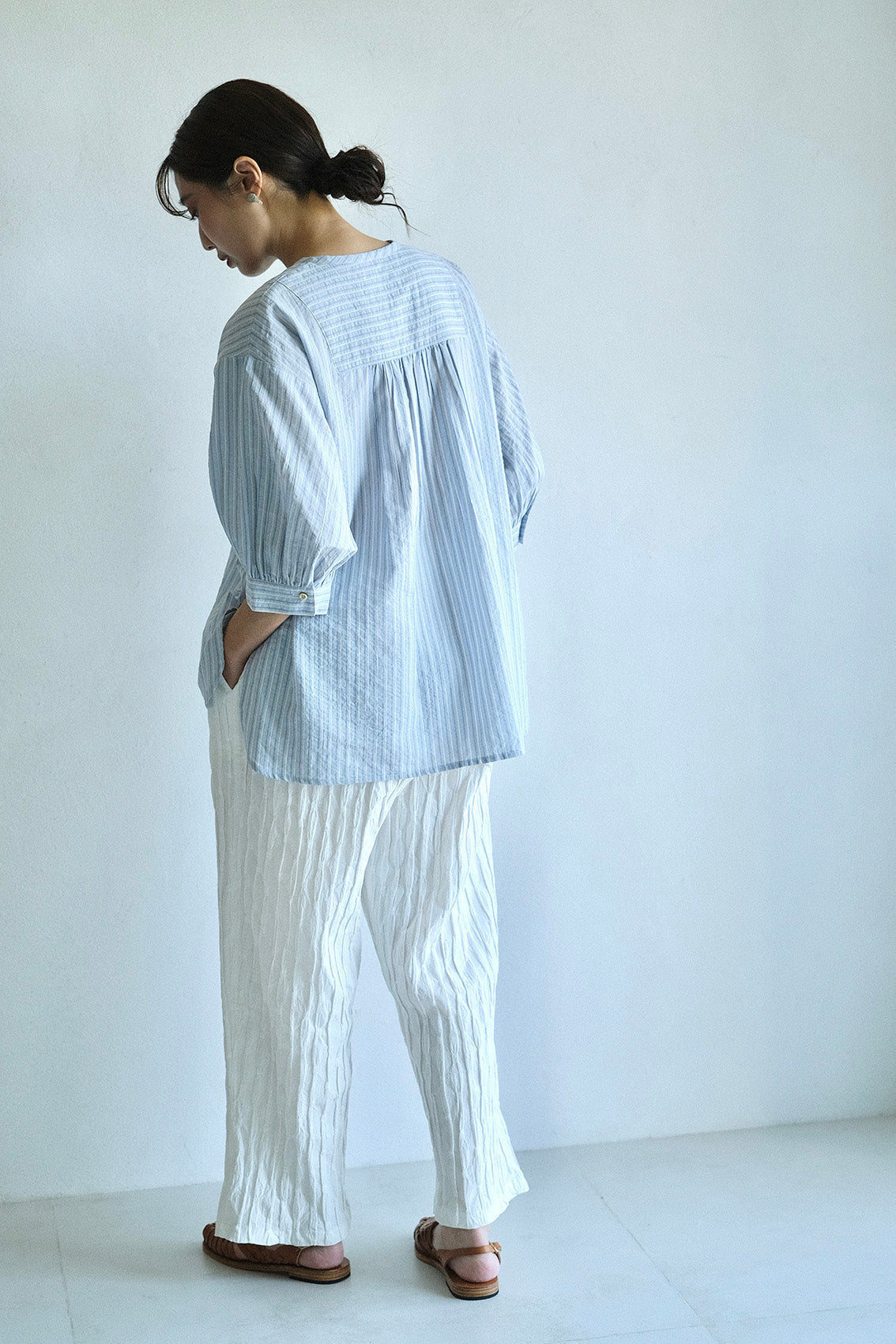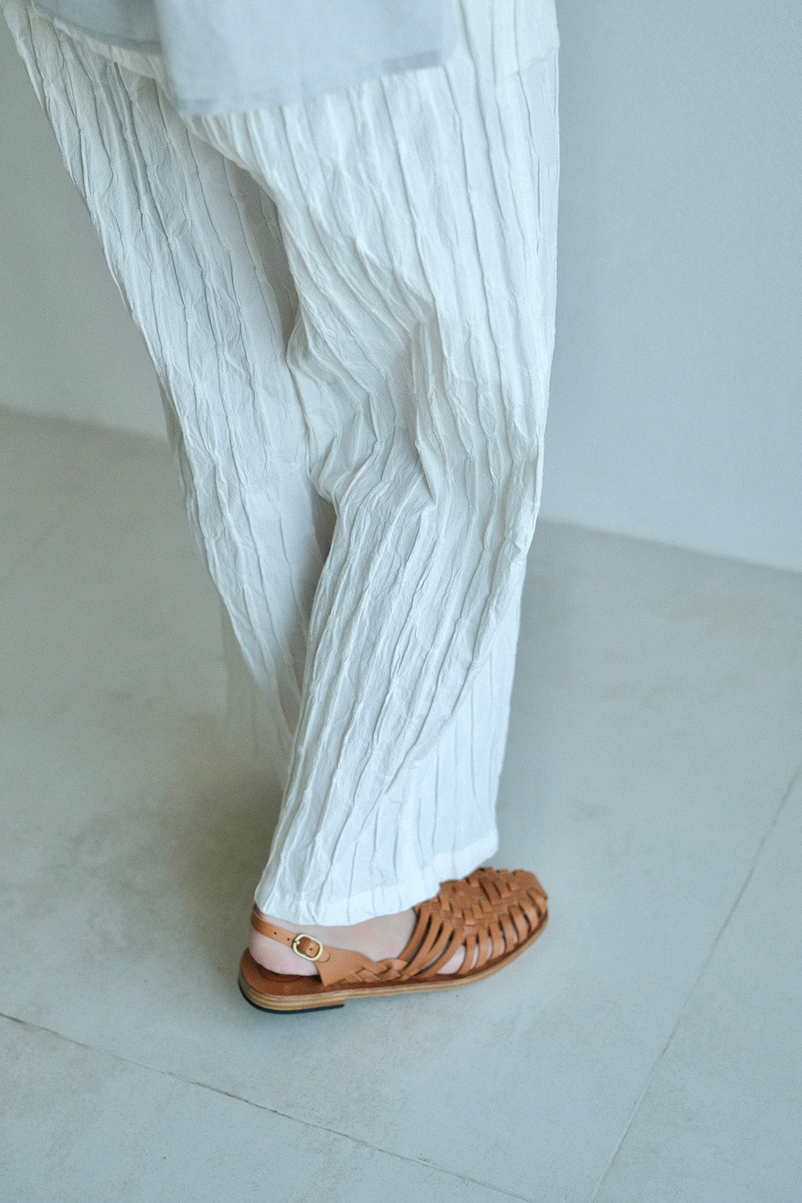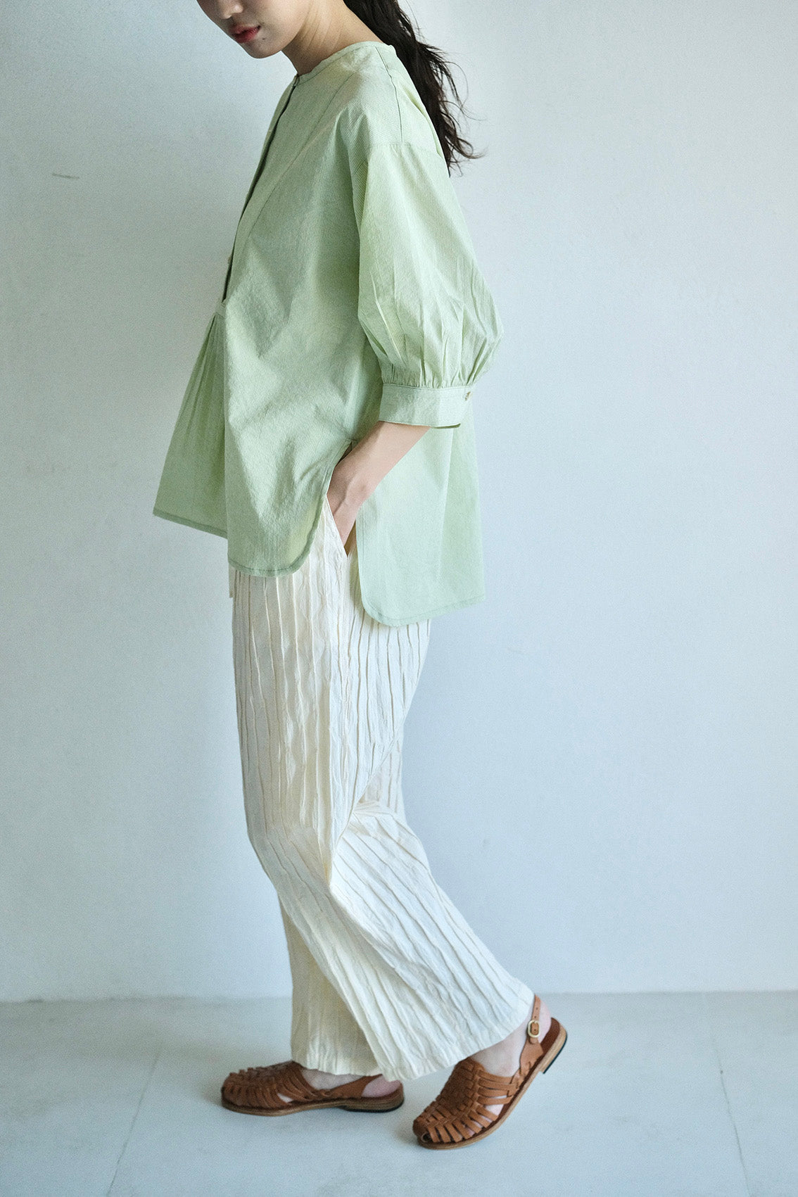 這款版型略為寬鬆的直筒褲,使用這次在韓國一眼就相中的布料,布面本身帶有抓摺紋理,細節豐富又帶點俏皮感。選擇將它製作成褲子後,就算搭配簡單的上衣,也能讓整體造型多一份個性與層次。