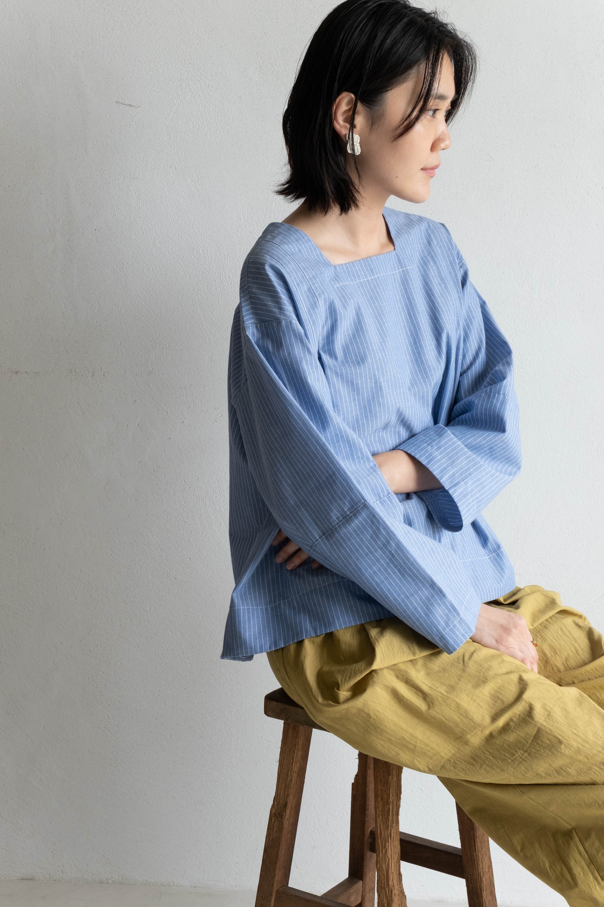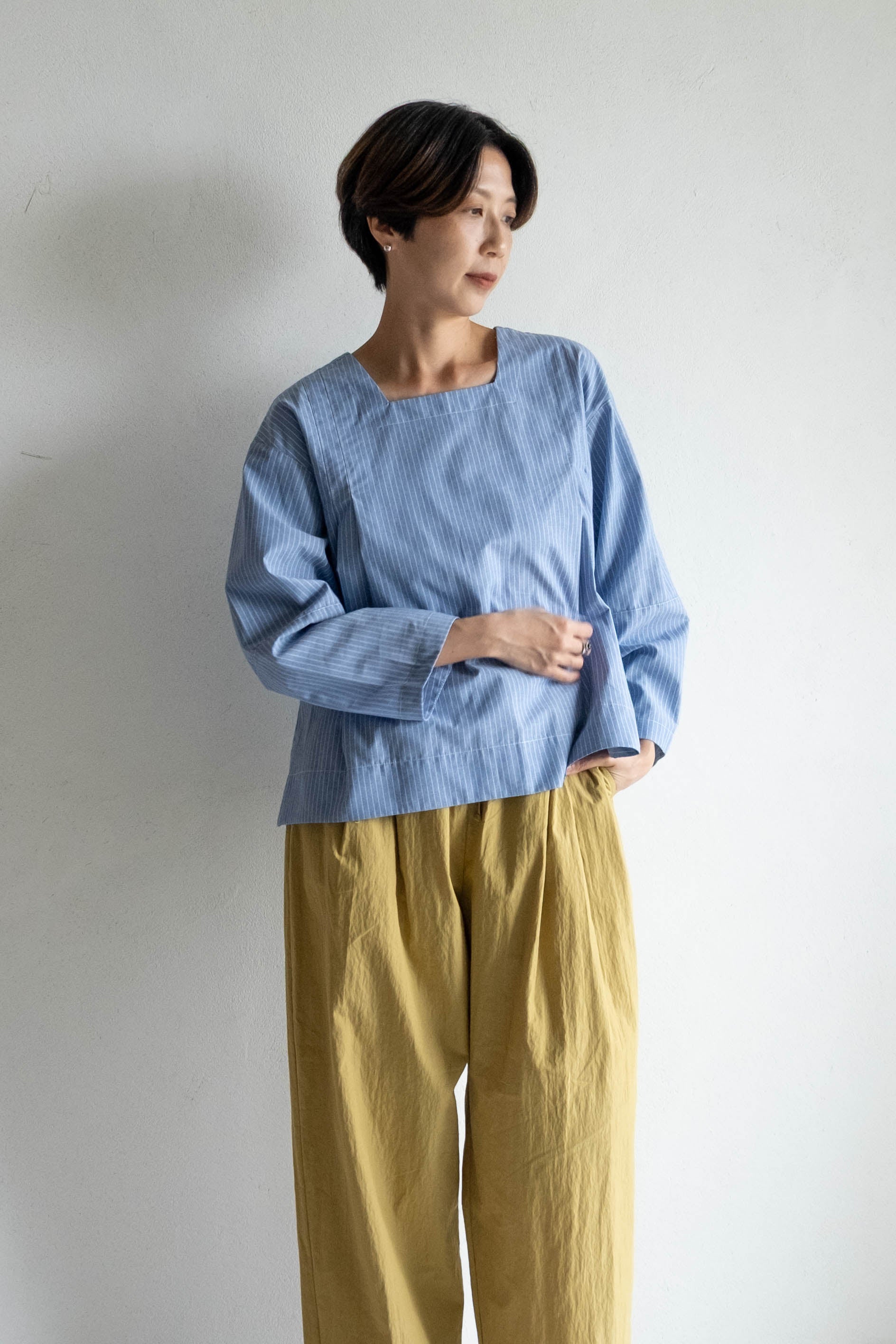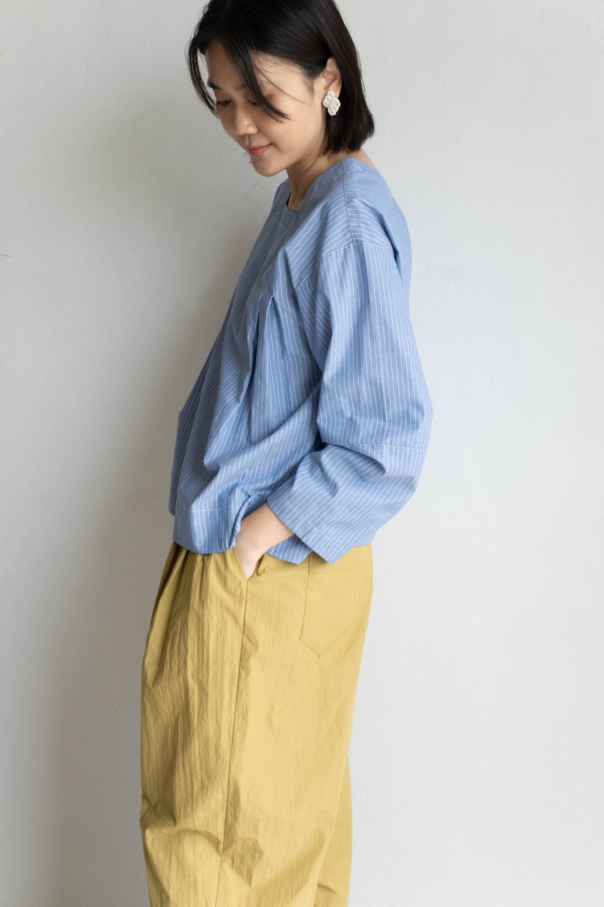以棉麻條紋布料製成,布面帶有輕盈挺度,觸感柔軟細緻。
