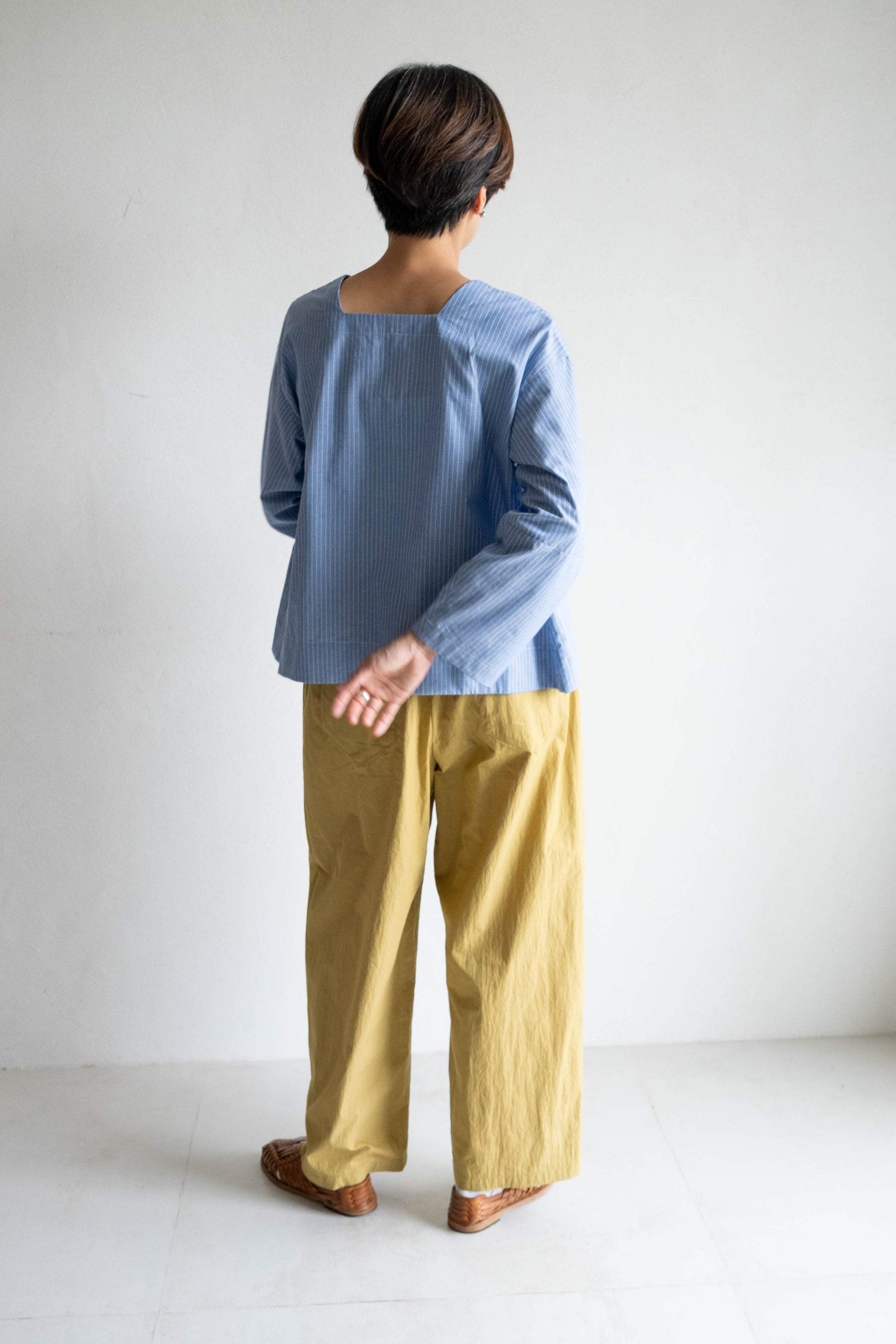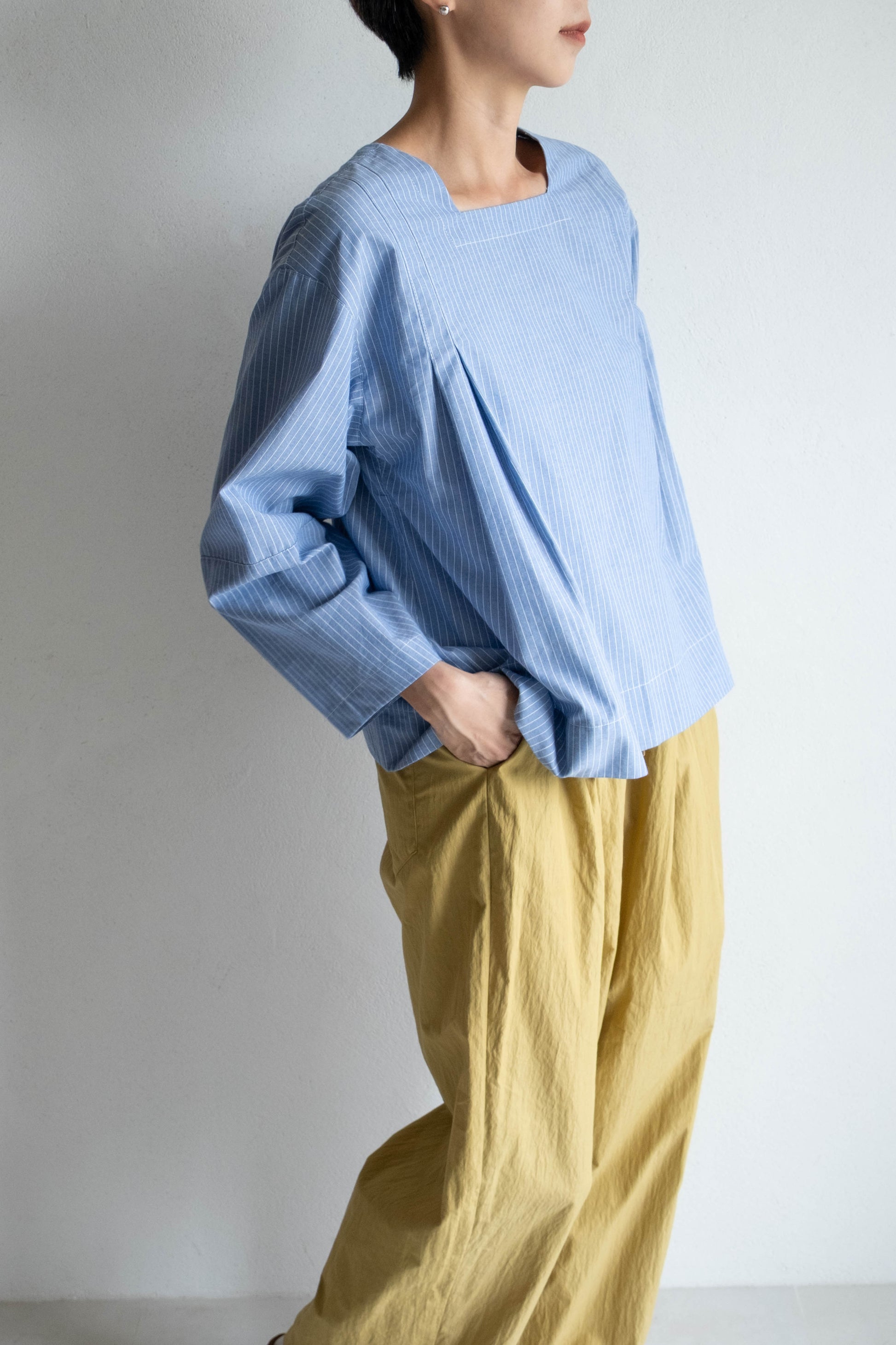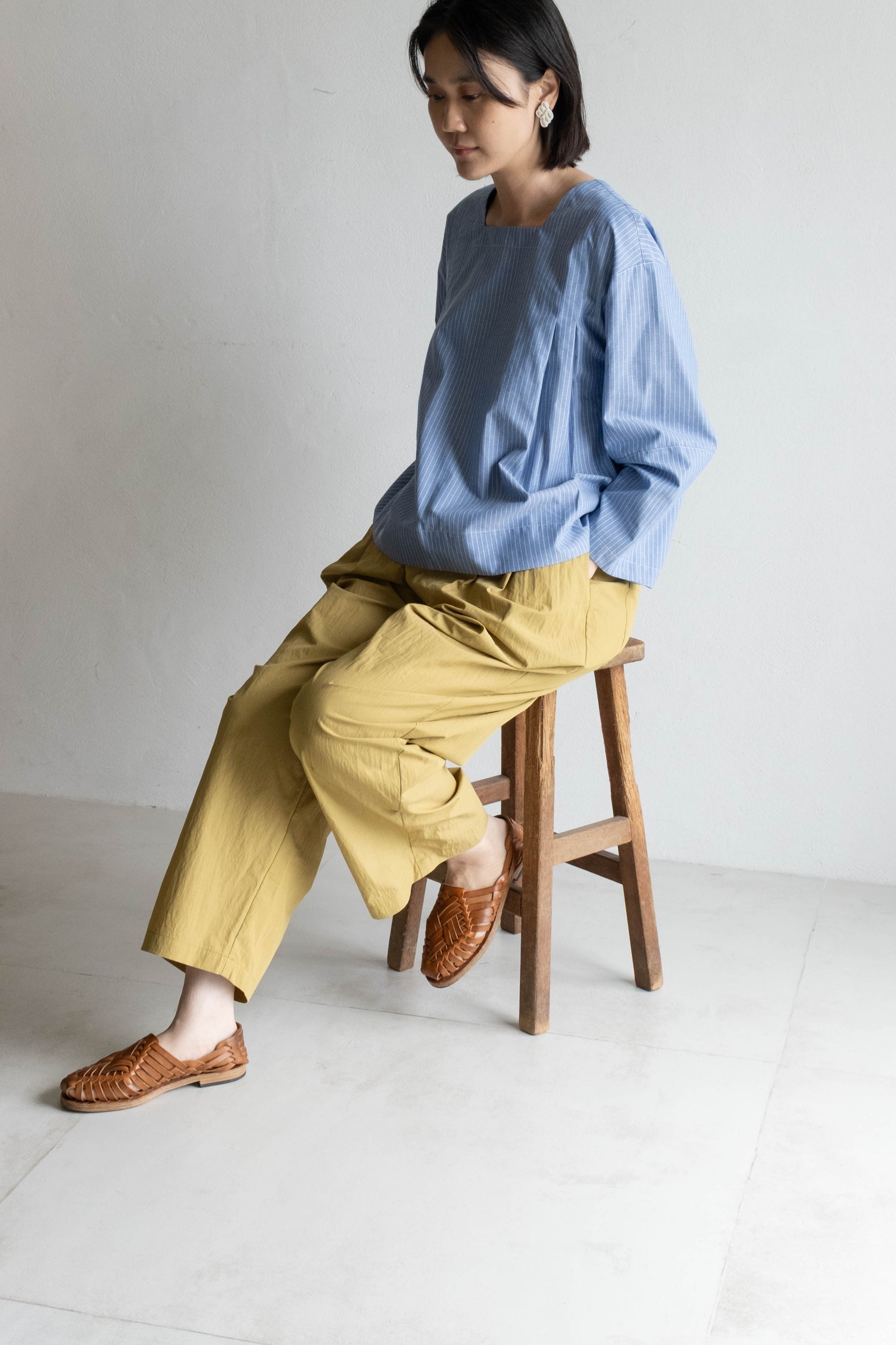 以棉麻條紋布料製成,布面帶有輕盈挺度,觸感柔軟細緻。