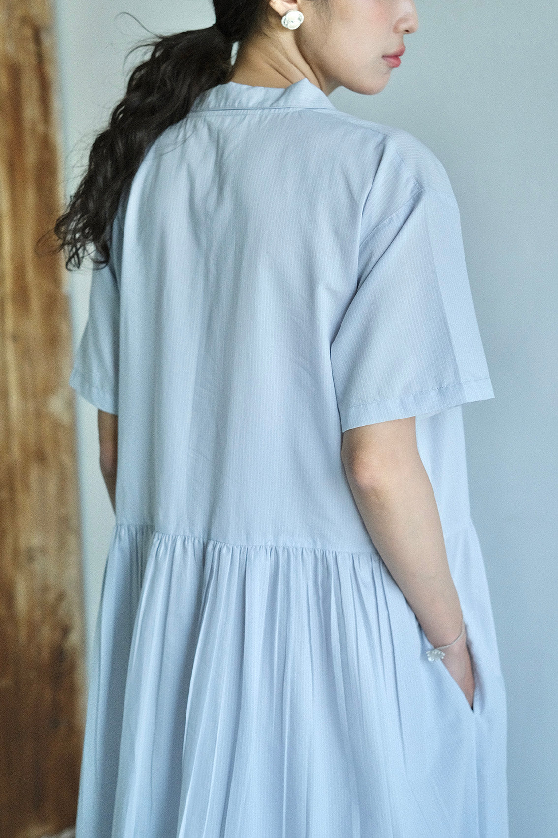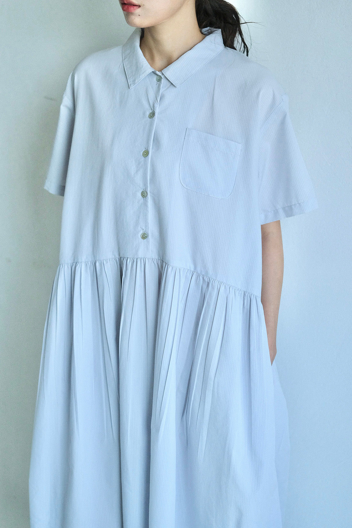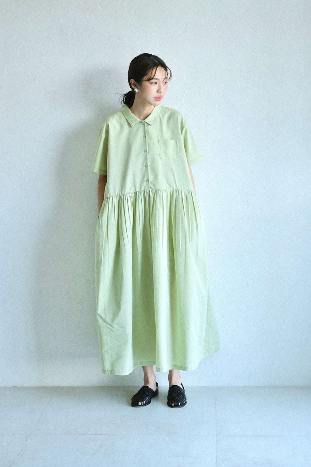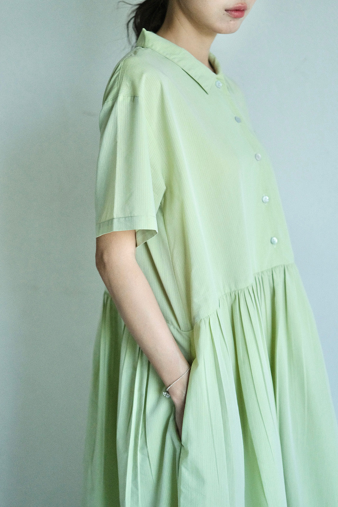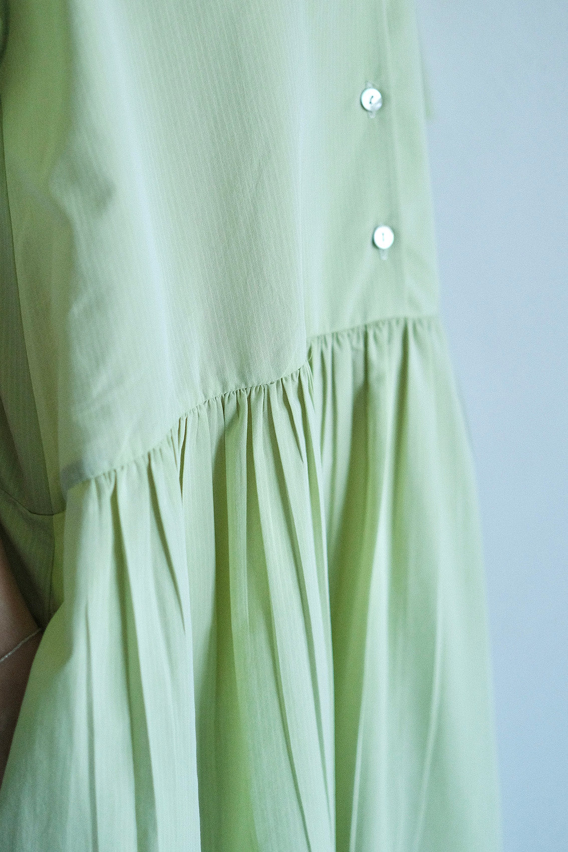 裙襬以大量抓摺展現份量與流動感,走動間自然搖曳。翻領設計可自由調整扣齊或敞開,依喜好變換風格。上身加入一個圓弧小口袋點綴。