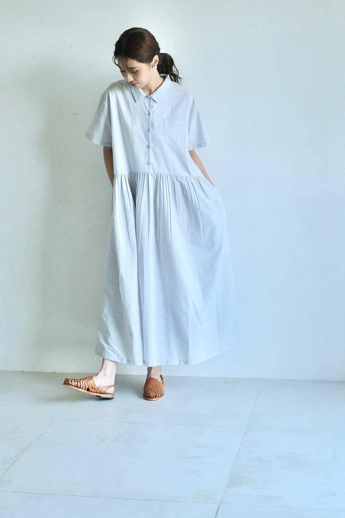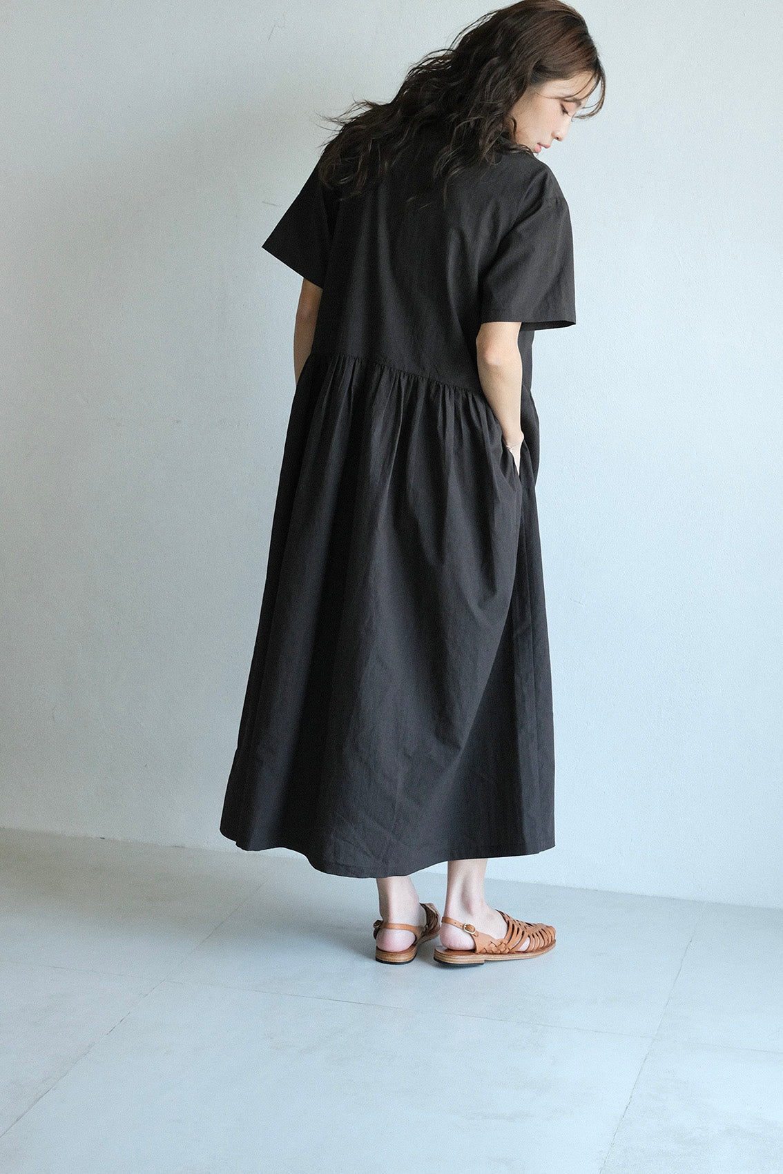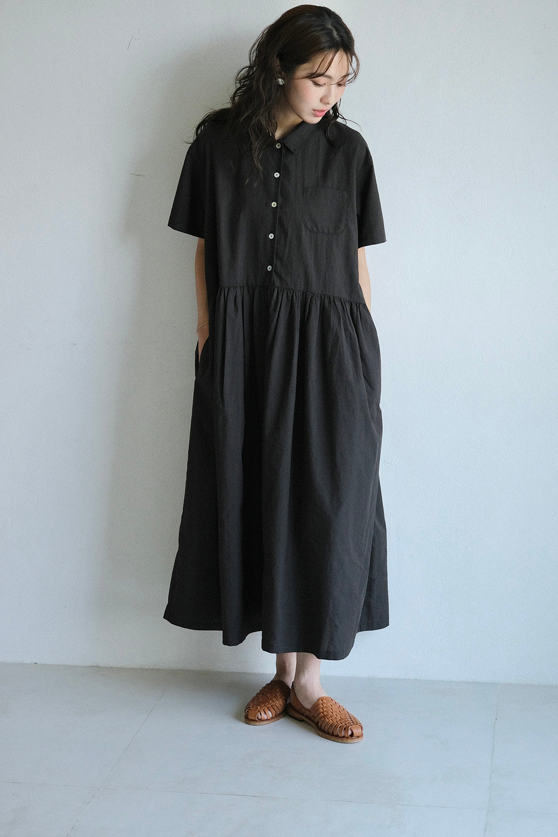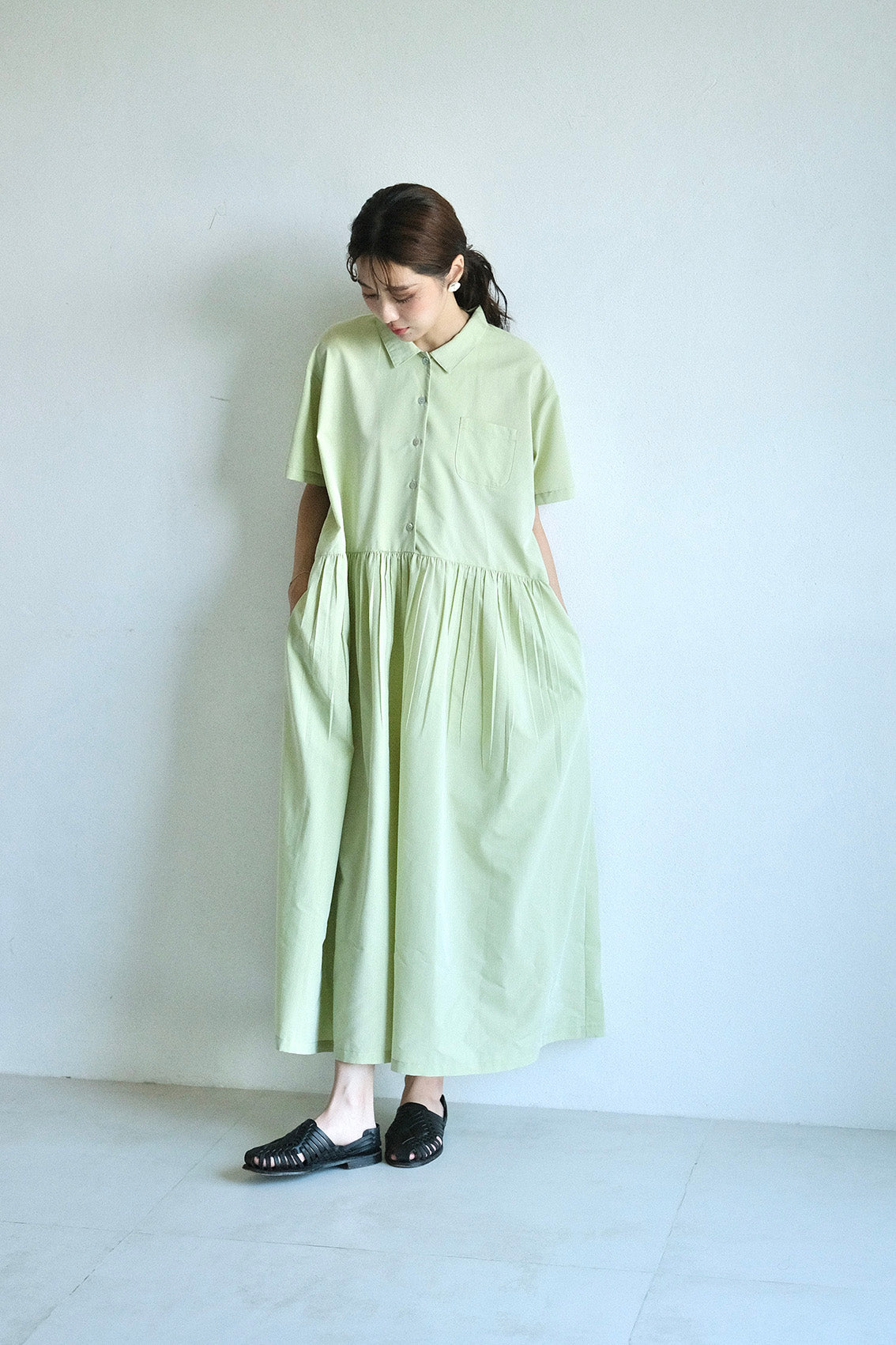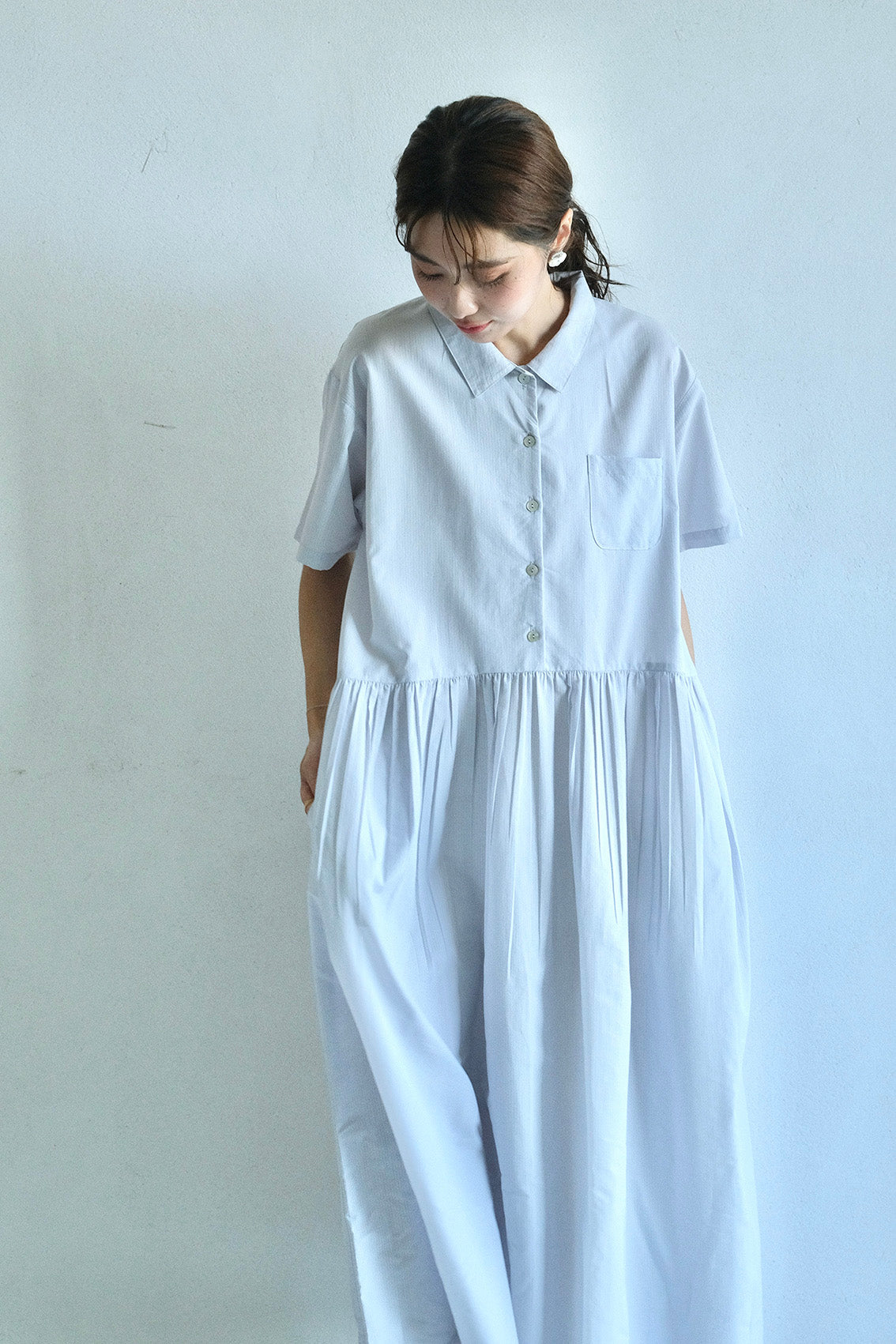 裙襬以大量抓摺展現份量與流動感,走動間自然搖曳。翻領設計可自由調整扣齊或敞開,依喜好變換風格。上身加入一個圓弧小口袋點綴。