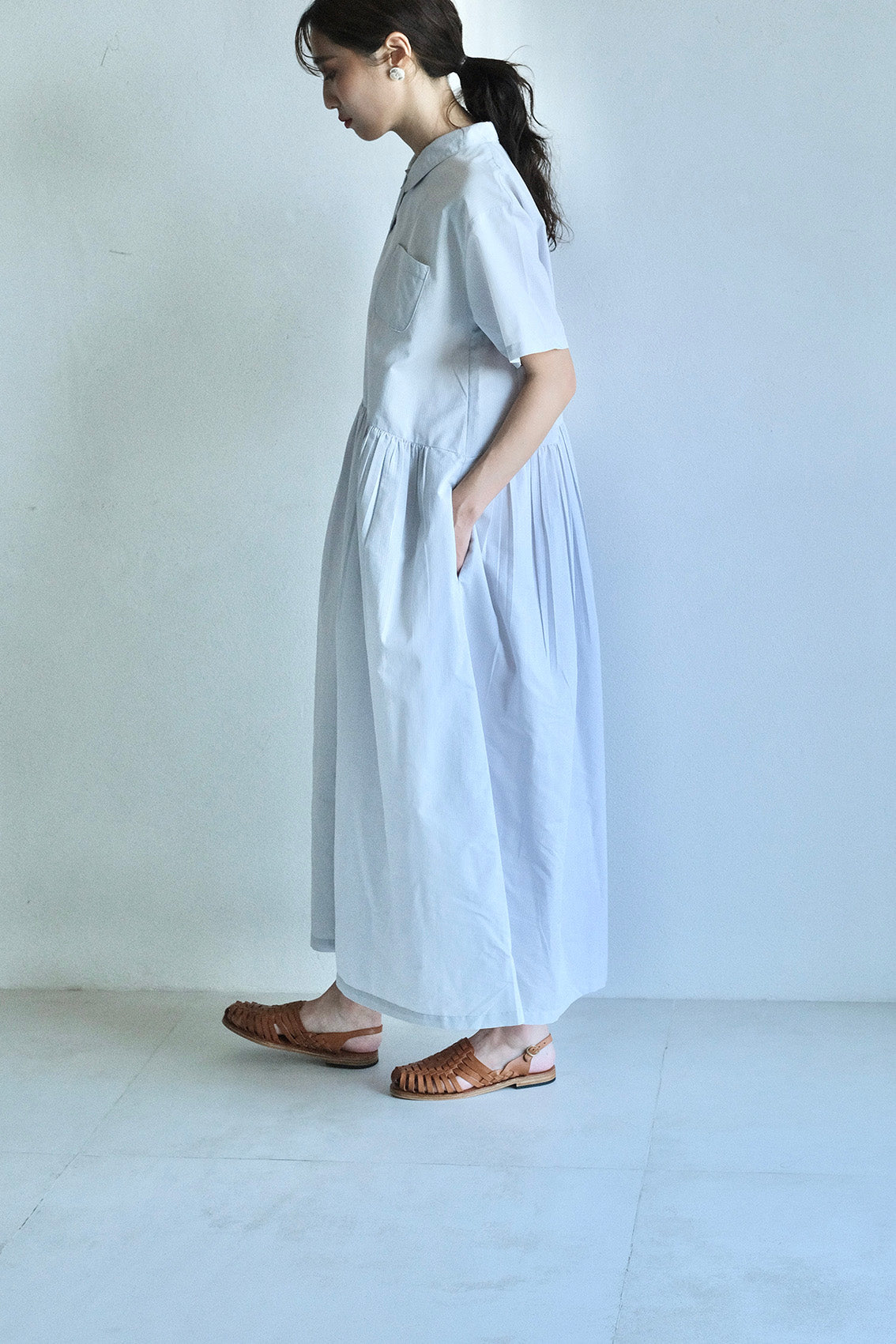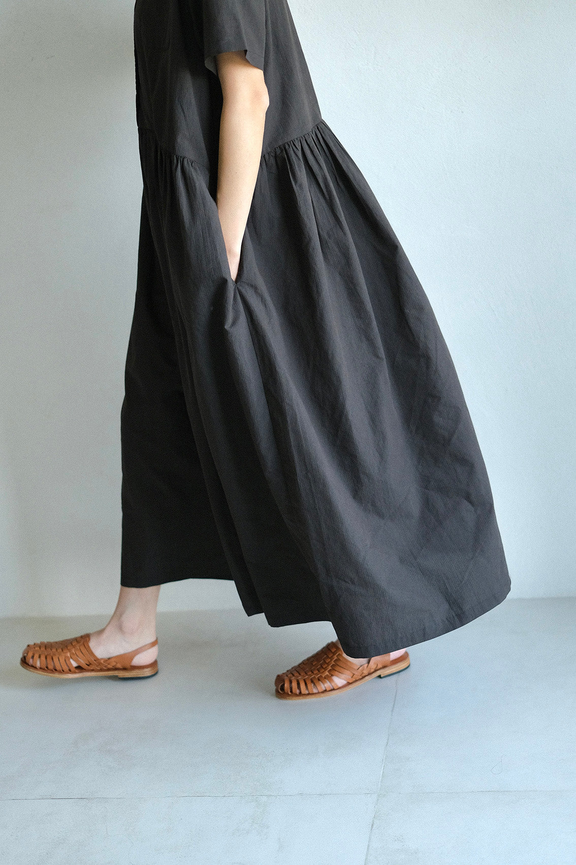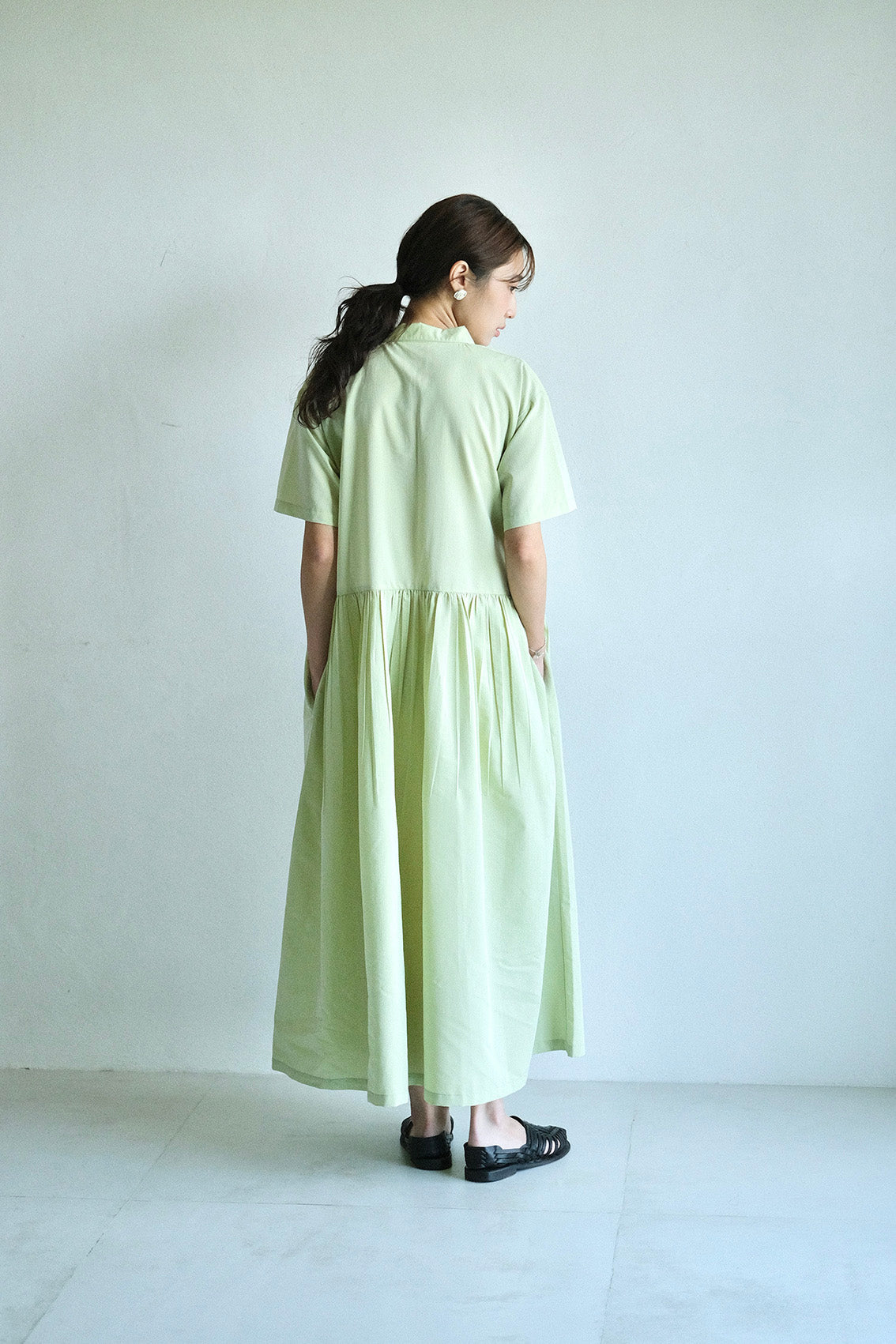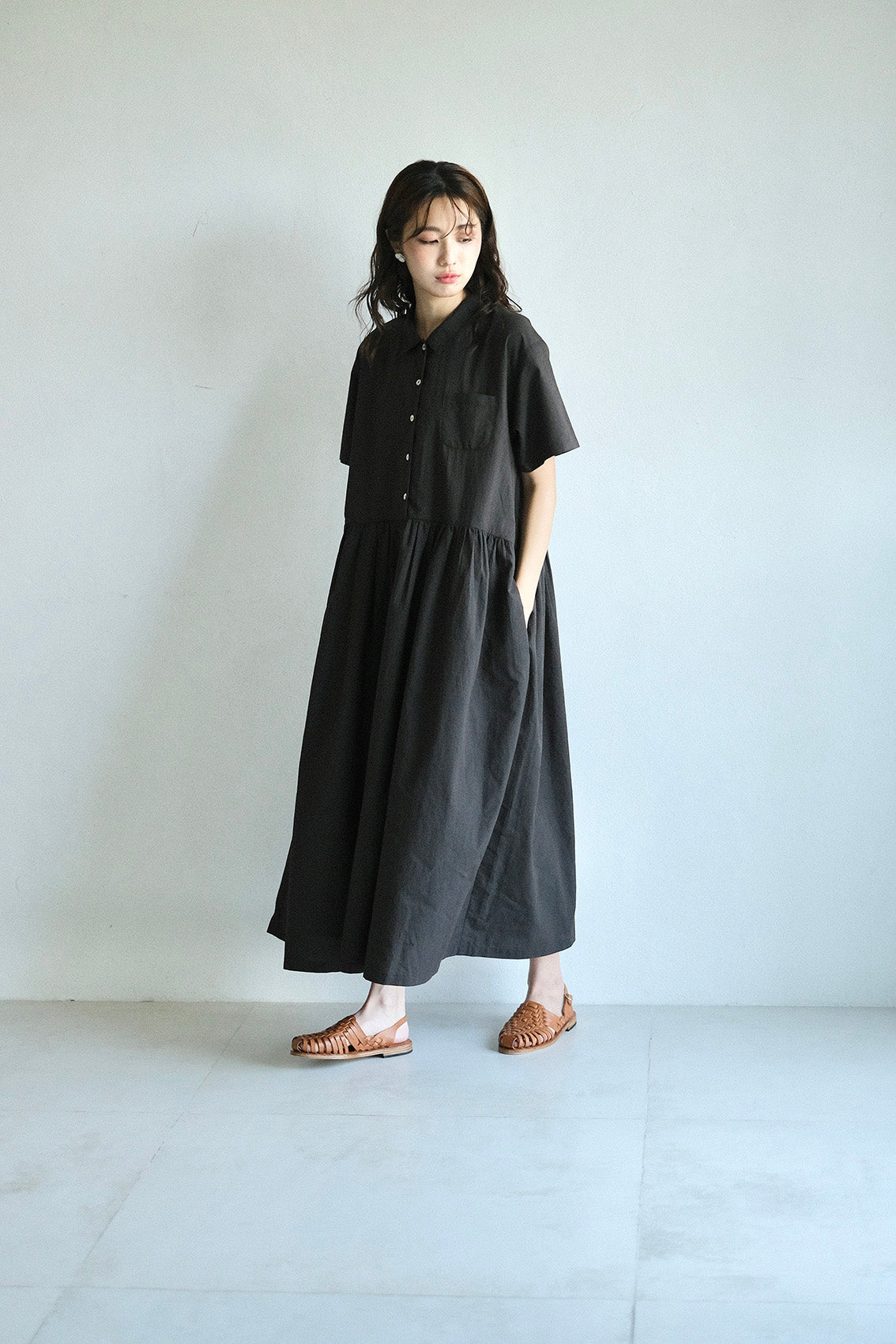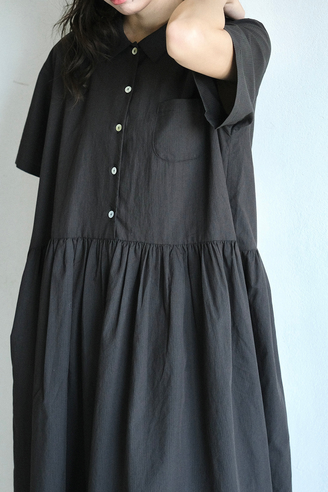 裙襬以大量抓摺展現份量與流動感,走動間自然搖曳。翻領設計可自由調整扣齊或敞開,依喜好變換風格。上身加入一個圓弧小口袋點綴。