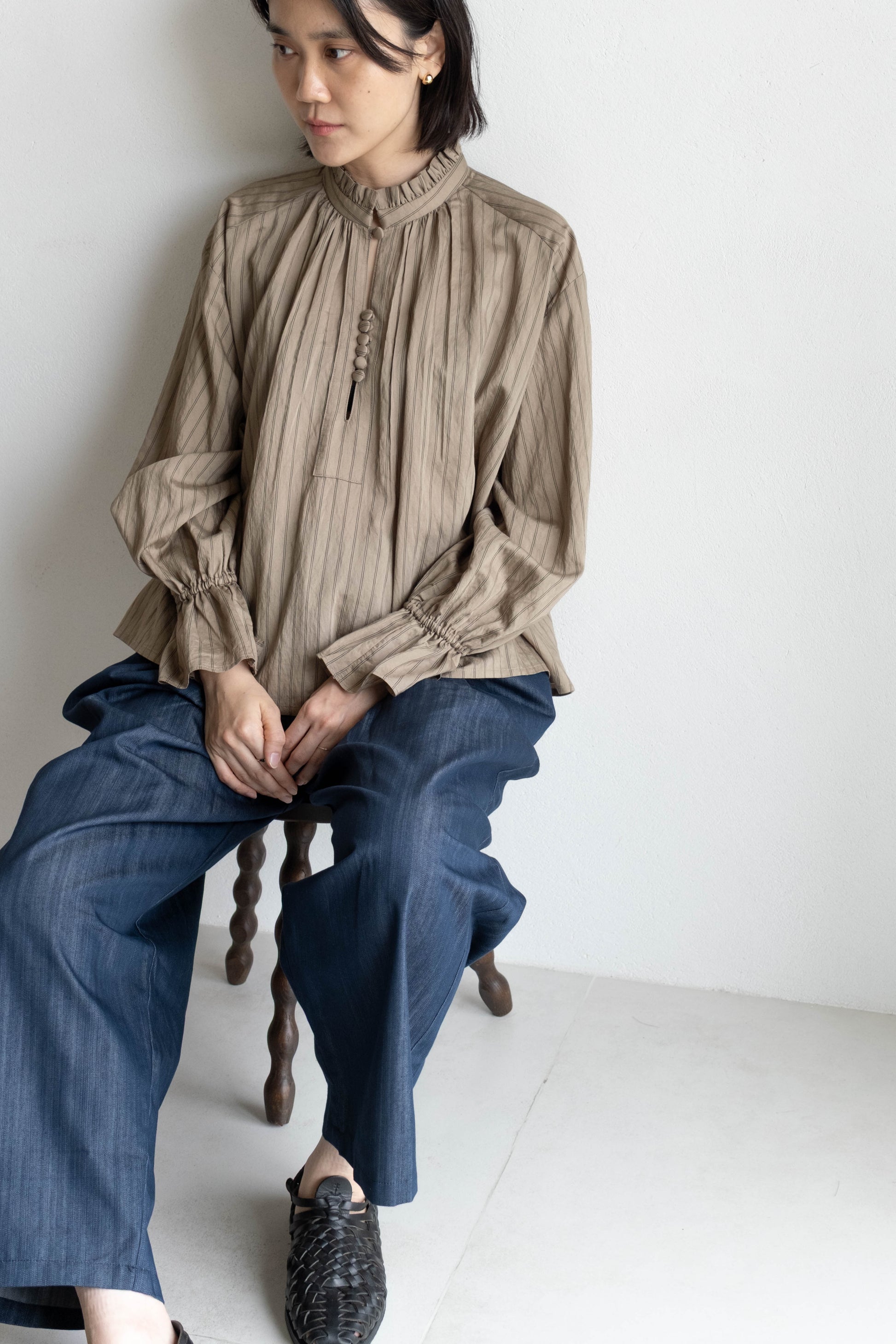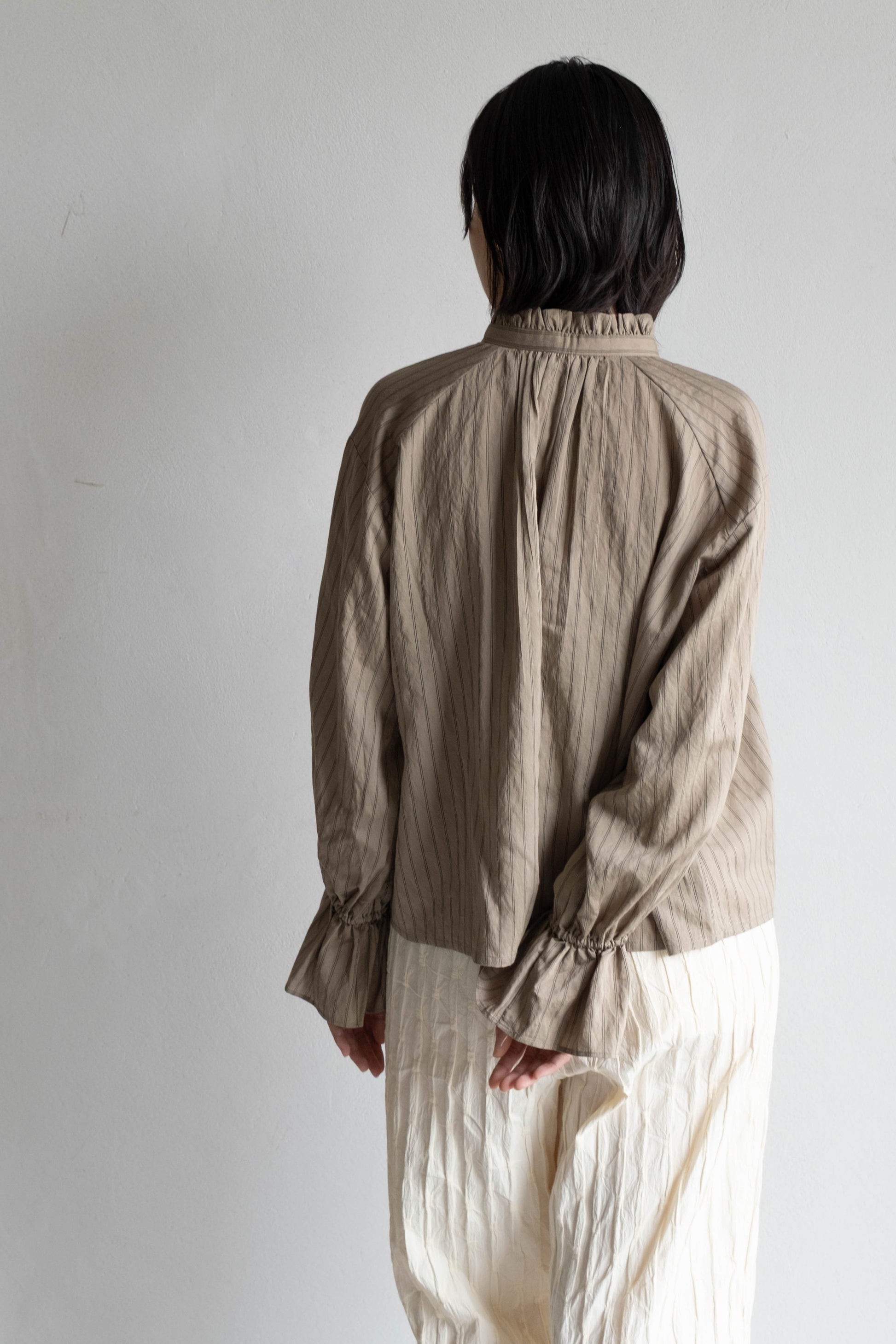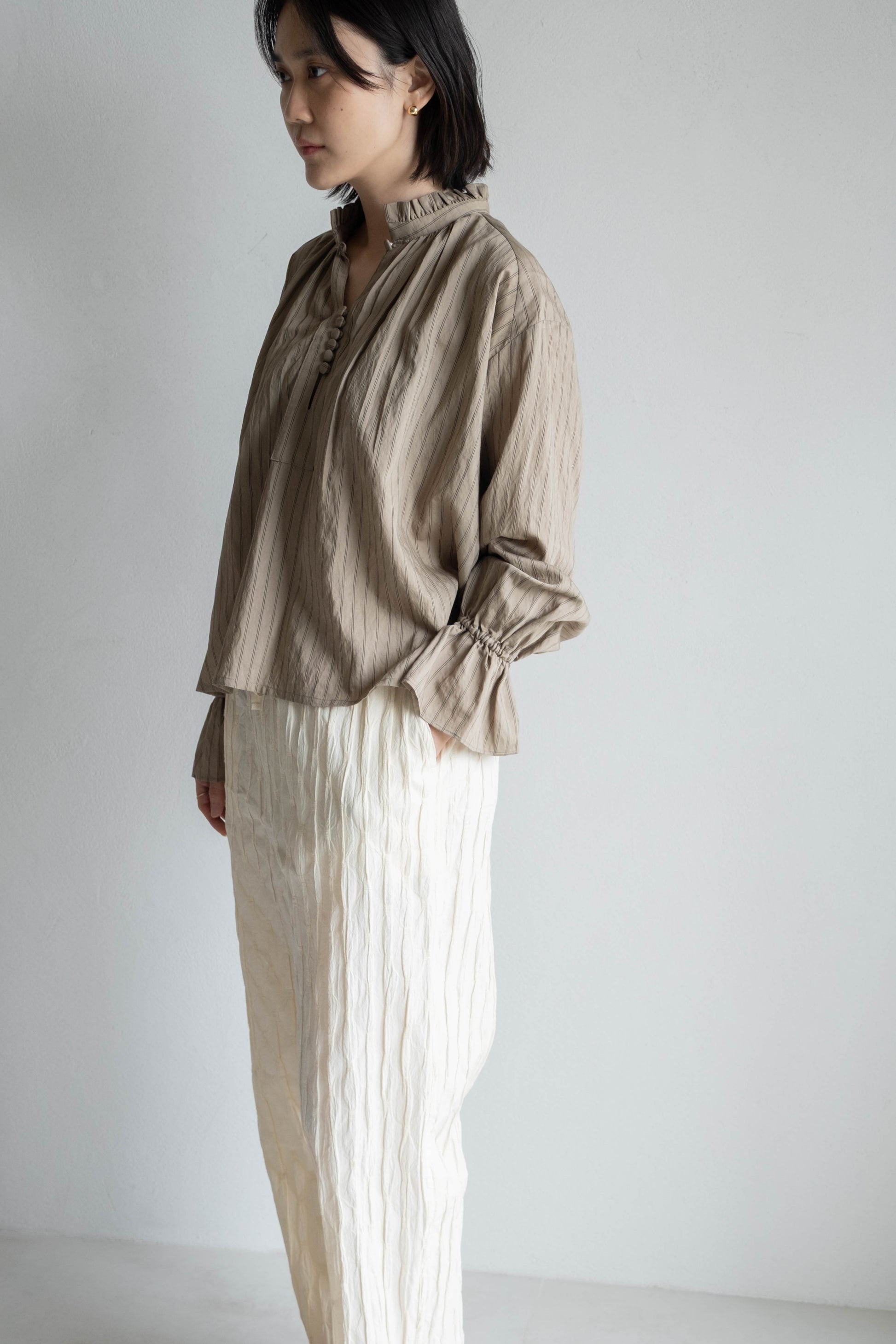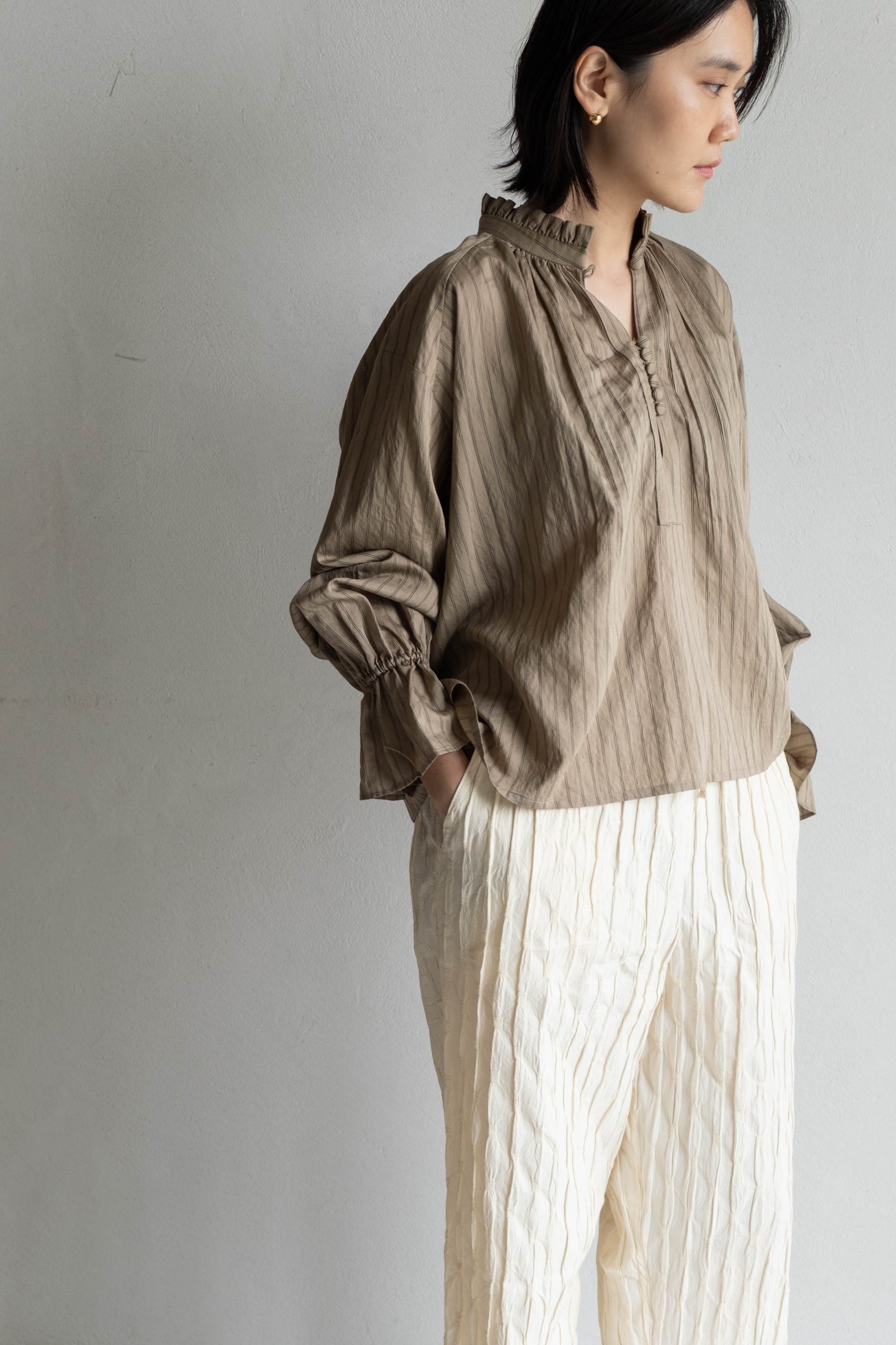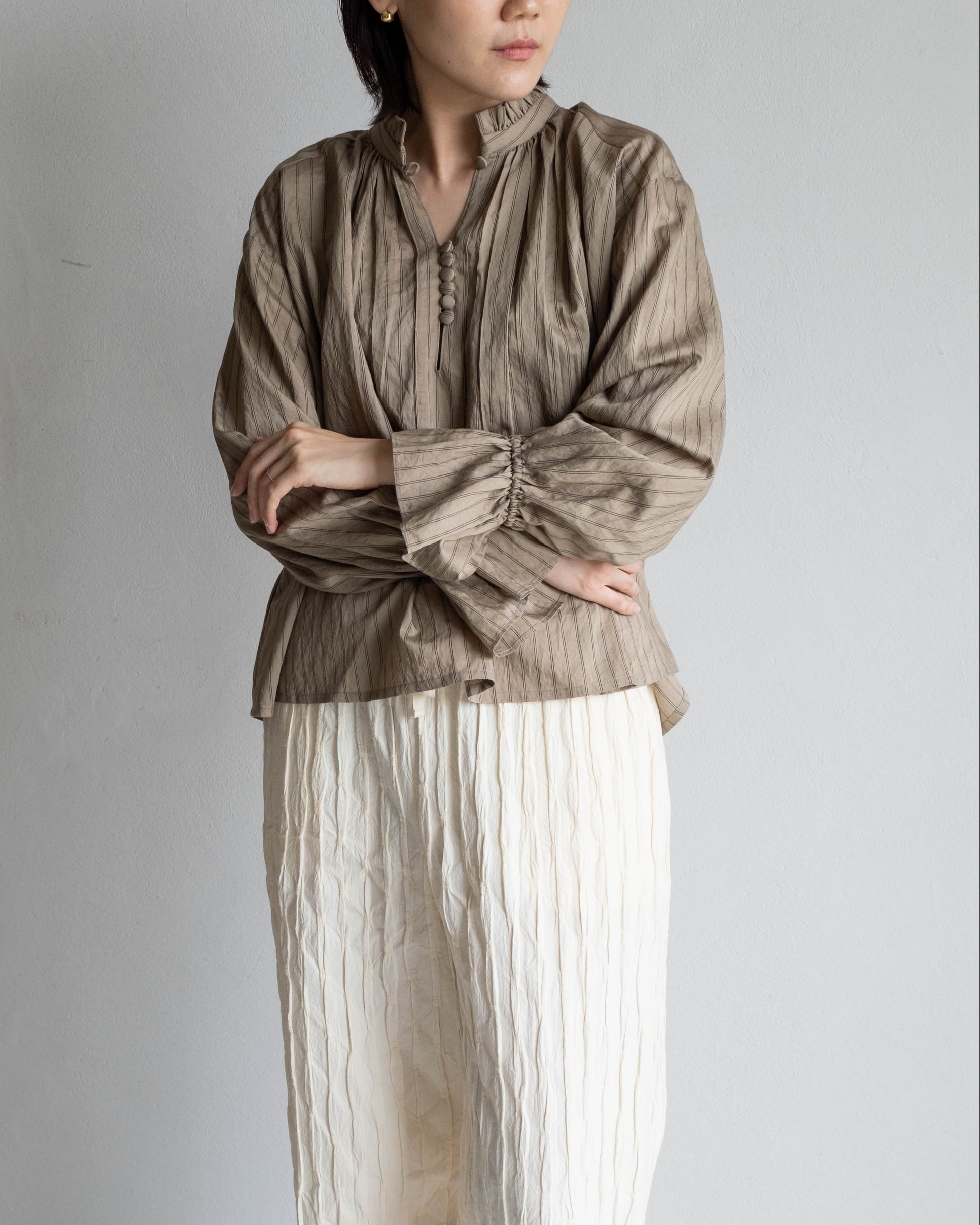 袖型如垂落的花苞,手腕內側車有鬆緊帶,可依日常習慣隨時拉起並固定於手臂上。無論是輕鬆搭配牛仔褲,或與正式西裝褲相配,都能展現不同風格,是一款兼具優雅與實用的襯衫。