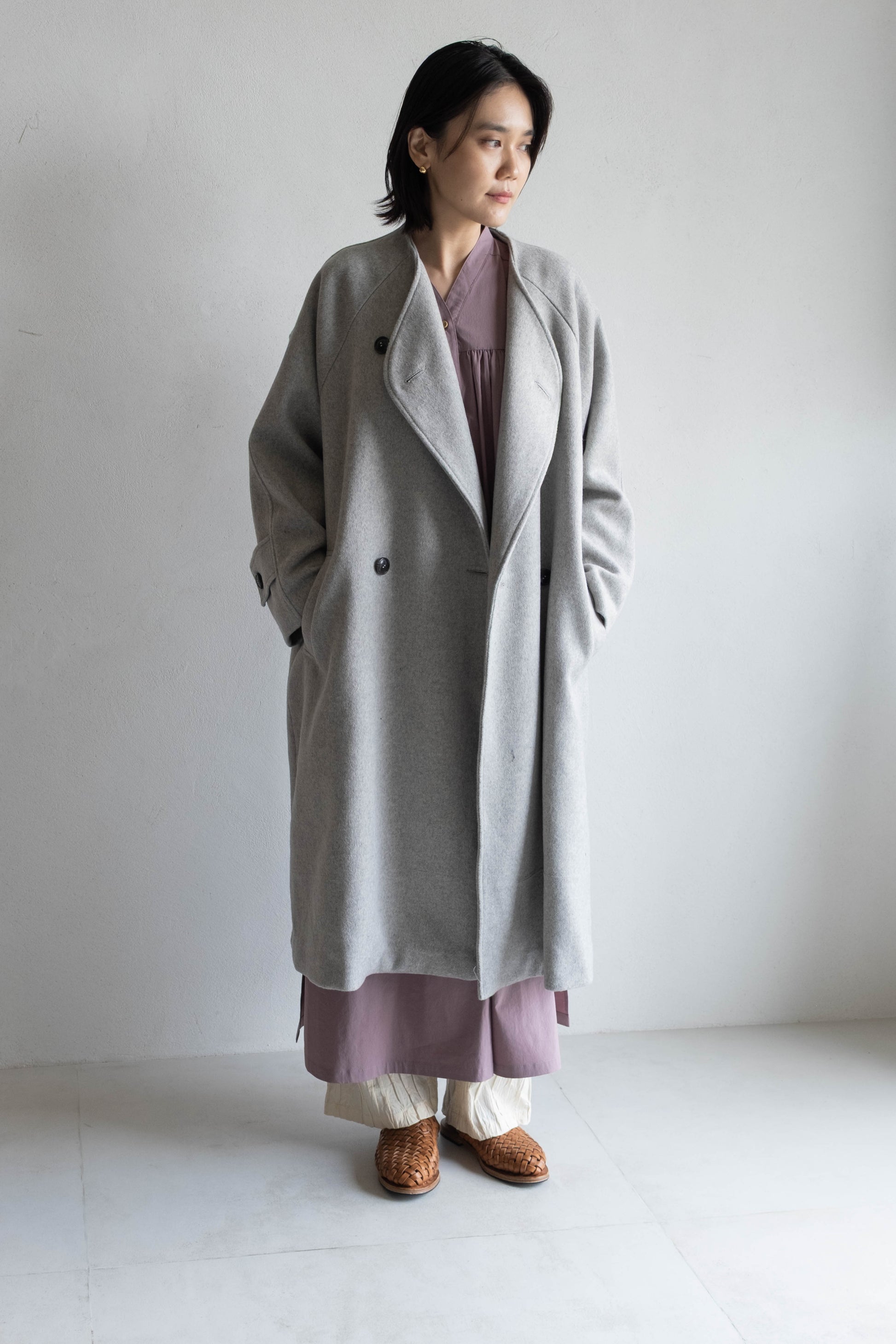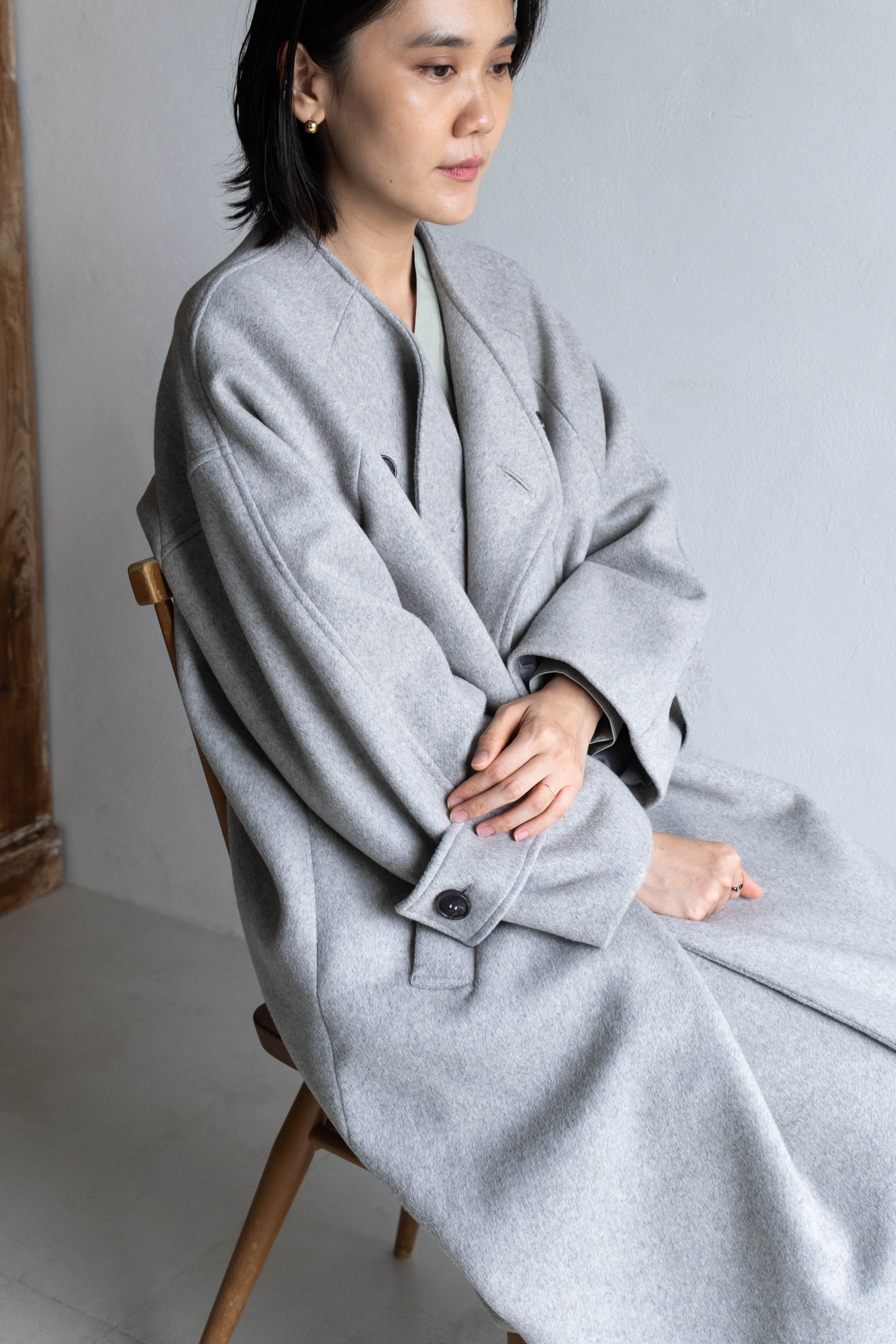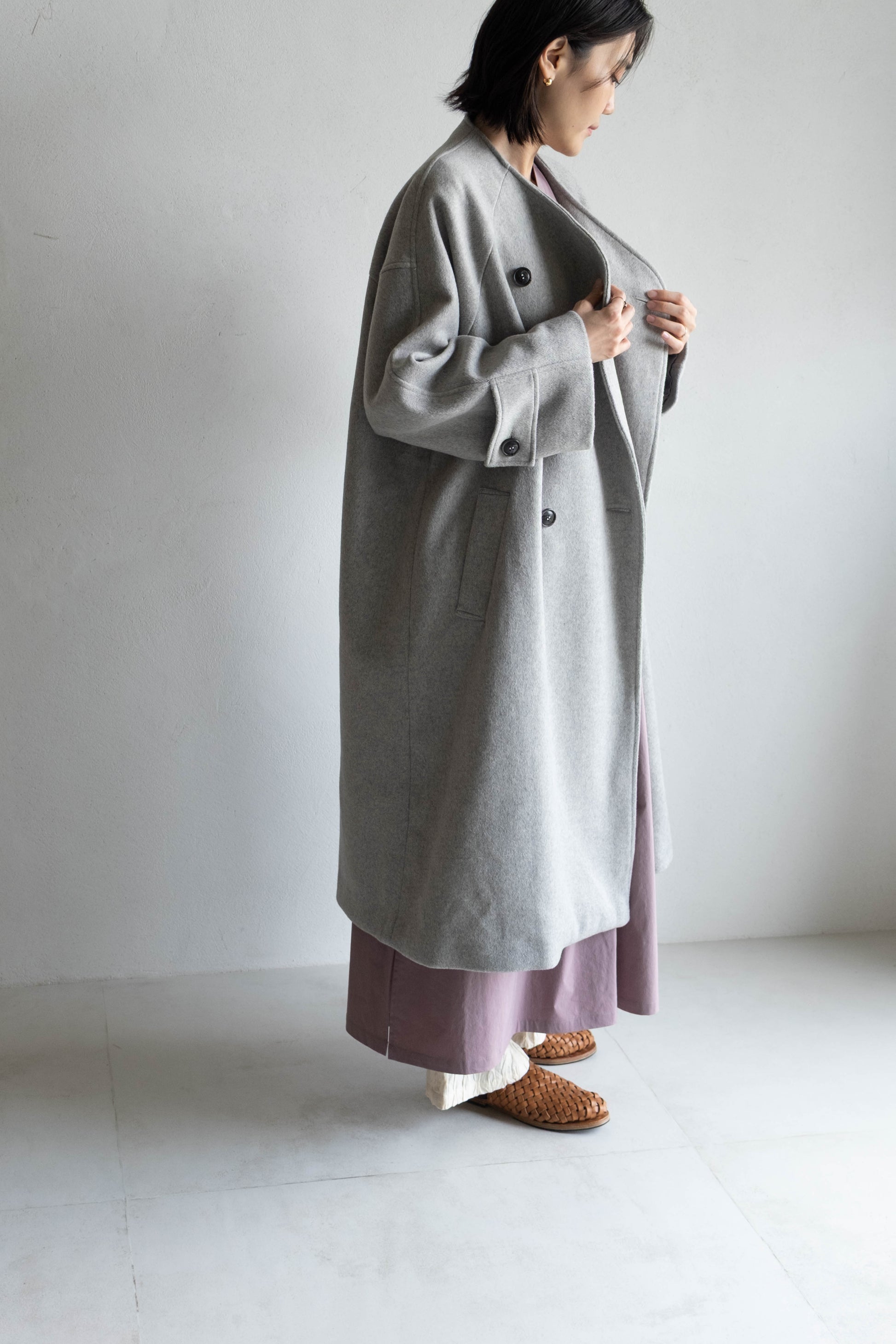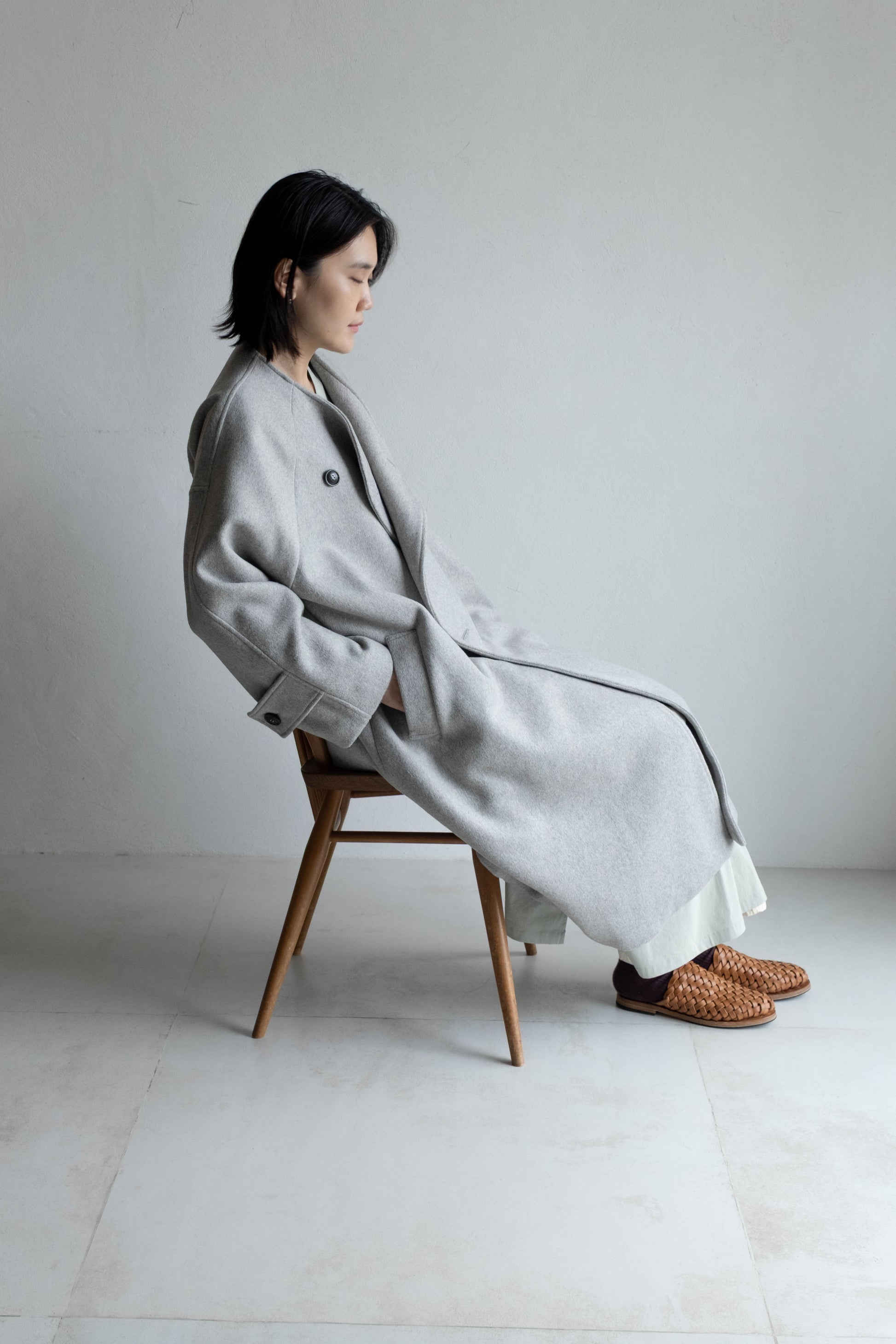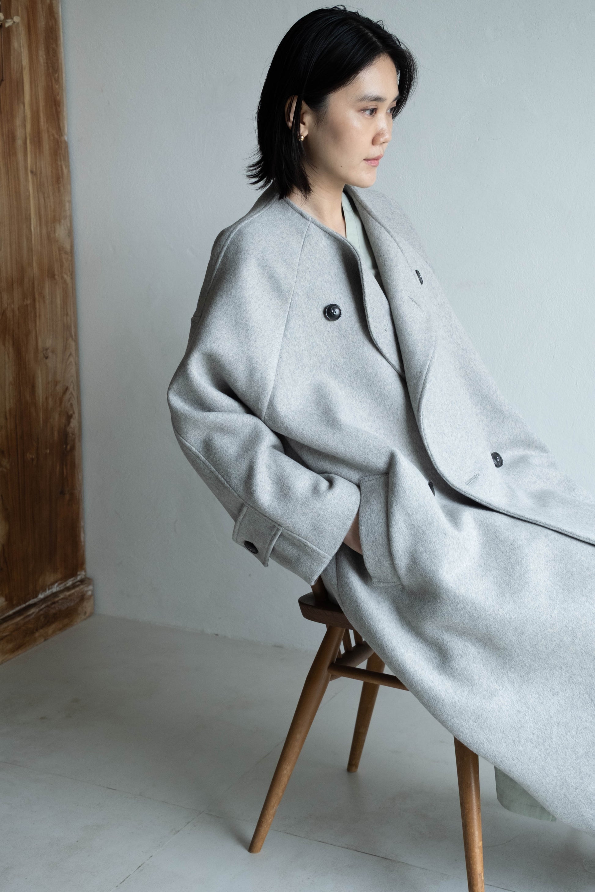 衣長特意設定在能同時搭配褲裝與洋裝的比例;後領以微高領設計修飾線條,使整體視覺更顯優雅。雙排釦門襟可依個人習慣扣起或自然敞開。