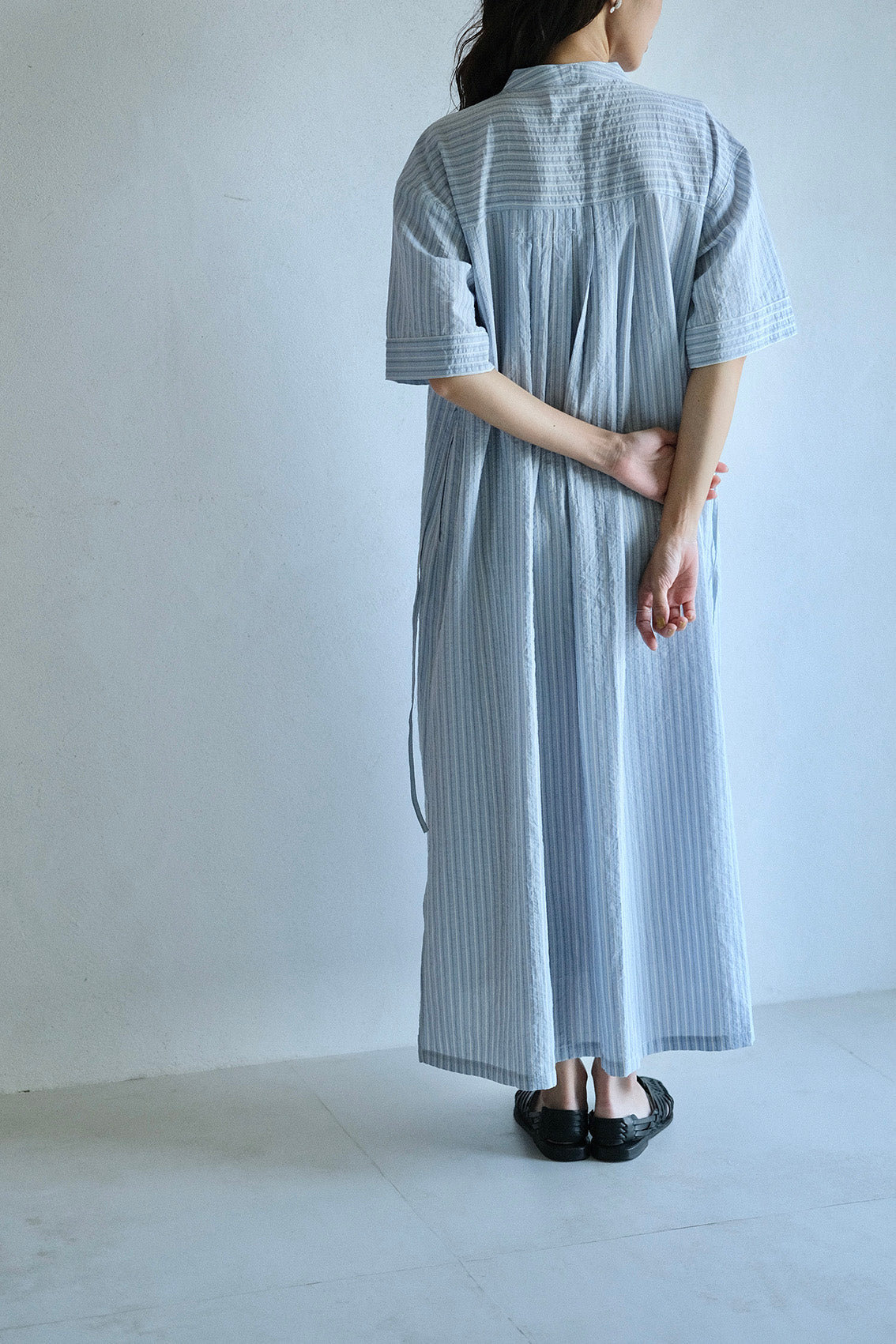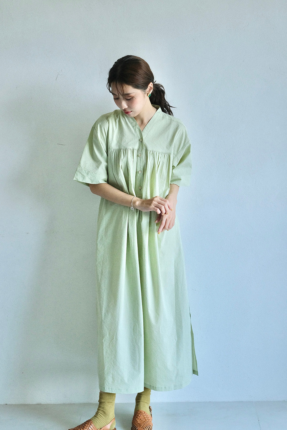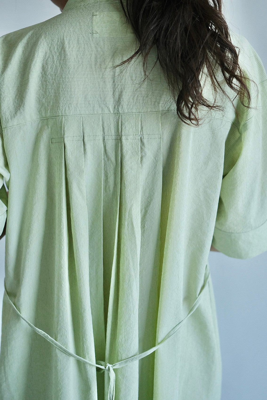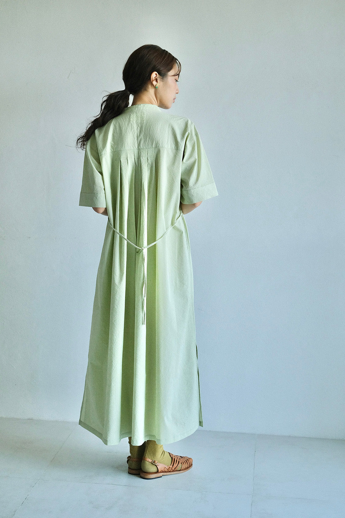 以立領延伸出的V領設計,修飾脖子與臉部線條,整體比例顯得更加修長。前胸的剪接加入細緻抽皺,背面則透過打摺手法,讓裙擺展現自然的流動感。