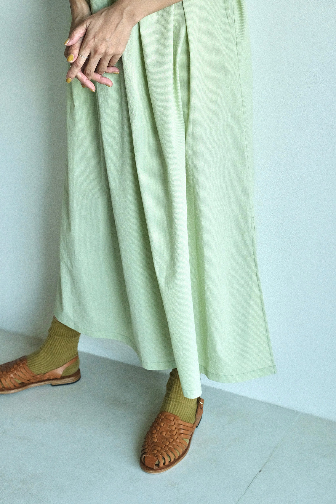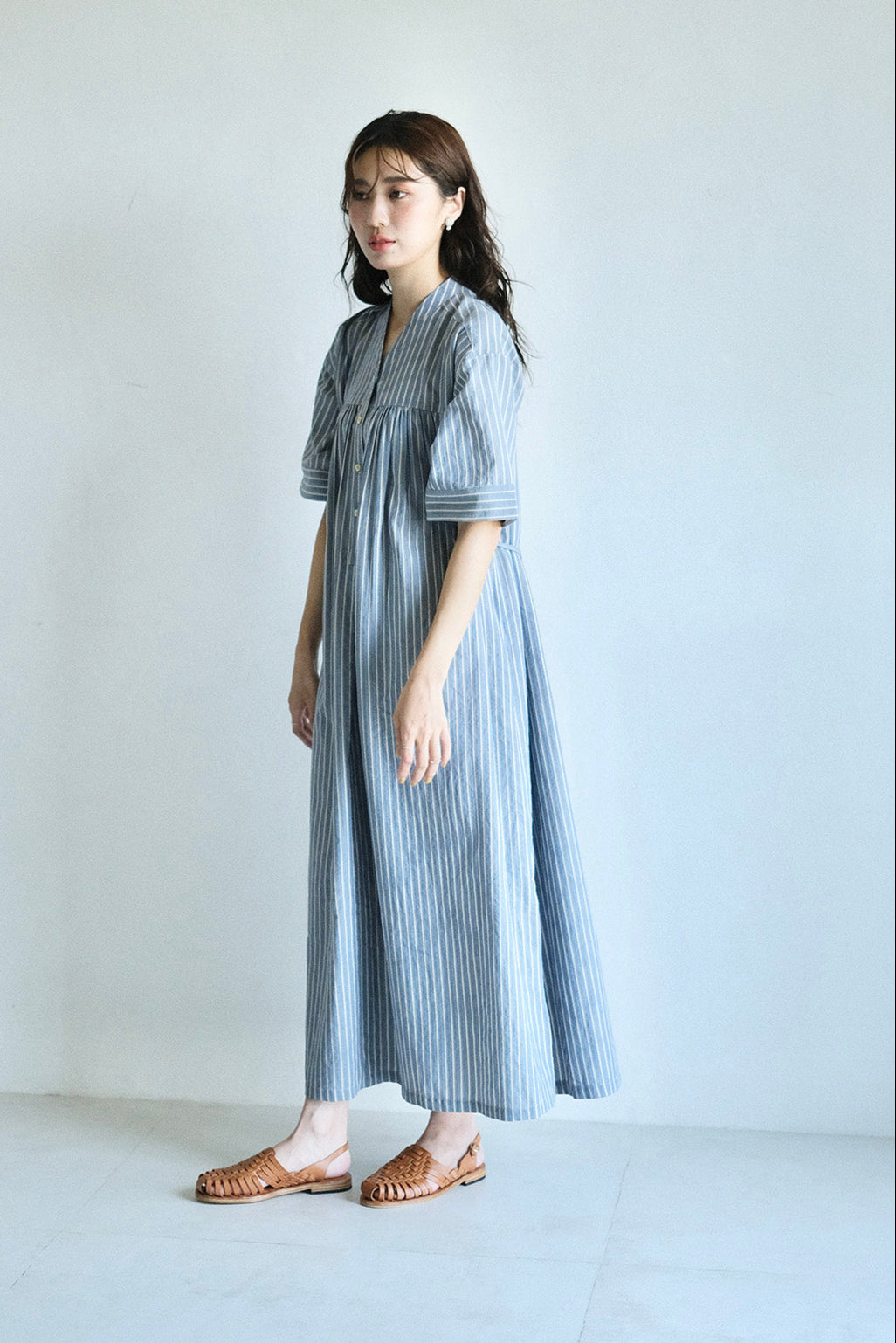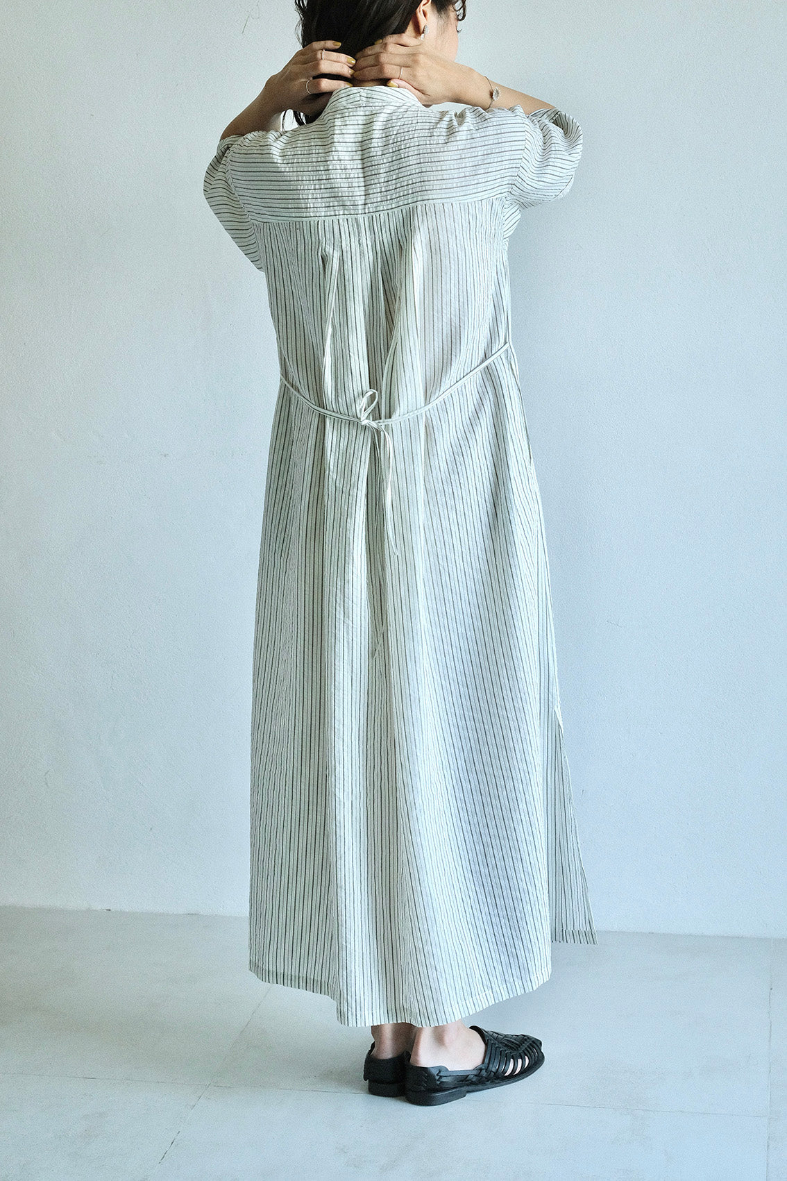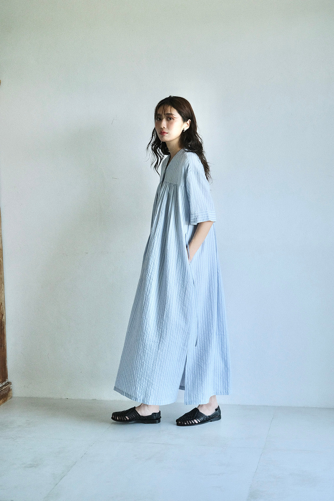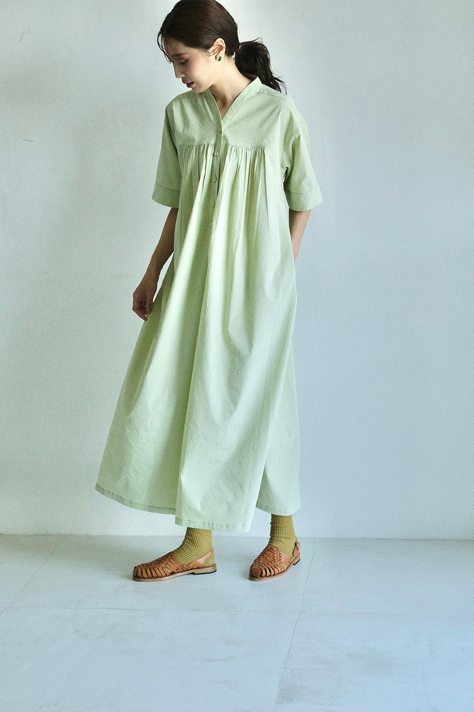以立領延伸出的V領設計,修飾脖子與臉部線條,整體比例顯得更加修長。前胸的剪接加入細緻抽皺,背面則透過打摺手法,讓裙擺展現自然的流動感。