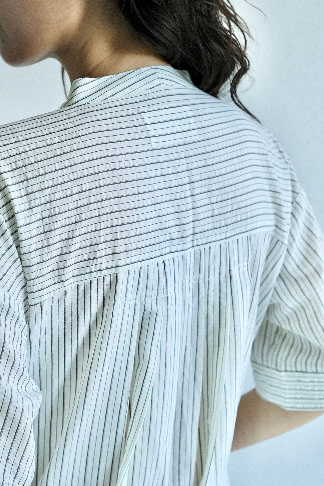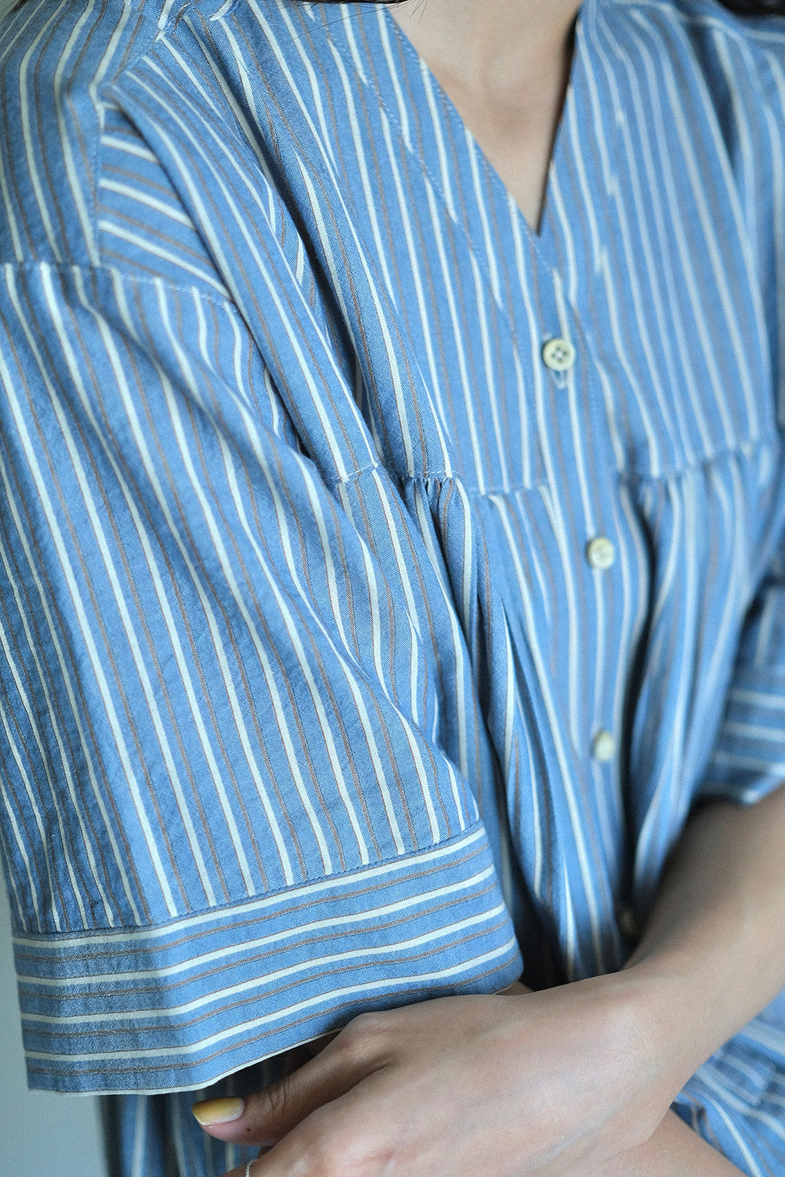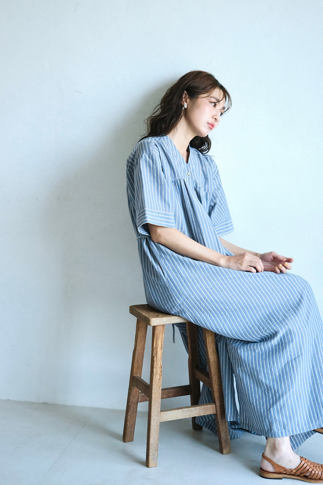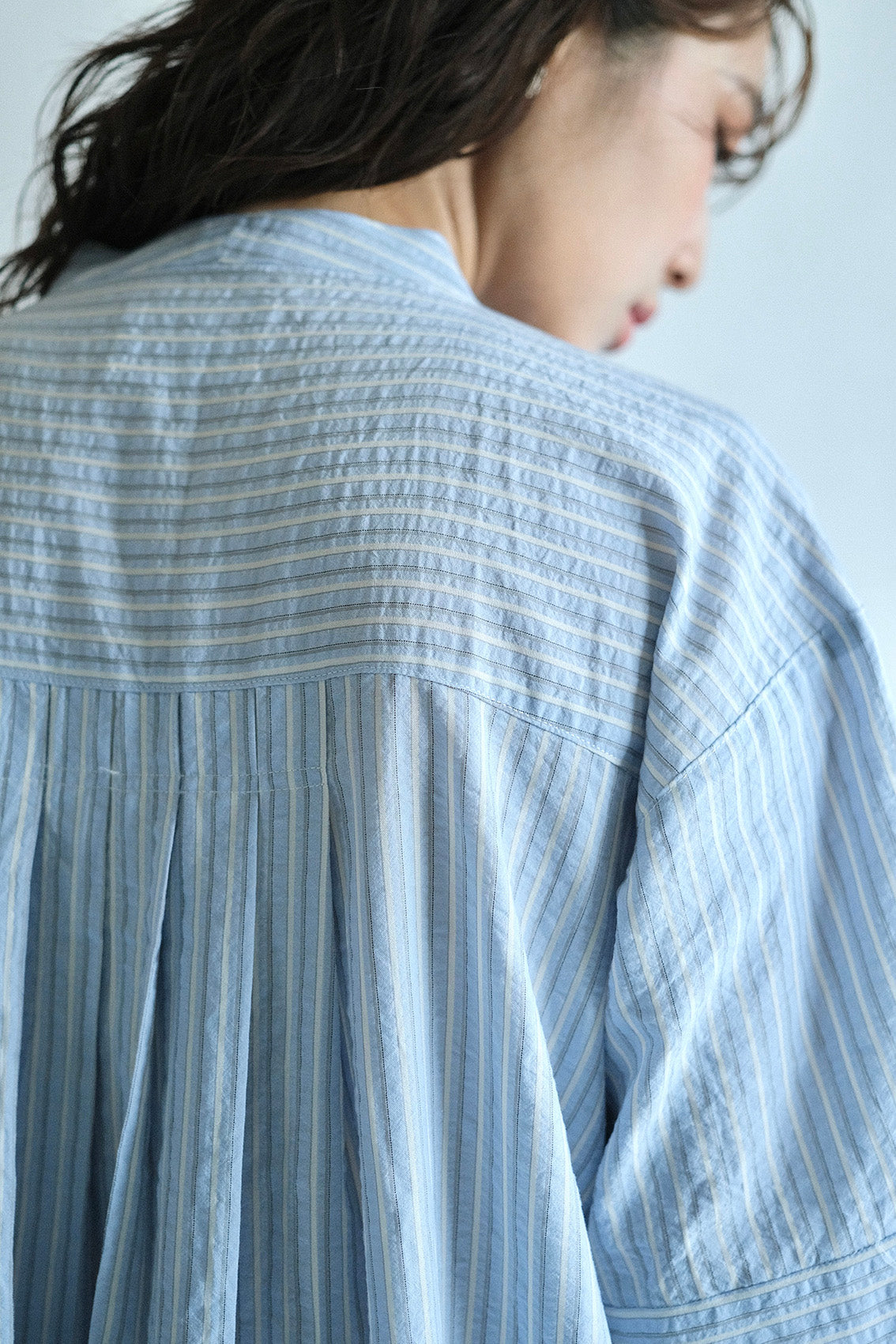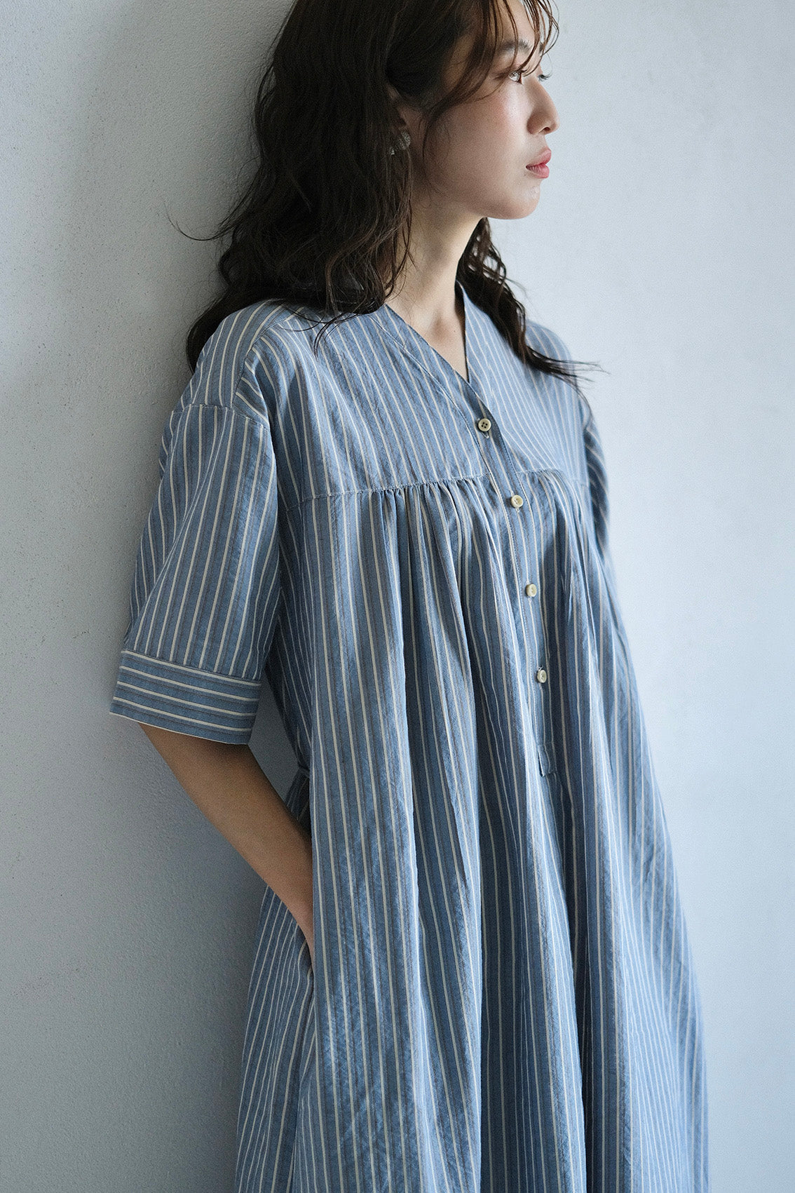 這款條紋面料為純棉混紡,具備抗皺特性,無論日常洗滌或摺疊收納都相當輕鬆,不需特別整燙,也能維持衣服本身的俐落質感。