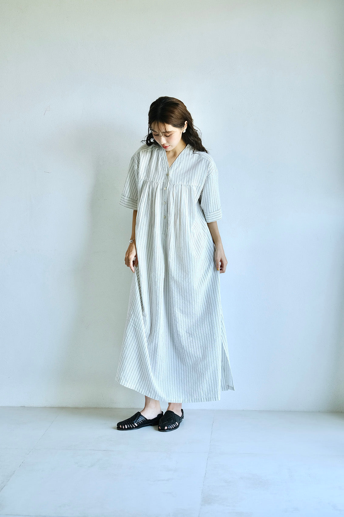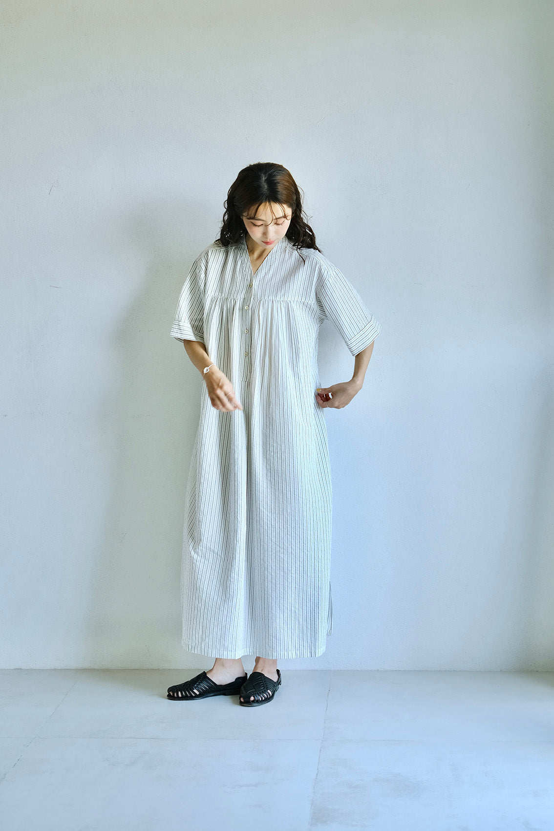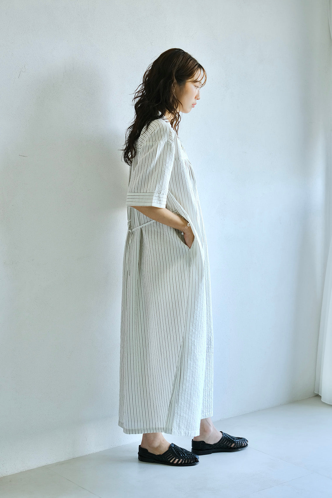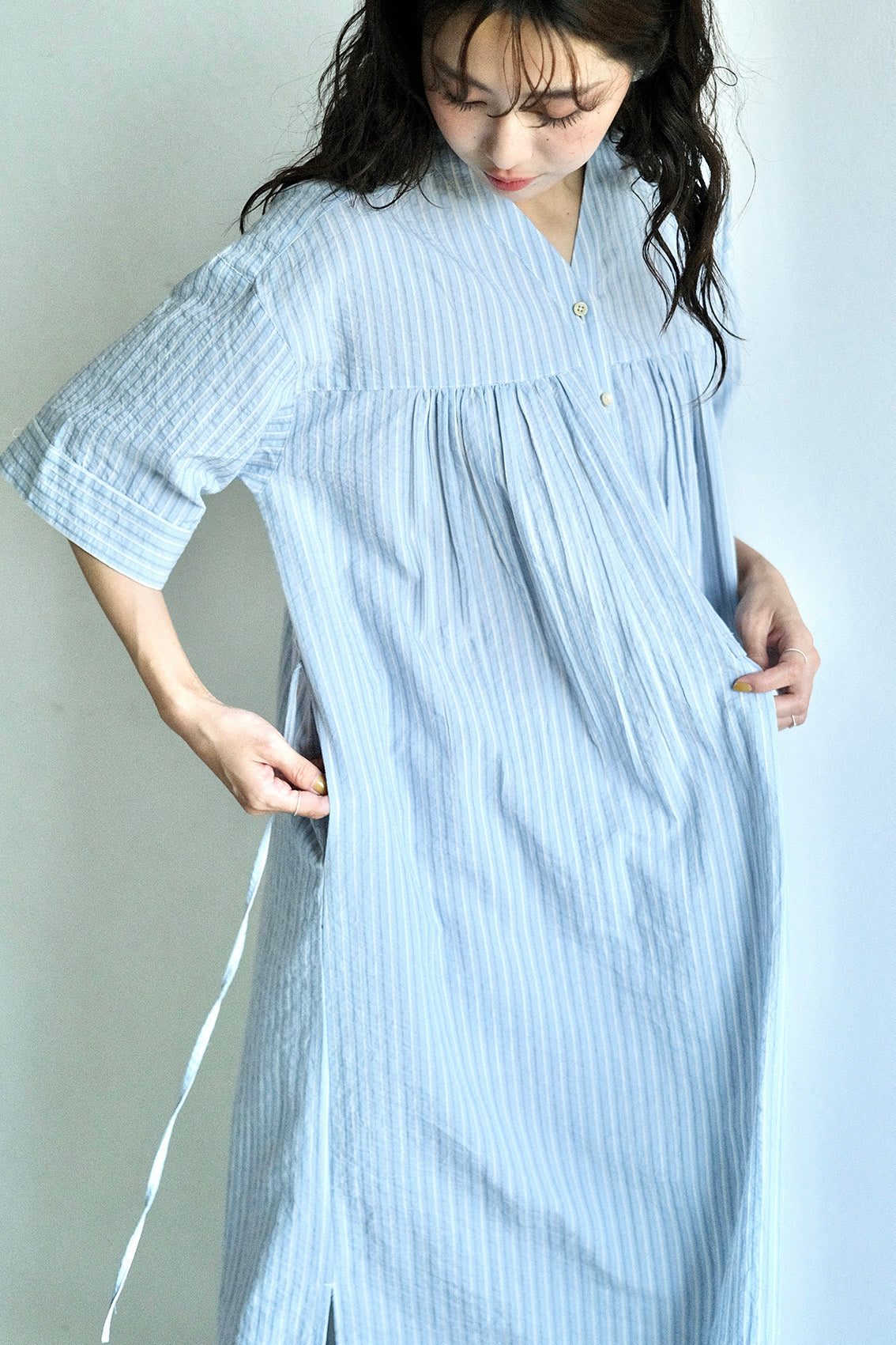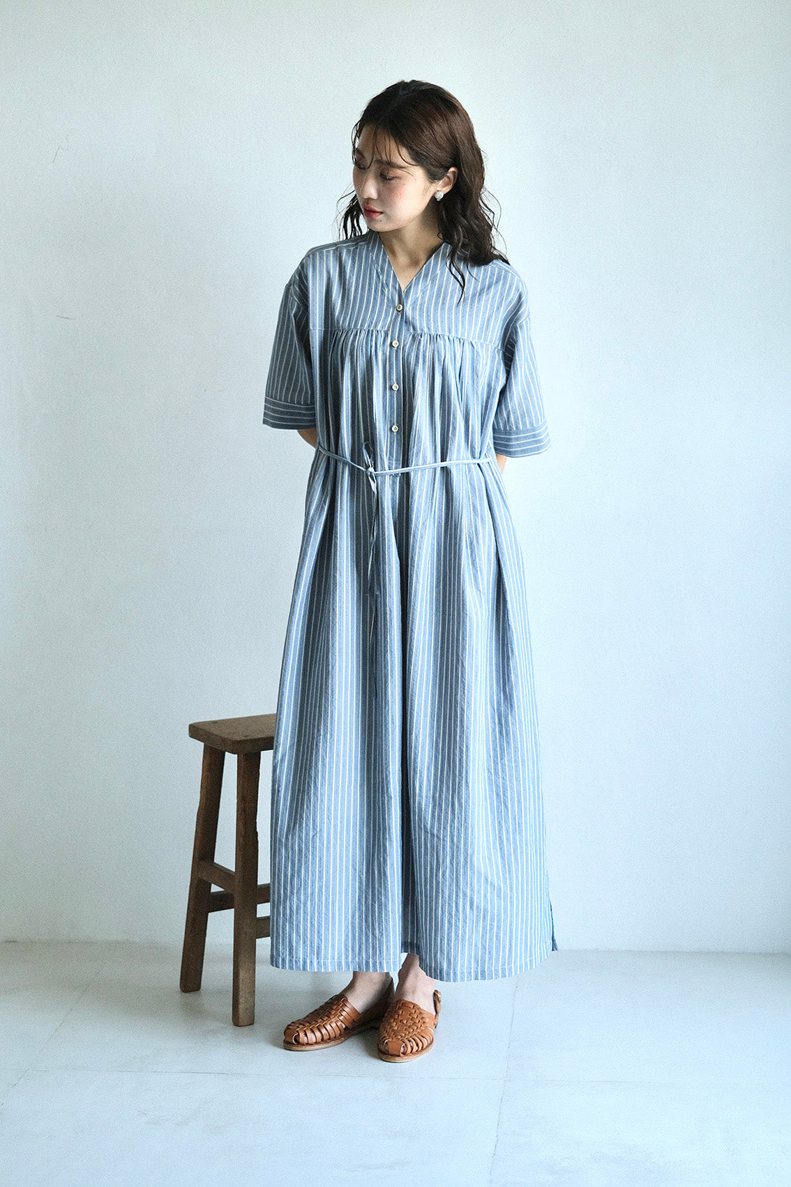 這款條紋面料為純棉混紡,具備抗皺特性,無論日常洗滌或摺疊收納都相當輕鬆,不需特別整燙,也能維持衣服本身的俐落質感。