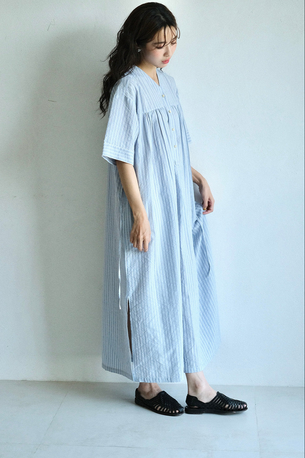 V領半開襟長洋裝 (4色)(抗皺)