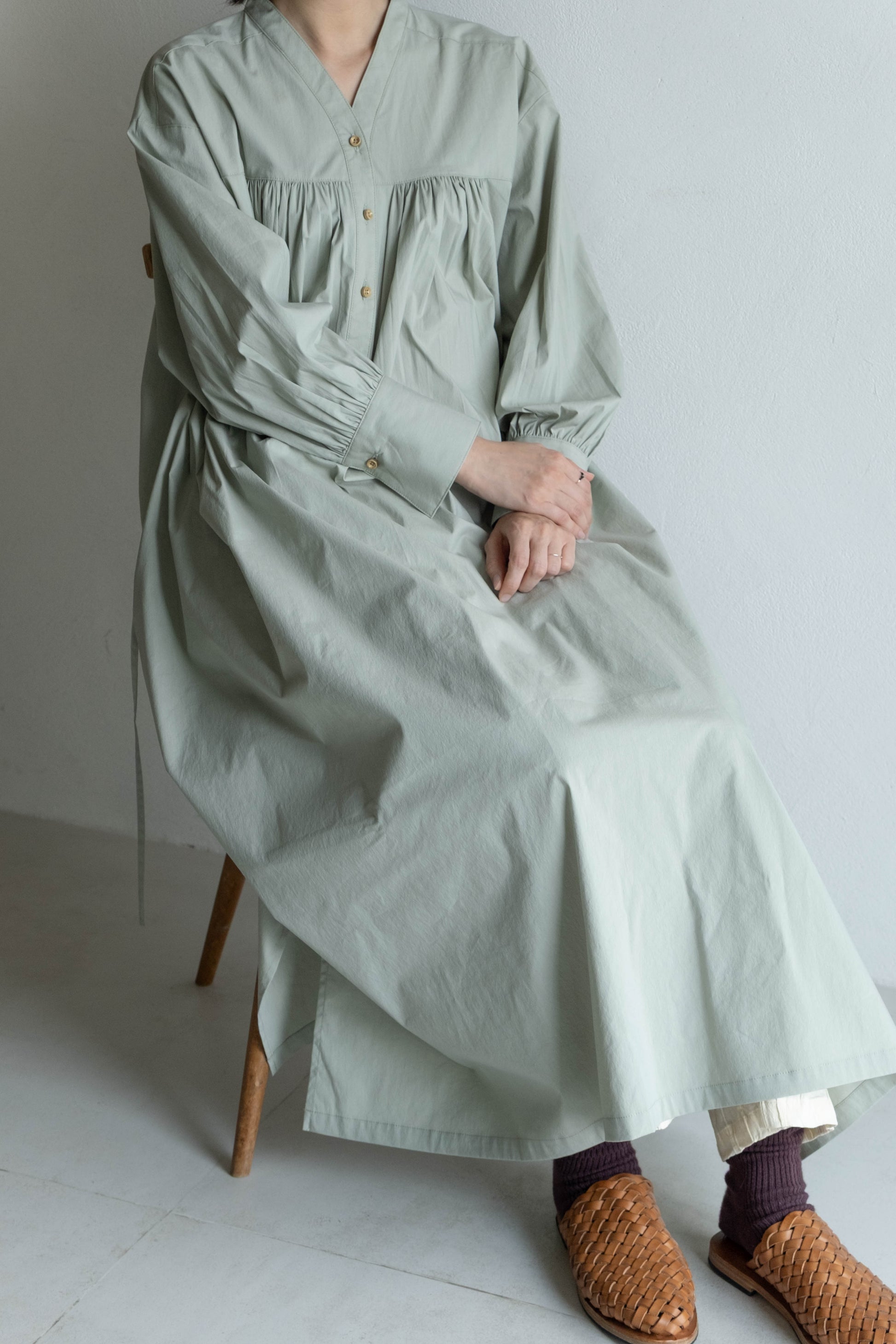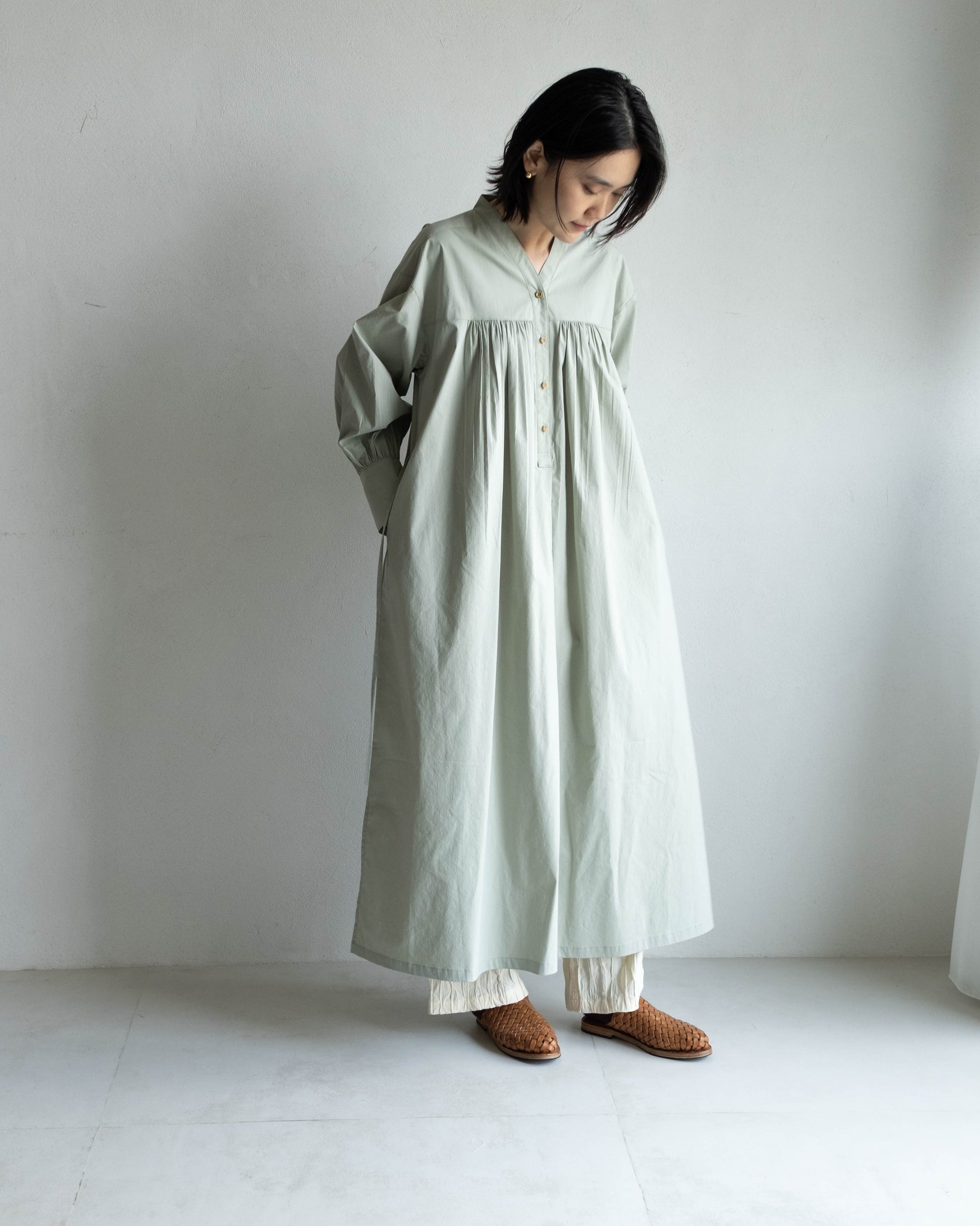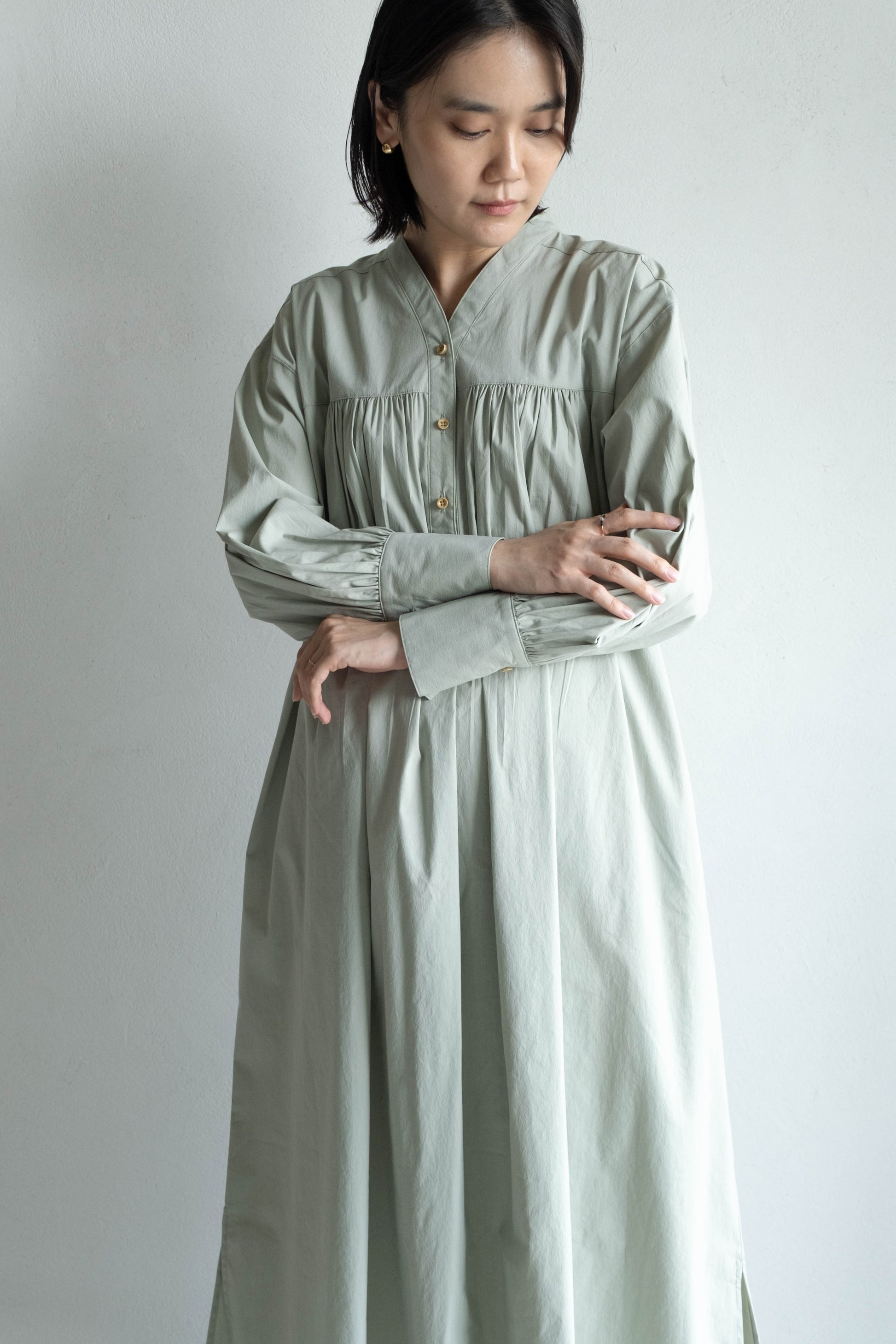 以立領延伸出的V領設計,修飾脖頸與臉部線條,使整體比例更加修長。前胸剪接處加入細緻的抽皺,讓裙擺展現自然的流動感與輕盈氣息。