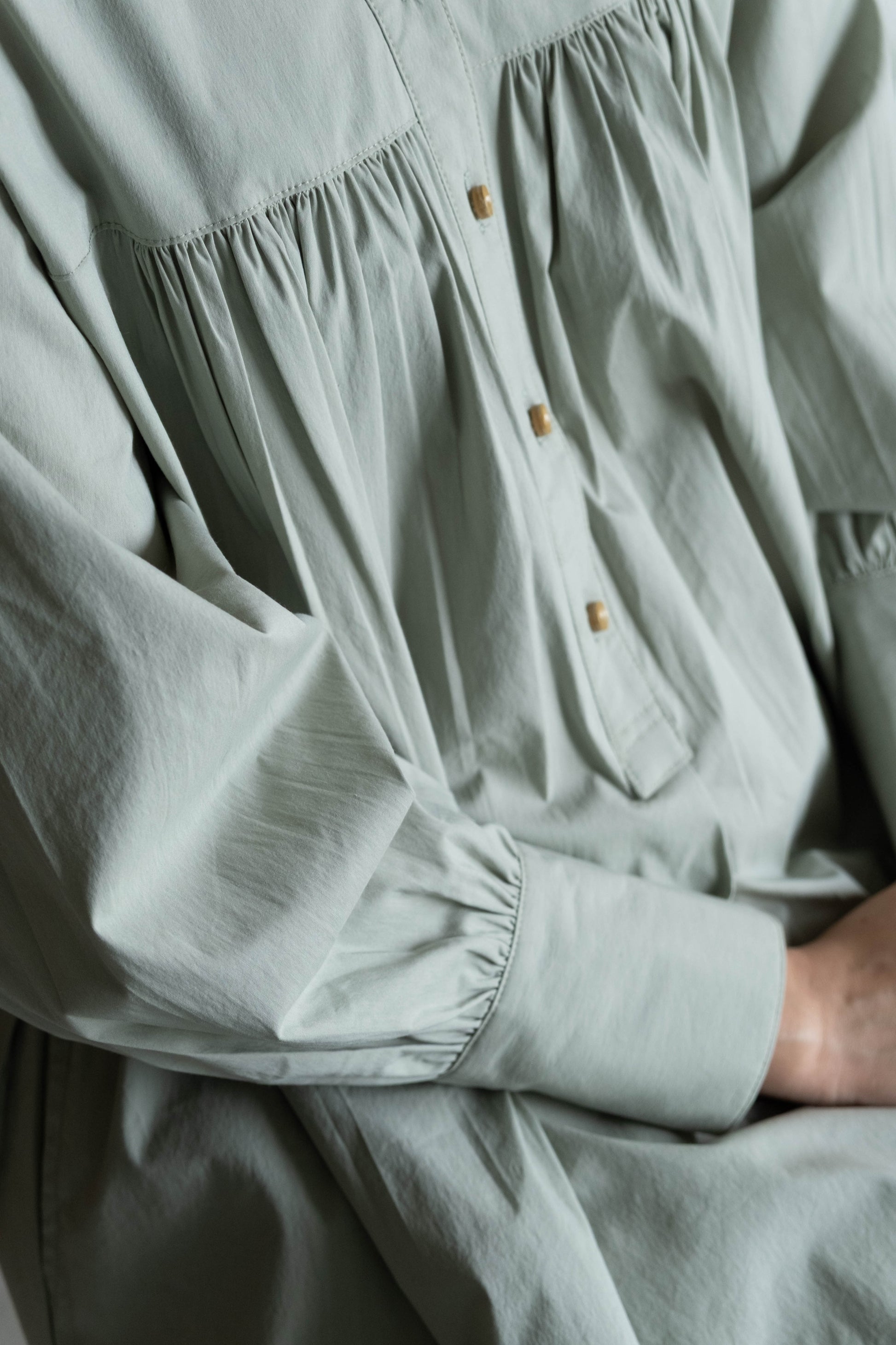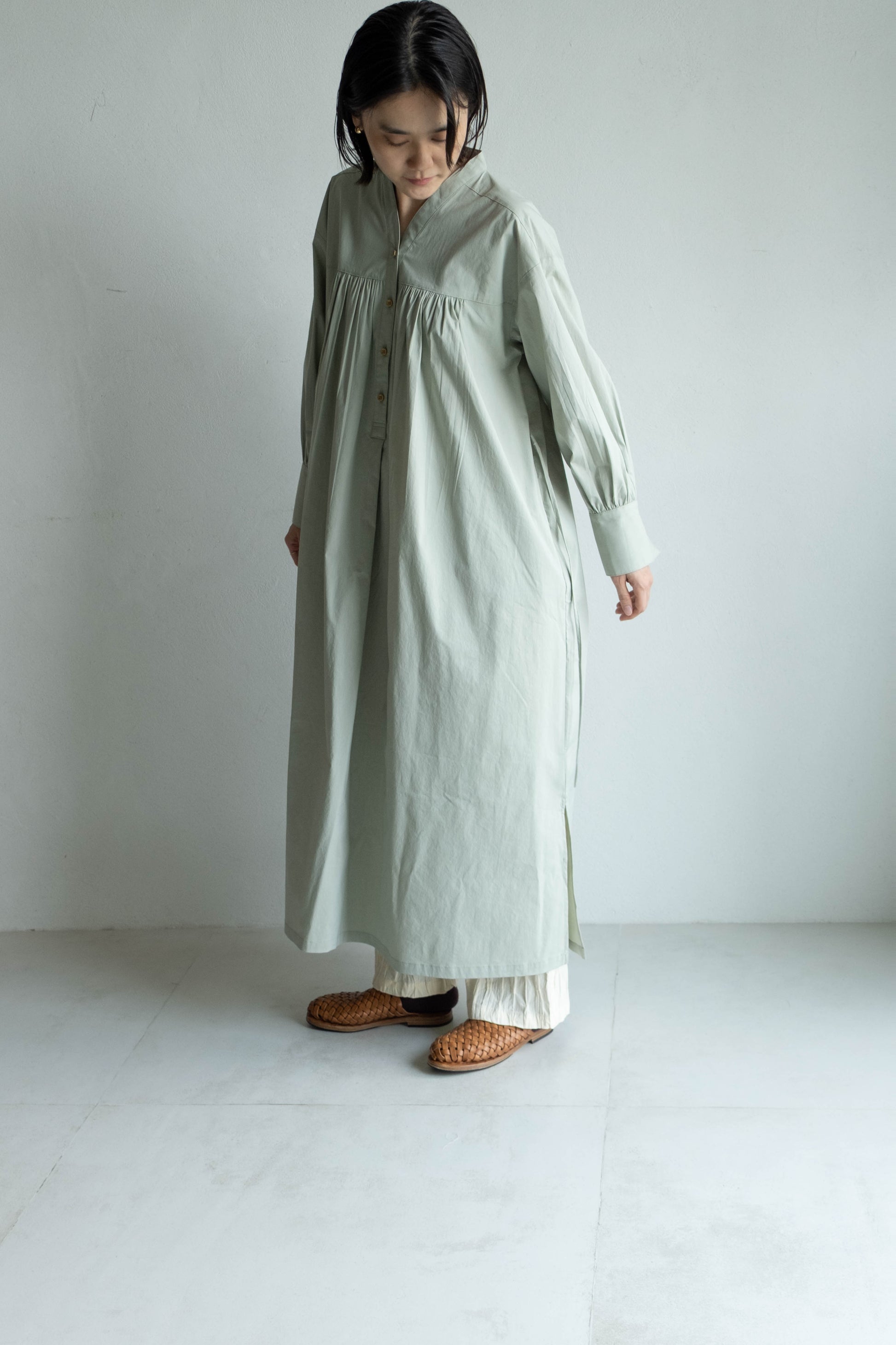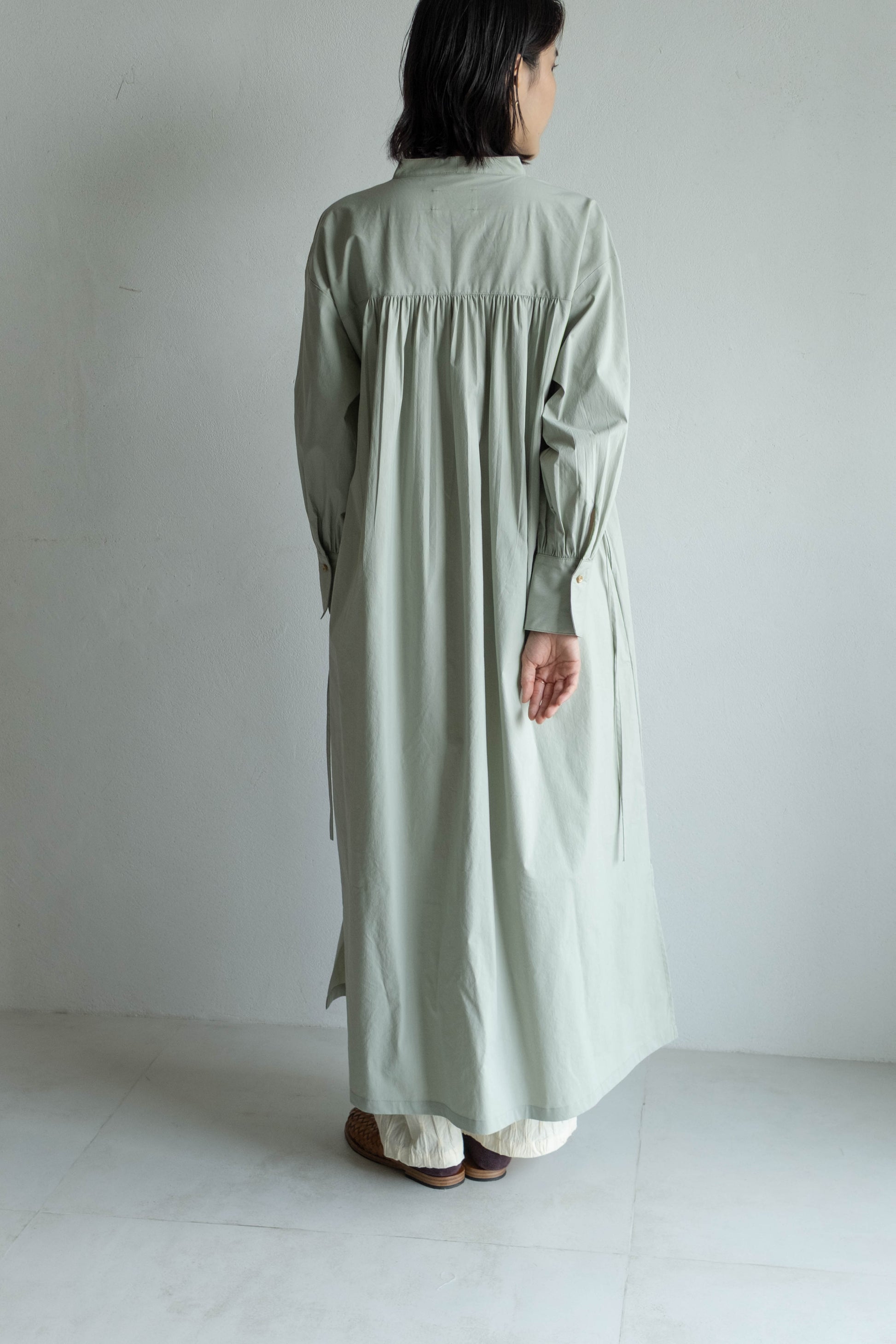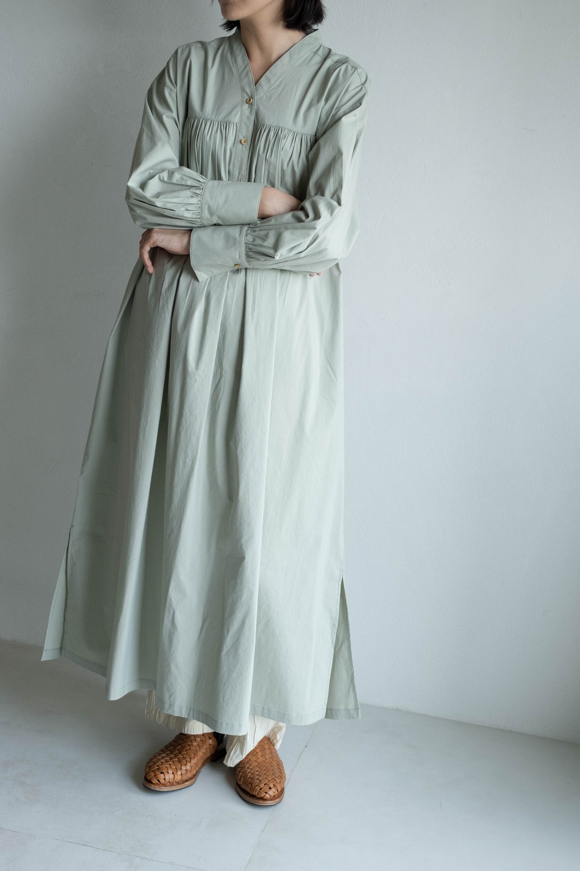 以立領延伸出的V領設計,修飾脖頸與臉部線條,使整體比例更加修長。前胸剪接處加入細緻的抽皺,讓裙擺展現自然的流動感與輕盈氣息。